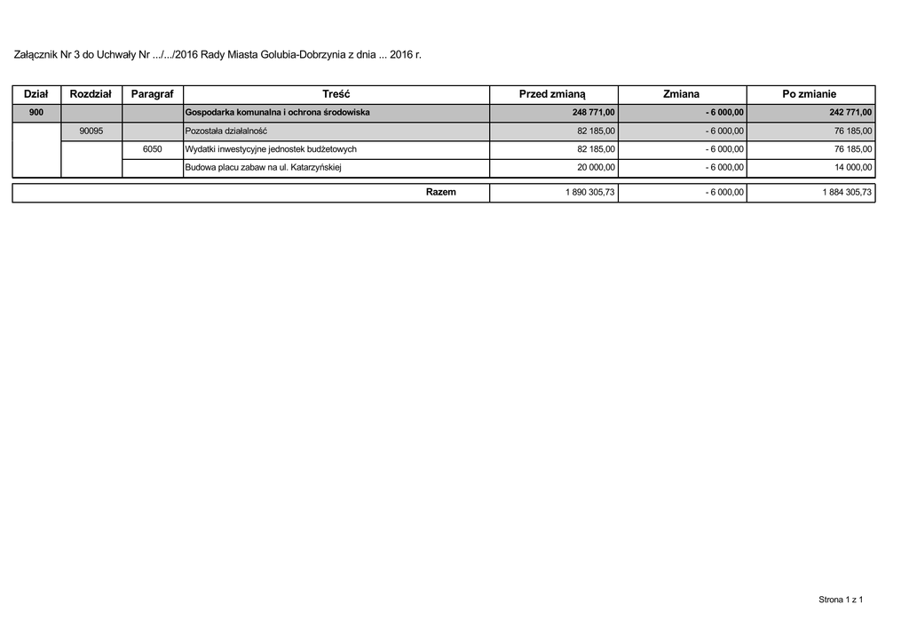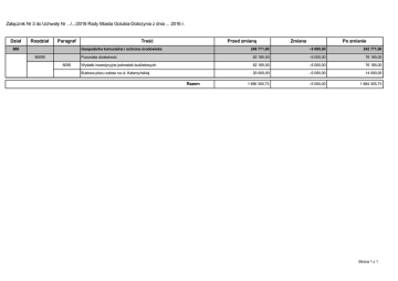 Załącznik Nr 3 do Uchwały Nr .../.../2016 Rady Miasta Golubia-Dobrzynia z dnia ... 2016 r. Dział 900 Rozdział 90095 Paragraf 6050 Treść Przed zmianą Gospodarka komunalna i ochrona środowiska 248 771,00 Pozostała działalność 82 185,00 Wydatki inwestycyjne jednostek budżetowych 82 185,00 Budowa placu zabaw na ul. Katarzyńskiej 20 000,00 Razem 1 890 305,73 Zmiana - 6 000,00 - 6 000,00 - 6 000,00 - 6 000,00 - 6 000,00 Po zmianie 242 771,00 76 185,00 76 185,00 14 000,00 1 884 305,73 Strona 1 z 1