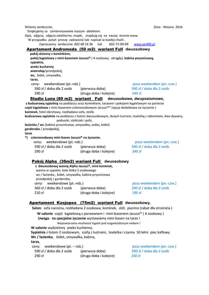 Witamy serdecznie, Zima - Wiosna 2016 Dziękujemy za zainteresowanie naszym obiektem. Opis, zdjęcia, zdjęcia satelitarne, mapki, znajdują się na naszej stronie www. W przypadku pytań proszę zadzwonić lub napisać w każdej chwili . Zapraszamy serdecznie 602 68 14 36 lub 602-72-00-99 www.jar400.pl Apartament Andromeda (50 m2) wariant Full dwuosobowy pokój dzienny z kominkiem, pokój kąpielowy z mini-basenem Jacuzzi® ( 4 osobowy, okrągły), kabina prysznicową, sypialnia, aneks kuchenny wiatrołap/przedpokój, wc, bidet, umywalka, taras, ceny: weekendowe (pt.-ndz.) poza weekendem (pn.-czw.) 590 zł / doba dla 2 osób (pierwsza doba) 590 zł / doba dla 2 osób 290 zł (druga doba i kolejne) 240 zł Studio Luna (80 m2) wariant Full dwuosobowe, dwupoziomowe, z buduarową sypialnią na poddaszu oraz kominkiem, tarasem i pokojem kąpielowym na parterze część kąpielowa z mini-basenem czteroosobowym Jacuzzi®* (opcja dodatkowa na życzenie ) kominek, fotel obrotowy, rozkładana sofa, stolik. buduarowa sypialnia na poddaszu z łożem dwuosobowym, dużym lustrem, toaletką z taboretem, dwa dywany, poduszki, stoliczek i pufy. łazienka / wc (kabina prysznicowa, umywalka, sedes, bidet) garderoba / przedpokój, taras *) czteroosobowy mini-basen Jacuzzi® na życzenie. ceny: weekendowe (pt.-ndz.) 590 zł / doba dla 2 osób (pierwsza doba) 290 zł (druga doba i kolejne) Pokój Alpha (36m2) wariant Full poza weekendem (pn.-czw.) 590 zł / doba dla 2 osób 240 zł dwuosobowy z dwuosobową wanną Alpha Jacuzzi®, mini kominek, wanna w sypialni, koło łóżka 2 osobowego wc / łazienka , bidet, umywalka, kabina prysznicowa przedpokój / garderoba, ceny: weekendowe (pt.-ndz.) 360 zł / doba dla 2 osób (pierwsza doba) 210 zł (druga doba i kolejne) poza weekendem (pn.-czw.) 290 zł / doba dla 2 osób 190 zł Apartament Kasjopea (75m2) wariant Full dwuosobowy, Salon: sofa narożna, rozkładana 2 osobowa, kominek, stół, pianino (rabat dla stroiciela ) W salonie część kąpielową z parawanem i mini-basenem Jacuzzi® ( 4 osobowy ) Uwaga: na specjalne życzenie wystawiamy mini-basen na taras ! Niepowtarzalna możliwość kąpieli pod rozgwieżdżonym niebem ! W salonie wydzielony aneks kuchenny. Sypialnia z łożem 2 osobowym, szafą z lustrami, toaletka i czynny 50 letni piec kaflowy. Wc / łazienka, bidet, umywalka, kabina, taras, ceny: weekendowe (pt. – ndz.) poza weekendem (pn.-czw.) 590 zł / doba dla 2 osób (pierwsza doba) 590 zł / doba dla 2 osób 290 zł (druga doba i kolejne) 240 zł Na życzenie płatki róż, szampan lub wino musujące , taxi , helikopter, dostawa kwiatów, zestaw świec, kadzidełka, małe i duże czerwone serca na podłodze, zasłony tiulowe wokół mini-basenu, duże lustro, sztuczny śnieg, i wiele innych pomysłów i fantazji które zrealizuje konsjerż. Dla stałych Gości, Gości z polecenia, zakochanych , nowożeńców, studentów, singli, maturzystów, stroiciela pianina oraz w ofercie First Minute - rabat ! Na ewentualne pytania chętnie odpowiemy, proszę napisać / zadzwonić Apartament Andromeda, dla 2 osób, z mini-basenem Jacuzzi® (czteroosobowe okrągłe) i widokiem na Kopę Biskupią, sypialnia, aneks kuchenny, taras, Studio Luna dla 2 osób, z buduarową sypialnią na poddaszu, mini-basenem Jacuzzi® (4osobowym kwadratowy), kominkiem i tarasem na parterze. Pokój Alpha dla 2 osób, Apartament sypialnia z wanną Alpha Jacuzzi®(2osobową) i mini kominek, Kasjopea dla 2 osób, z mini-basenem Jacuzzi® (4osobowym prostokątny) , kominkiem, aneksem kuchennym, sypialnią i tarasem Andromeda Kasjopea Andromeda Kasjopea