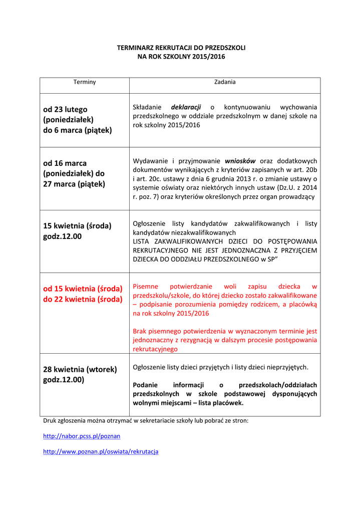 TERMINARZ REKRUTACJI DO PRZEDSZKOLI NA ROK SZKOLNY 2015/2016 Terminy Zadania od 23 lutego (poniedziałek) do 6 marca (piątek) Składanie deklaracji o kontynuowaniu wychowania przedszkolnego w oddziale przedszkolnym w danej szkole na rok szkolny 2015/2016 od 16 marca (poniedziałek) do 27 marca (piątek) Wydawanie i przyjmowanie wniosków oraz dodatkowych dokumentów wynikających z kryteriów zapisanych w art. 20b i art. 20c. ustawy z dnia 6 grudnia 2013 r. o zmianie ustawy o systemie oświaty oraz niektórych innych ustaw (Dz.U. z 2014 r. poz. 7) oraz kryteriów określonych przez organ prowadzący 15 kwietnia (środa) godz.12.00 Ogłoszenie listy kandydatów zakwalifikowanych i listy kandydatów niezakwalifikowanych LISTA ZAKWALIFIKOWANYCH DZIECI DO POSTĘPOWANIA REKRUTACYJNEGO NIE JEST JEDNOZNACZNA Z PRZYJĘCIEM DZIECKA DO ODDZIAŁU PRZEDSZKOLNEGO w SP” od 15 kwietnia (środa) do 22 kwietnia (środa) Pisemne potwierdzanie woli zapisu dziecka w przedszkolu/szkole, do której dziecko zostało zakwalifikowane – podpisanie porozumienia pomiędzy rodzicem, a placówką na rok szkolny 2015/2016 Brak pisemnego potwierdzenia w wyznaczonym terminie jest jednoznaczny z rezygnacją w dalszym procesie postępowania rekrutacyjnego 28 kwietnia (wtorek) godz.12.00) Ogłoszenie listy dzieci przyjętych i listy dzieci nieprzyjętych. Podanie informacji o przedszkolach/oddziałach przedszkolnych w szkole podstawowej dysponujących wolnymi miejscami – lista placówek. Druk zgłoszenia można otrzymać w sekretariacie szkoły lub pobrać ze stron: http://nabor.pcss.pl/poznan http://www.poznan.pl/oswiata/rekrutacja