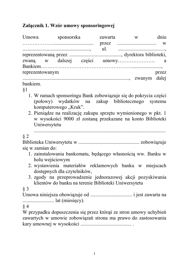Załącznik 1. Wzór umowy sponsoringowej Umowa sponsorska zawarta w dniu ………………................................ przez ............................... w ....................................................., ul. ....................................., reprezentowaną przez ........................................., dyrektora biblioteki, zwaną w dalszej części umowy…………………. a Bankiem………………………………………………......................., reprezentowanym przez ...................................................................................., zwanym dalej bankiem. §1 1. W ramach sponsoringu Bank zobowiązuje się do pokrycia części (połowy) wydatków na zakup bibliotecznego systemu komputerowego „Kruk”. 2. Pieniądze na realizację zakupu sprzętu wymienionego w pkt. 1 w wysokości 9000 zł zostaną przekazane na konto Biblioteki Uniwersytetu ........................................................................................................ §2 Biblioteka Uniwersytetu w ................................................ zobowiązuje się w zamian do: 1. zainstalowania bankomatu, będącego własnością ww. Banku w holu wejściowym 2. wystawienia materiałów reklamowych banku w miejscach dostępnych dla czytelników, 3. zgody na przeprowadzenie jednorazowej akcji pozyskiwania klientów do banku na terenie Biblioteki Uniwersytetu §3 Umowa niniejsza obowiązuje od ................................. i jest zawarta na ......................... lat (miesięcy). §4 W przypadku dopuszczenia się przez którąś ze stron umowy uchybień zawartych w umowie zobowiązań strona ma prawo do zastosowania kary umownej w wysokości ........................................ . 1 ............................................. (Biblioteka) ........................................ (Bank) Od redakcji: jest to uproszczony wzór umowy, zawierający minimum warunków z obydwu stron. W zależności od sytuacji umowa powinna być uzupełniona o dodatkowe postanowienia i zawsze konsultowana z prawnikami. 2