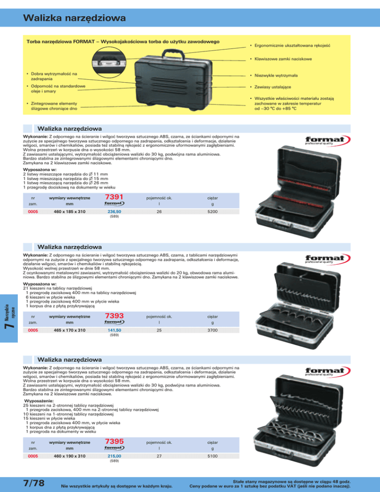 Walizka narzędziowa Torba narzędziowa FORMAT – Wysokojakościowa torba do użytku zawodowego • Ergonomicznie ukształtowana rękojeść • Klawiszowe zamki naciskowe • Dobra wytrzymałość na zadrapania • Niezwykle wytrzymała • Odporność na standardowe oleje i smary • Zawiasy ustalające • Wszystkie właściwości materiału zostają zachowane w zakresie temperatur od –30 °C do +85 °C • Zintegrowane elementy ślizgowe chroniące dno Walizka narzędziowa Wykonanie: Z odpornego na ścieranie i wilgoć tworzywa sztucznego ABS, czarna, ze ściankami odpornymi na zużycie ze specjalnego tworzywa sztucznego odpornego na zadrapania, odkształcenia i deformacje, działanie wilgoci, smarów i chemikaliów, posiada też stabilną rękojeść z ergonomicznie uformowanymi zagłębieniami. Wolna przestrzeń w korpusie dna o wysokości 58 mm. Z zawiasami ustalającymi, wytrzymałość obciążeniowa walizki do 30 kg, podwójna rama aluminiowa. Bardzo stabilna ze zintegrowanymi ślizgowymi elementami chroniącymi dno. Zamykana na 2 klawiszowe zamki naciskowe. Wyposażona w: 2 listwy mieszczące narzędzia do ∅ 11 mm 1 listwę mieszczącą narzędzia do ∅ 15 mm 1 listwę mieszczącą narzędzia do ∅ 26 mm 1 przegrodę dociskową na dokumenty w wieku nr zam. wymiary wewnętrzne mm 0005 460 x 185 x 310 7391 pojemność ok. l ciężar g 236,50 26 5200 (589) Walizka narzędziowa 7 Narzędzia ręczne Wykonanie: Z odpornego na ścieranie i wilgoć tworzywa sztucznego ABS, czarna, z tablicami narzędziowymi odpornymi na zużycie z specjalnego tworzywa sztucznego odpornego na zadrapania, odkształcenia i deformacje, działanie wilgoci, smarów i chemikaliów i stabilną rękojeścią. Wysokość wolnej przestrzeń w dnie 58 mm. Z ocynkowanymi metalowymi zawiasami, wytrzymałość obciążeniowa walizki do 20 kg, obwodowa rama aluminiowa. Bardzo stabilna ze ślizgowymi elementami chroniącymi dno. Zamykana na 2 klawiszowe zamki naciskowe. Wyposażona w: 21 kieszeni na tablicy narzędziowej 1 przegrodę zaciskową 400 mm na tablicy narzędziowej 6 kieszeni w płycie wieka 1 przegrodę zaciskową 400 mm w płycie wieka 1 korpus dna z płytą przykrywającą nr zam. wymiary wewnętrzne mm 0005 465 x 170 x 310 7393 pojemność ok. l ciężar g 141,50 25 3700 (589) Walizka narzędziowa Wykonanie: Z odpornego na ścieranie i wilgoć tworzywa sztucznego ABS, czarna, ze ściankami odpornymi na zużycie ze specjalnego tworzywa sztucznego odpornego na zadrapania, odkształcenia i deformacje, działanie wilgoci, smarów i chemikaliów, posiada też stabilną rękojeść z ergonomicznie uformowanymi zagłębieniami. Wolna przestrzeń w korpusie dna o wysokości 58 mm. Z zawiasami ustalającymi, wytrzymałość obciążeniowa walizki do 30 kg, podwójna rama aluminiowa. Bardzo stabilna ze zintegrowanymi ślizgowymi elementami chroniącymi dno. Zamykana na 2 klawiszowe zamki naciskowe. Wyposażenie: 25 kieszeni na 2-stronnej tablicy narzędziowej 1 przegroda zaciskowa, 400 mm na 2-stronnej tablicy narzędziowej 10 kieszeni na 1-stronnej tablicy narzędziowej 15 kieszeni w płycie wieka 1 przegroda zaciskowa 400 mm, w płycie wieka 1 korpus dna z płytą przykrywającą 1 przegroda na dokumenty w wieku nr zam. wymiary wewnętrzne mm 0005 460 x 190 x 310 7395 pojemność ok. l ciężar g 215,00 27 5100 (589) 7/78 Nie wszystkie artykuły są dostępne w każdym kraju. Stałe stany magazynowe są dostępne w ciągu 48 godz. Ceny podane w euro za 1 sztukę bez podatku VAT (jeśli nie podano inaczej). Walizka narzędziowa Walizka narzędziowa Wykonanie: Z odpornego na ścieranie i wilgoć tworzywa sztucznego ABS, czarna, z tablicami narzędziowymi odpornymi na zużycie ze specjalnego tworzywa sztucznego odpornego na zadrapania, odkształcenia i deformacje, działanie wilgoci, smarów i chemikaliów, posiada też stabilną rękojeść z ergonomicznie uformowanymi zagłębieniami. Przestrzeń w korpusie dna o wysokości 88 mm, dowolnie podzielna Z ustalającymi zawiasami, wytrzymałość obciążeniowa walizki do 30 kg, wewnętrzna podwójna rama aluminiowa. Bardzo stabilna ze zintegrowanymi ślizgowymi elementami chroniącymi dno. Zamykana na 2 klawiszowe zamki naciskowe. Wyposażona w: 1 listwę mieszczącą narzędzia do ∅ 11 mm 1 listwę mieszczącą narzędzia do ∅ 15 mm 1 listwę mieszczącą narzędzia do ∅ 26 mm 1 korpus dna z płytą przykrywającą 1 przegrodę dociskową na dokumenty w wieku nr zam. wymiary wewnętrzne mm 0005 470 x 205 x 355 7388 pojemność ok. l ciężar g 231,00 34 5700 (589) Walizka narzędziowa Wykonanie: Z odpornego na ścieranie i wilgoć tworzywa sztucznego ABS, czarna, z tablicami narzędziowymi odpornymi na zużycie ze specjalnego tworzywa sztucznego odpornego na zadrapania, odkształcenia i deformacje, działanie wilgoci, smarów i chemikaliów, posiada też stabilną rękojeść z ergonomicznie uformowanymi zagłębieniami. Przestrzeń w korpusie dna o wysokości 88 mm, dowolnie podzielna. Z ustalającymi zawiasami, wytrzymałość obciążeniowa walizki do 30 kg, wewnętrzna podwójna rama aluminiowa. Bardzo stabilna ze zintegrowanymi ślizgowymi elementami chroniącymi dno. Zamykana na 2 klawiszowe zamki naciskowe Wyposażenie: 25 kieszeni na 2-stronnej tablicy narzędziowej 1 przegroda zaciskowa 400 mm na 2-stronnej tablicy narzędziowej 15 kieszeni w płycie wieka i 1 przegroda zaciskowa 400 mm w płycie wieka 1 korpus dna z płytą przykrywającą 1 przegroda zaciskowa na dokumenty w wieku nr zam. wymiary wewnętrzne mm 0005 470 x 200 x 360 7390 pojemność ok. l ciężar g 221,50 34 5000 7 Narzędzia ręczne (589) Uniwersalny zestaw narzędziowy, 43-częściowy Wyposażony w narzędzia do codziennej pracy FORMAT. Ten oraz inne zestawy narzędziowe są dostępne od str. Ç 6/56. Ç 6/57 Artykuły oznaczone znakiem ◊ nie są w magazynie. Zakup tych artykułów realizowany jest w krótkim terminie. Nie wszystkie artykuły są dostępne w każdym kraj