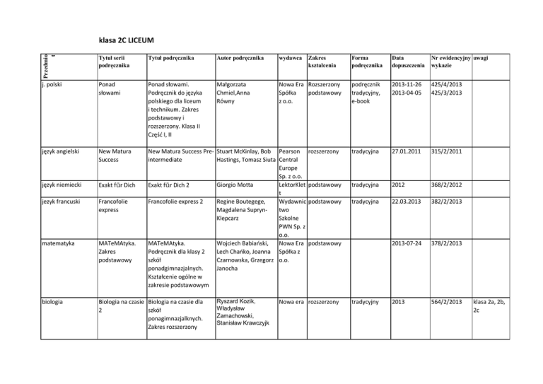 Przedmio t klasa 2C LICEUM Tytuł serii podręcznika Tytuł podręcznika Autor podręcznika wydawca j. polski Ponad słowami Ponad słowami. Podręcznik do języka polskiego dla liceum i technikum. Zakres podstawowy i rozszerzony. Klasa II Część I, II Małgorzata Chmiel,Anna Równy Nowa Era Rozszerzony Spółka podstawowy z o.o. język angielski New Matura Success język niemiecki Exakt für Dich jezyk francuski Francofolie express matematyka MATeMAtyka. Zakres podstawowy New Matura Success Pre- Stuart McKinlay, Bob Pearson intermediate Hastings, Tomasz Siuta Central Europe Sp. z o.o. Giorgio Motta LektorKlet Exakt für Dich 2 t Francofolie express 2 Regine Boutegege, Wydawnic Magdalena Supryntwo Klepcarz Szkolne PWN Sp. z o.o. MATeMAtyka. Wojciech Babiański, Nowa Era Podręcznik dla klasy 2 Lech Chańko, Joanna Spółka z szkół Czarnowska, Grzegorz o.o. ponadgimnazjalnych. Janocha Kształcenie ogólne w zakresie podstawowym biologia Biologia na czasie Biologia na czasie dla 2 szkół ponagimnazjalknych. Zakres rozszerzony Ryszard Kozik, Władysław Zamachowski, Stanisław Krawczyjk Zakres kształcenia Forma podręcznika Data dopuszczenia Nr ewidencyjny uwagi wykazie podręcznik tradycyjny, e-book 2013-11-26 2013-04-05 425/4/2013 425/3/2013 rozszerzony tradycyjna 27.01.2011 315/2/2011 podstawowy tradycyjna 2012 368/2/2012 podstawowy tradycyjna 22.03.2013 382/2/2013 2013-07-24 378/2/2013 2013 564/2/2013 podstawowy Nowa era rozszerzony tradycyjny klasa 2a, 2b, 2c geografia Oblicza geografii Oblicza geografii cz. 1 i cz. 1 - R. Malarz, M. cz. 2- zakres rozszerzony; Więckowski. Cz. 2 Tomasz Rachwał Nowa Era rozszerzony podręcznik tradycyjny 2015 historia i społeczeństwo historia i społeczeństwo religia Poznać przeszłość Poznać przeszłość 2015-01-16 Ojczysty panteon i ojczyste spory Rządzący i rządzeni T.Maćkows-ki Nowa Era podstawowy tradycyjna 2013-06-27 659/1/2014 I.Janicka Nowa Era podstawowy tradycyjna 2014-01-29 659/2/2014 Świadczę o Jezusie w świecie Ks.R.Strus, ks. W. Galant Gaudium podstawowy tradycyjna 2013-05-06 AZ-42-01/10LU-4 /13