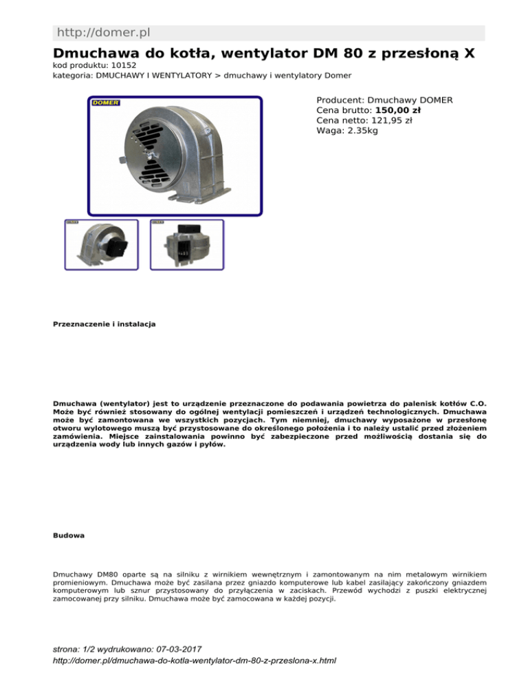 Dmuchawa do kotła, wentylator DM 80 z przesłoną X