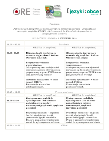 Program Jak rozwijać kompetencje różnojęzyczne i międzykulturowe – prezentacja narzędzi projektu FREPA (A Framework for Pluralistic Approaches to Languages and Cultures) SULEJÓWEK SOBOTA 6 KWIETNIA 2013 08.00 – 09.00 Śniadanie GRUPA 1 ( ang/fran) 09.00- 10.45 10.45 – 11.00 11.00-12.30 Różnorodność językowa w uczeniu się jezyków i kultur: Otwarcie na języki Różnorodność językowa w uczeniu się jezyków i kultur: Otwarcie na języki Rozgrzewka: ćwiczenia wprowadzające. Jakie postawy oraz umiejetności rozwijane są dzięki aktywnościom proponowanym przez FREPA oraz jaką zdobywa się wiedzę? Rozgrzewka: ćwiczenia wprowadzające. Jakie postawy oraz umiejetności rozwijane są dzięki aktywnościom proponowanym przez FREPA oraz jaką zdobywa się wiedzę? Materiały dydaktyczne w bazie danych FREPA. Prezentacja materiałów polskojęzycznych. Materiały dydaktyczne w bazie danych FREPA. Prezentacja materiałów polskojęzycznych. Przerwa na kawę GRUPA 1 ( ang/fran) GRUPA 2 ( ang/niem) Zintegrowane podejście Zintegrowane podejście dydaktyczne: Jak znaleźć dydaktyczne: Jak znaleźć podobieństwa między podobieństwa między nauczanymi językami i językiem nauczanymi językami i polskim? językiem polskim? Przykłady: francuski – angielski Języki słowiańskie/ języki germańskie/ języki romańskie Praca w grupach: przygotowanie zadań do wykorzystania w klasie. 12.30 – 14.00 GRUPA 2 ( ang/niem) Przykłady: niemiecki – angielski Języki słowiańskie/ języki germańskie/ języki romańskie Praca w grupach: przygotowanie zadań do wykorzystania w klasie. Obiad 14:00 – 15:30 GRUPA 1 ( ang/fran) (A propos języków romańskich) Interkomprehensja i języki pokrewne. GRUPA 2 ( ang/niem) (A propos języków słowiańskich) Interkomprehensja i języki pokrewne. Przerwa na kawę 15:30 - 15:45 Podsumowanie warsztatów 15:45 – 16:45