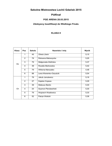 Szkolne Mistrzostwa Lechii Gdańsk 2015 Półfinał PGE ARENA 28.03.2015 Zdobywcy kwalifikacji do Wielkiego Finału KLASA II Klasa Poz Szkoła Nazwisko i imię Wynik 1 45 Oliwia Litwin 5,15 2 79 Roksana Maluszycka 5,25 3 79 Małgorzata Zielińska 5,37 4 39 Rozalia Markowska 5,42 5 79 Wiktoria Marszalec 4,48 6 88 Lena Weremko-Oszuścik 5,54 1 79 Jakub Janulewicz 5,16 2 27 Kajetan Kujawa 5,29 3 39 Mateusz Bardo 5,30 4 24 Szymon Pierzlawiński 5,30 5 79 Wojciech Wasiłowicz 5,33 6 52 Patryk Wielicki 5,36 Dz Ch