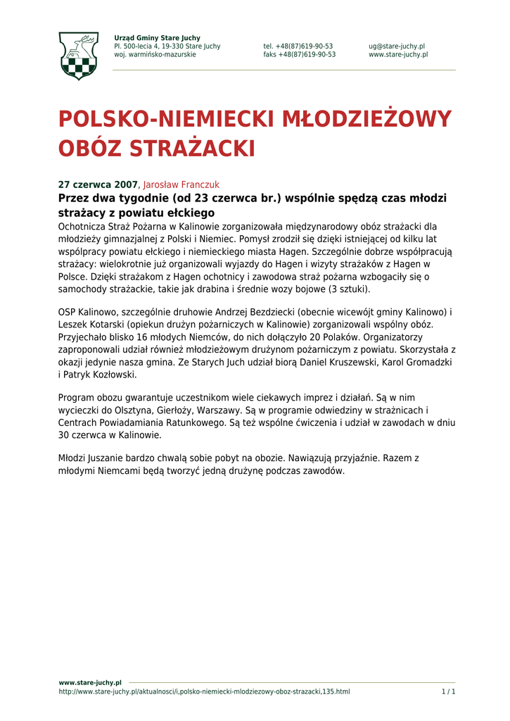 Urząd Gminy Stare Juchy Pl. 500-lecia 4, 19-330 Stare Juchy woj. warmińsko-mazurskie tel. +48(87)619-90-53 faks +48(87)619-90-53 [email protected] www.stare-juchy.pl POLSKO-NIEMIECKI MŁODZIEŻOWY OBÓZ STRAŻACKI 27 czerwca 2007, Jarosław Franczuk Przez dwa tygodnie (od 23 czerwca br.) wspólnie spędzą czas młodzi strażacy z powiatu ełckiego Ochotnicza Straż Pożarna w Kalinowie zorganizowała międzynarodowy obóz strażacki dla młodzieży gimnazjalnej z Polski i Niemiec. Pomysł zrodził się dzięki istniejącej od kilku lat wspólpracy powiatu ełckiego i niemieckiego miasta Hagen. Szczególnie dobrze współpracują strażacy: wielokrotnie już organizowali wyjazdy do Hagen i wizyty strażaków z Hagen w Polsce. Dzięki strażakom z Hagen ochotnicy i zawodowa straż pożarna wzbogaciły się o samochody strażackie, takie jak drabina i średnie wozy bojowe (3 sztuki). OSP Kalinowo, szczególnie druhowie Andrzej Bezdziecki (obecnie wicewójt gminy Kalinowo) i Leszek Kotarski (opiekun drużyn pożarniczych w Kalinowie) zorganizowali wspólny obóz. Przyjechało blisko 16 młodych Niemców, do nich dołączyło 20 Polaków. Organizatorzy zaproponowali udział również młodzieżowym drużynom pożarniczym z powiatu. Skorzystała z okazji jedynie nasza gmina. Ze Starych Juch udział biorą Daniel Kruszewski, Karol Gromadzki i Patryk Kozłowski. Program obozu gwarantuje uczestnikom wiele ciekawych imprez i działań. Są w nim wycieczki do Olsztyna, Gierłoży, Warszawy. Są w programie odwiedziny w strażnicach i Centrach Powiadamiania Ratunkowego. Są też wspólne ćwiczenia i udział w zawodach w dniu 30 czerwca w Kalinowie. Młodzi Juszanie bardzo chwalą sobie pobyt na obozie. Nawiązują przyjaźnie. Razem z młodymi Niemcami będą tworzyć jedną drużynę podczas zawodów. www.stare-juchy.pl http://www.stare-juchy.pl/aktualnosci/i,polsko-niemiecki-mlodziezowy-oboz-strazacki,135.html 1/1
