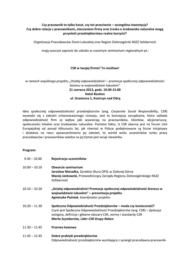 Czy pracownik to tylko koszt, czy też przeciwnie – szczególna inwestycja? Czy dobre relacje z pracownikami, otoczeniem firmy oraz troska o środowisko naturalne mogą przynieśd przedsiębiorstwu realne korzyści? Organizacja Pracodawców Ziemi Lubuskiej oraz Region Zielonogórski NSZZ Solidarnośd mają zaszczyt zaprosid do udziału w czwartym seminarium regionalnym pt.: CSR w twojej firmie? To możliwe! w ramach wspólnego projektu „Działaj odpowiedzialnie! – promocja społecznej odpowiedzialności biznesu w województwie lubuskim” 21 czerwca 2013, godz. 10.00-15.00 Hotel Bastion ul. Graniczna 1, Kostrzyn nad Odrą Idea społecznej odpowiedzialności przedsiębiorstw (ang. Corporate Social Responsibility, CSR) wywodzi się z założeo zrównoważonego rozwoju. Jest to koncepcja zarządzania, która zakłada odpowiedzialnośd firm za wpływ jaki wywierają na pracowników, klientów, akcjonariuszy, społeczności lokalne oraz środowisko naturalne. Pomimo faktu, iż CSR obecna jest na forum Unii Europejskiej od ponad kilkunastu lat, jak również w Polsce podejmowane są liczne inicjatywy i działania na rzecz upowszechnienia jej założeo, to wśród wielu uczestników rynku pracy pracodawców i pracowników wiedza na jej temat jest wciąż niewielka. Program: 9.30 – 10.00 Rejestracja uczestników 10.00 – 10.10 Otwarcie seminarium Jarosław Nieradka, Dyrektor Biura OPZL w Zielonej Górze Maciej Jankowski, Przewodniczący Zarządu Regionu Zielonogórskiego NSZZ Solidarnośd 10.10 – 10.20 „Działaj odpowiedzialnie! Promocja społecznej odpowiedzialności biznesu w województwie lubuskim” – prezentacja projektu Agnieszka Poźniak, koordynator projektu 10.20 – 11.30 Społeczna Odpowiedzialnośd Przedsiębiorstw – moda czy koniecznośd? Czym jest Społeczna Odpowiedzialnośd Przedsiębiorstw (ang. CSR) – dyskusja wstępna, definicje i główne obszary CSR, normy i standardy CSR Marta Szymborska, Lider CSR Grupy Raben 11.30 – 11.45 Przerwa kawowa 11.45 – 12.45 Dobre praktyki przedsiębiorstw Odpowiedzialnośd przedsiębiorstw wynikająca z synergii pracodawca-pracownik- otoczenie, jakośd relacji pracodawcy i pracownika i jej wpływ na funkcjonowanie firmy, wpływ rozwoju zawodowego i osobistego pracownika na sukces firmy Dorota Leligdowicz, właścicielka Life&Coaching w Zielonej Górze 12.45 – 13.30 CSR w przedsiębiorstwie Wprowadzenie do procesu tworzenia i wdrażania strategii CSR w przedsiębiorstwie: określenie kontekstu, priorytetów, dialog z interesariuszami, wybór obszarów do analizy, ocena ryzyka. Praca w grupach nad modelem relacji z interesariuszami, omówienie wypracowanych rozwiązao i dyskusja. Przykłady i rola kodeksów etycznych w przedsiębiorstwach i branżach (grupach zawodowych) Marta Szymborska, Lider CSR Grupy Raben 13.30 – 14.00 Lunch 14.00 – 14.30 Korzyści, szanse i zagrożenia związane z wdrożeniem i stosowaniem strategii CSR Marta Szymborska, Lider CSR Grupy Raben 14.30 – 14.45 Źródła finansowania projektów CSR, Źródła informacji o CSR Agnieszka Poźniak, koordynator projektu 14.45 – 15.00 Dyskusja i podsumowanie 15.00 Zakooczenie seminarium Sylwetki Prelegentów: Marta Szymborska, Lider CSR Grupy Raben, absolwentka filologii polskiej (studia magisterskie i doktoranckie) oraz europejskiej komunikacji społecznej na Uniwersytecie im. Adama Mickiewicza w Poznaniu. Ukooczyła podyplomowe studium PR oraz Akademię Menedżerów CSR. W Grupie Raben zarządza wdrażaniem projektów CSR w 10. krajach Europy. Tylko w zeszłym roku Grupa Raben uzyskała trzy nagrody CSR: Grand Prix CSR Wielkopolski, „Wielkopolski Lider CSR" oraz prestiżowy Srebrny Listek CSR przyznawany w ramach listy 500 największych polskich firm, publikowanej corocznie przez tygodnik „Polityka”. Dorota Leligdowicz, trener rozwoju osobistego, doradca, coach z blisko 10-letnim doświadczeniem, właścicielka firmy Life@Coaching, absolwentka Uniwersytetu Adama Mickiewicza w Poznaniu ze specjalizacją Hermeneutyka życia oraz Akademii Trenera Profi Biznes Group. Współpracuje z ASDIMO - Akademią Skutecznego Działania Iwony Majewskiej Opiełki, jako opiekun Klubu Skutecznego Działania w Zielonej Górze.Pasjonatka i propagatorka zdrowego stylu życia oraz harmonijnego rozwoju zawodowego i osobistego człowieka. Udział w seminarium jest nieodpłatny. Zgłoszenia na załączonych formularzach do dnia 17 czerwca 2013 r. przyjmuje Biuro OPZL pod adresem e-mail: [email protected] lub nr faksu 68 327 18 81. Decyduje kolejnośd zgłoszeo. Serdecznie zapraszamy!