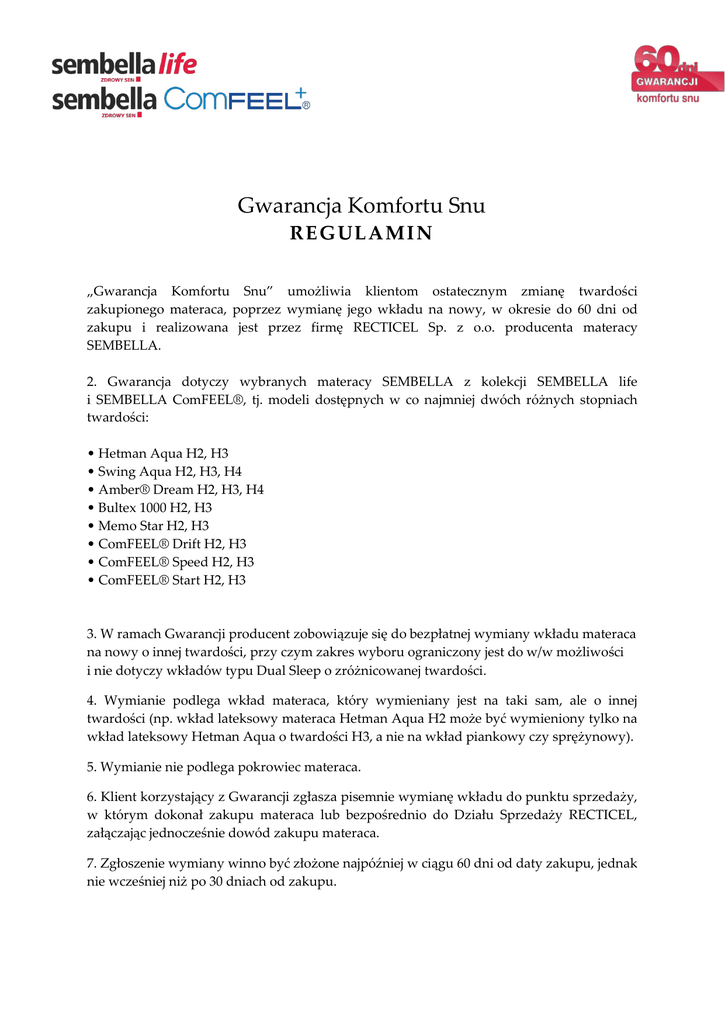 Gwarancja Komfortu Snu RE G UL A MI N „Gwarancja Komfortu Snu” umożliwia klientom ostatecznym zmianę twardości zakupionego materaca, poprzez wymianę jego wkładu na nowy, w okresie do 60 dni od zakupu i realizowana jest przez firmę RECTICEL Sp. z o.o. producenta materacy SEMBELLA. 2. Gwarancja dotyczy wybranych materacy SEMBELLA z kolekcji SEMBELLA life i SEMBELLA ComFEEL®, tj. modeli dostępnych w co najmniej dwóch różnych stopniach twardości: • Hetman Aqua H2, H3 • Swing Aqua H2, H3, H4 • Amber® Dream H2, H3, H4 • Bultex 1000 H2, H3 • Memo Star H2, H3 • ComFEEL® Drift H2, H3 • ComFEEL® Speed H2, H3 • ComFEEL® Start H2, H3 3. W ramach Gwarancji producent zobowiązuje się do bezpłatnej wymiany wkładu materaca na nowy o innej twardości, przy czym zakres wyboru ograniczony jest do w/w możliwości i nie dotyczy wkładów typu Dual Sleep o zróżnicowanej twardości. 4. Wymianie podlega wkład materaca, który wymieniany jest na taki sam, ale o innej twardości (np. wkład lateksowy materaca Hetman Aqua H2 może być wymieniony tylko na wkład lateksowy Hetman Aqua o twardości H3, a nie na wkład piankowy czy sprężynowy). 5. Wymianie nie podlega pokrowiec materaca. 6. Klient korzystający z Gwarancji zgłasza pisemnie wymianę wkładu do punktu sprzedaży, w którym dokonał zakupu materaca lub bezpośrednio do Działu Sprzedaży RECTICEL, załączając jednocześnie dowód zakupu materaca. 7. Zgłoszenie wymiany winno być złożone najpóźniej w ciągu 60 dni od daty zakupu, jednak nie wcześniej niż po 30 dniach od zakupu. 8. Klient jest zobowiązany do zabezpieczenia wkładu przygotowanego do wymiany przed uszkodzeniem lub zabrudzeniem w transporcie (np. w folię z oryginalnego opakowania materaca) oraz do jego samodzielnej wymiany w materacu. 9. Wymiana wkładu dokonywana jest bezpośrednio u klienta, a koszty wymiany (wykonanie i dostawa nowego wkładu oraz odbiór starego) ponosi producent. 10. Wymiana w ramach „Gwarancji Komfortu Snu” może być dokonana tylko jeden raz. Ewentualne kolejne wymiany mogą być realizowane odpłatnie. 11. Wyłączną podstawę do wymiany wkładu stanowi dowód zakupu materaca. 12. „Gwarancja Komfortu Snu” dotyczy wyłącznie materacy kupowanych do użytku domowego i jest ważna tylko na terytorium Rzeczypospolitej Polskiej. 13. Zgłoszenia wymiany oraz wszelką korespondencję jej dotyczącą należy kierować do Działu Sprzedaży RECTICEL na adres: RECTICEL Sp. z o.o., ul. Graniczna 60, 93-428 Łódź, faks +48 (42) 677 20 30 tel +48 (42) 677 20 20 e-mail: [email protected]