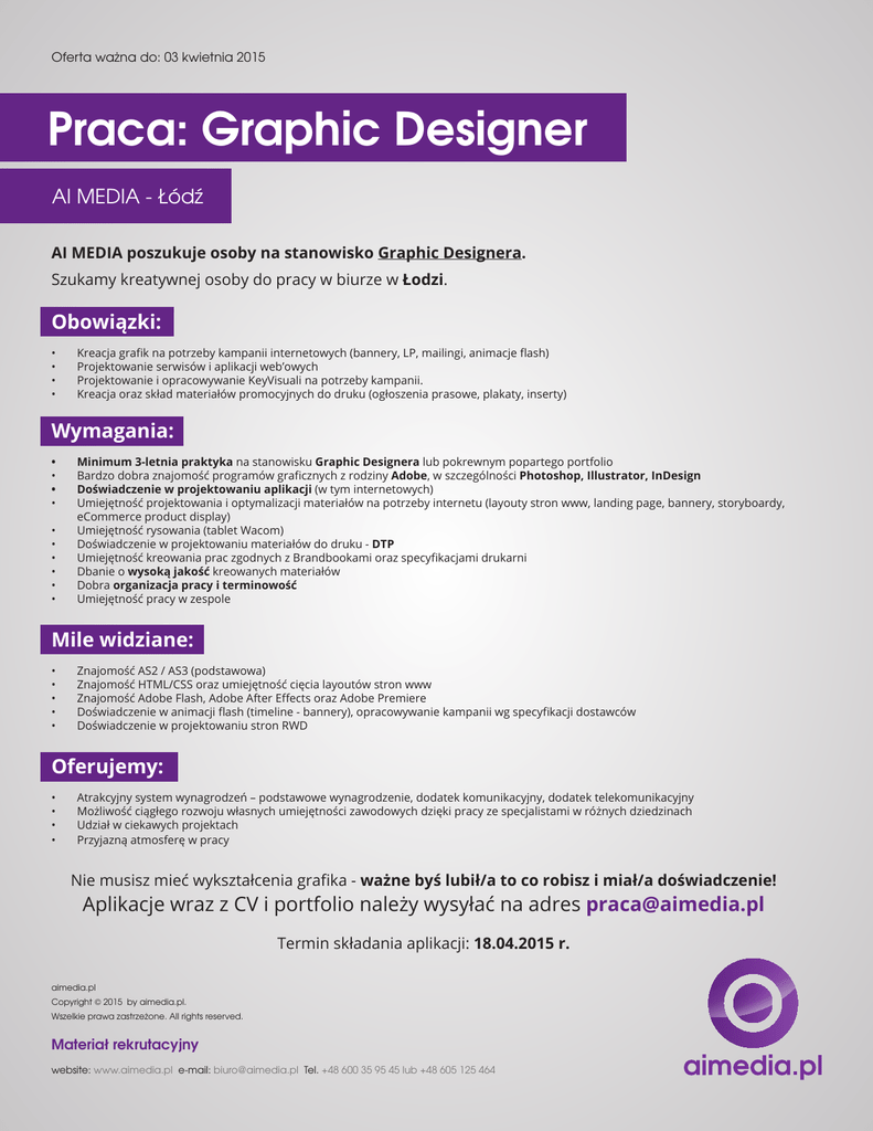 Oferta ważna do: 03 kwietnia 2015 Praca: Graphic Designer AI MEDIA - Łódź AI MEDIA poszukuje osoby na stanowisko Graphic Designera. Szukamy kreatywnej osoby do pracy w biurze w Łodzi. Obowiązki: • • • • Kreacja grafik na potrzeby kampanii internetowych (bannery, LP, mailingi, animacje flash) Projektowanie serwisów i aplikacji web’owych Projektowanie i opracowywanie KeyVisuali na potrzeby kampanii. Kreacja oraz skład materiałów promocyjnych do druku (ogłoszenia prasowe, plakaty, inserty) Wymagania: • • • • • • • • • • Minimum 3-letnia praktyka na stanowisku Graphic Designera lub pokrewnym popartego portfolio Bardzo dobra znajomość programów graficznych z rodziny Adobe, w szczególności Photoshop, Illustrator, InDesign Doświadczenie w projektowaniu aplikacji (w tym internetowych) Umiejętność projektowania i optymalizacji materiałów na potrzeby internetu (layouty stron www, landing page, bannery, storyboardy, eCommerce product display) Umiejętność rysowania (tablet Wacom) Doświadczenie w projektowaniu materiałów do druku - DTP Umiejętność kreowania prac zgodnych z Brandbookami oraz specyfikacjami drukarni Dbanie o wysoką jakość kreowanych materiałów Dobra organizacja pracy i terminowość Umiejętność pracy w zespole Mile widziane: • • • • • Znajomość AS2 / AS3 (podstawowa) Znajomość HTML/CSS oraz umiejętność cięcia layoutów stron www Znajomość Adobe Flash, Adobe After Effects oraz Adobe Premiere Doświadczenie w animacji flash (timeline - bannery), opracowywanie kampanii wg specyfikacji dostawców Doświadczenie w projektowaniu stron RWD Oferujemy: • • • • Atrakcyjny system wynagrodzeń – podstawowe wynagrodzenie, dodatek komunikacyjny, dodatek telekomunikacyjny Możliwość ciągłego rozwoju własnych umiejętności zawodowych dzięki pracy ze specjalistami w różnych dziedzinach Udział w ciekawych projektach Przyjazną atmosferę w pracy Nie musisz mieć wykształcenia grafika - ważne byś lubił/a to co robisz i miał/a doświadczenie! Aplikacje wraz z CV i portfolio należy wysyłać na adres [email protected] Termin składania aplikacji: 18.04.2015 r. aimedia.pl Copyright © 2015 by aimedia.pl. Wszelkie prawa zastrzeżone. All rights reserved. Materiał rekrutacyjny website: www.aimedia.pl e-mail: [email protected] Tel. +48 600 35 95 45 lub +48 605 125 464