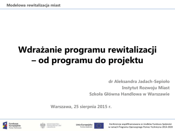 Modelowa rewitalizacja miast Wdrażanie programu rewitalizacji – od programu do projektu dr Aleksandra Jadach-Sepioło Instytut Rozwoju Miast Szkoła Główna Handlowa w Warszawie Warszawa, 25 sierpnia 2015 r. Konferencja współfinansowana ze środków Funduszu Spójności w ramach Programu Operacyjnego Pomoc Techniczna 2014-2020 Modelowa rewitalizacja miast Plan prezentacji 1. Które projekty wpisać do programu rewitalizacji – podejścia, grupowanie projektów 2. System wdrażania opisany w programie rewitalizacji a realizacja projektów - rola zespołu zadaniowego 3. Urząd czy operator Konferencja współfinansowana ze środków Funduszu Spójności w ramach Programu Operacyjnego Pomoc Techniczna 2014-2020 Modelowa rewitalizacja miast Które projekty wpisać do programu rewitalizacji? Podejścia do grupowania projektów Obszary wsparcia a plan działań. Białystok Sfera działań Obszar wsparcia Przestrzenne Społeczność Kultura, sport, ochrona dziedzictwa kulturowego Gospodarka i turystyka Infrastruktura techniczna Mieszkalnictwo Bezpieczeństwo Gospodarcze Gospodarka i turystyka Społeczne Społeczność Kultura, sport, ochrona dziedzictwa kulturowego Bezpieczeństwo Konferencja współfinansowana ze środków Funduszu Spójności w ramach Programu Operacyjnego Pomoc Techniczna 2014-2020 Modelowa rewitalizacja miast Które projekty wpisać do programu rewitalizacji? Podejścia do grupowania projektów Podejście segmentowe. Andrychów 1.Zadania przestrzenne 1. Infrastruktura techniczna 2. Remonty i renowacja istniejących zasobów mieszkaniowych 3. Infrastruktura społeczna, kulturalna, turystyczna 2.Zadania gospodarcze 1. Wspieranie przedsiębiorczości 2. Rozwój turystyki lub innych sektorów gospodarki lokalnej 3. Uruchamianie finansowych instrumentów wsparcia 3.Zadania społeczne 1. Rozwój zasobów ludzkich 2. Przeciwdziałanie wykluczeniu społecznemu 3. Walka z patologiami społecznymi 4. Tworzenie równych szans 5. Zapobieganie bezrobociu 6. Aktywizacji środowisk dziecięcych i młodzieżowych 7. System wsparcia organizacji pozarządowych Konferencja współfinansowana ze środków Funduszu Spójności w ramach Programu Operacyjnego Pomoc Techniczna 2014-2020 Modelowa rewitalizacja miast Które projekty wpisać do programu rewitalizacji? Podejścia do grupowania projektów Specyfika obszaru a plan działań. Radlin Sfera działań Obszar wsparcia Przestrzenne Teren objęty ochroną konserwatorską i ochroną krajobrazu Tereny zamieszkane przez społeczność w znacznej mierze zmarginalizowaną (pomoc OPS) Tereny o słabej dynamice rozwoju Tereny pozbawione ogólnodostępnej bazy sportowo-rekreacyjnej Tereny i obiekty poprzemysłowe Społeczne Wysoki poziom bezrobocia mieszkańców Wysoki poziom wykluczenia społecznego Niski poziom kapitału społecznego i tożsamości (osiedle Marcel) Konferencja współfinansowana ze środków Funduszu Spójności w ramach Programu Operacyjnego Pomoc Techniczna 2014-2020 Modelowa rewitalizacja miast Które projekty wpisać do programu rewitalizacji? Podejścia do grupowania projektów Specyfika miasta. Muszyna 1. Turystyka i rekreacja 2. Lecznictwo uzdrowiskowe i modernizacja bazy sanatoryjnej 3. Pozostałe elementy gospodarki (w tym zagospodarowanie przestrzenne, infrastruktura komunalna Konferencja współfinansowana ze środków Funduszu Spójności w ramach Programu Operacyjnego Pomoc Techniczna 2014-2020 Modelowa rewitalizacja miast System wdrażania opisany w programie rewitalizacji a realizacja projektów 1. Rola zespołu zadaniowego – pochodna grupowania projektów 2. Komitet monitorujący Konferencja współfinansowana ze środków Funduszu Spójności w ramach Programu Operacyjnego Pomoc Techniczna 2014-2020 Modelowa rewitalizacja miast Urząd czy operator? Zarządzanie procesem rewitalizacji w gminie Gmina /urząd gminy/ Operator /np. jednostka budżetowa, spółka/ Aktywny Bierny podmiot odpowiedzialny za zarządzanie procesem rewitalizacji danego obszaru, który prowadzi działania w imieniu gminy na swój rachunek podmiot odpowiedzialny za zarządzanie procesem rewitalizacji danego obszaru, który prowadzi działania w swoim imieniu na rachunek gminy Konferencja współfinansowana ze środków Funduszu Spójności w ramach Programu Operacyjnego Pomoc Techniczna 2014-2020 Modelowa rewitalizacja miast Operatorzy Agencja Renowacji Starówki Sp. z o.o. (Płock, od 1997 r.) – początkowo jednostka budżetowo, od 1998 r. spółka miejska, zaczynała od projektów mieszkaniowych, szybko rozszerzając działalność na modernizację przestrzeni publicznej, współpracę z jednostkami gminy prowadzącymi działania remontowe. Integruje działania na terenie ulicy Tumskiej, pozyskuje środki. W niewielkim stopniu promuje partycypację społeczną. Rewitalizacja Sp. z o.o. (Radom, od 2003 r.) – spółka miejska z udziałami gminy, lokalnego TBS i spółki wodociągowej, operator działań rewitalizacyjnych w jednym z obszarów zdegradowanych (Miasto Kazimierzowskie), działania przygotowawcze i inwestycyjne, aktywna w pozyskiwaniu środków zewnętrznych (ZPORR, RPO, Inicjatywa JESSICA). W niewielkim stopniu promuje partycypację społeczną. Konferencja współfinansowana ze środków Funduszu Spójności w ramach Programu Operacyjnego Pomoc Techniczna 2014-2020 Modelowa rewitalizacja miast Operatorzy. NOWE GLIWICE Centrum Edukacji i Biznesu GAPR sp. zo.o. Etapowanie działań I etap: 2005-2008 Przebudowy: cechownia – siedziba Gliwickiej Wyższej Szkoły Przedsiębiorczości; maszynownia - biura i inkubator przedsiębiorczości; willa dyrektora – wynajęta firmie energetycznej. Dawnej dyrekcja kopalni - nowy budynek dydaktyczny połączony z cechownią stalowo-szklanym łącznikiem –siedziba Nauczycielskiego Kolegium Języków Obcych w Gliwicach. https://gliwice.eu/dla-biznesu/nowe-gliwice II etap (2008- do teraz) Strefa przedsiębiorczości Rozwój inkubatora Klaster - „węglowa dolina” nowych technologii K