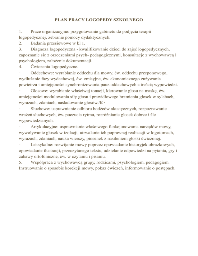PLAN PRACY LOGOPEDY SZKOLNEGO 1. Prace organizacyjne: przygotowanie gabinetu do podjęcia terapii logopedycznej, zebranie pomocy dydaktycznych. 2. Badania przesiewowe w kl 1. 3. Diagnoza logopedyczna - kwalifikowanie dzieci do zajęć logopedycznych, zapoznanie się z orzeczeniami psych- pedagogicznymi, konsultacje z wychowawcą i psychologiem, założenie dokumentacji. 4. Ćwiczenia logopedyczne. • Oddechowe: wyrabianie oddechu dla mowy, ćw. oddechu przeponowego, wydłużanie fazy wydechowej, ćw. emisyjne, ćw. ekonomicznego zużywania powietrza i umiejętności synchronizowania pauz oddechowych z treścią wypowiedzi. • Głosowe: wyrabianie właściwej tonacji, kierowanie głosu na maskę, ćw. umiejętności modulowania siły głosu i prawidłowego brzmienia głosek w sylabach, wyrazach, zdaniach, naśladowanie głosów./li> • Słuchowe: usprawnianie odbioru bodźców akustycznych, rozpoznawanie wrażeń słuchowych, ćw. poczucia rytmu, rozróżnianie głosek dobrze i źle wypowiedzianych. • Artykulacyjne: usprawnianie właściwego funkcjonowania narządów mowy, wywoływanie głosek w izolacji, utrwalanie ich poprawnej realizacji w logotomach, wyrazach, zdaniach, nauka wierszy, piosenek z nasileniem głoski ćwiczonej. • Leksykalne: rozwijanie mowy poprzez opowiadanie historyjek obrazkowych, opowiadanie ilustracji, przeczytanego tekstu, udzielanie odpowiedzi na pytania, gry i zabawy ortofoniczne, ćw. w czytaniu i pisaniu. 5. Współpraca z wychowawcą grupy, rodzicami, psychologiem, pedagogiem. Instruowanie o sposobie korekcji mowy, pokaz ćwiczeń, informowanie o postępach.