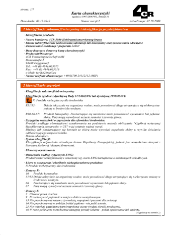 DR strona: 1/7 Karta charakterystyki zgodnie z 1907/2006/WE, Artykuł 31 Data druku: 02.12.2010 Numer wersji 2 Aktualizacja: 07.10.2009 1 Identyfikacja substancji/mieszaniny i identyfikacja przedsiębiorstwa · Identyfikator produktu · Nazwa handlowa: 4CR 5300 Hohlraumkonservierung braun · Istotne zidentyfikowane zastosowania substancji lub mieszaniny oraz zastosowania odradzane · Zastosowanie substancji / preparatu Lakier · Dane dotyczące dostawcy karty charakterystyki · Producent/Dostawca: 4CR Vertriebsgesellschaft mbH Donaustraße 2 94469 Deggendorf Tel.: +49 (0) 4841/665015 Fax: +49 (0) 4841/665016 e-Mail: [email protected] · Numer telefonu alarmowego: +49(0)700 24112112 (MIP) 2 Identyfikacja zagroŜeń · Klasyfikacja substancji lub mieszaniny · Klasyfikacja zgodnie z dyrektywą Rady 67/548/EWG lub dyrektywą 1999/45/WE N; Produkt niebezpieczny dla środowiska R51/53: Działa toksycznie na organizmy wodne; moŜe powodować długo utrzymujące się niekorzystne zmiany w środowisku wodnym. R10-66-67: Produkt łatwopalny. Powtarzające się naraŜenie moŜe powodować wysuszanie lub pękanie skóry. Pary mogą wywoływać uczucie senności i zawroty głowy. · Szczególne wskazówki o zagroŜeniu dla człowieka i środowiska: Produkt podlega obowiązkowi oznakowania na podstawie metody obliczania "Ogólnej wytycznej klasyfikowania preparatów w UE" w jej ostatnio waŜnej wersji. DłuŜszy lub powtarzający się kontakt ze skórą moŜe wywołać zapalenie skóry w wyniku działania odtłuszczającego rozpuszczalnika. Działa odurzająco. · System klasyfikacji: Klasyfikacja odpowiada aktualnym listom Wspólnoty Europejskiej, jednak jest uzupełniona danymi z literatury fachowej i danymi firmowymi. · Elementy oznakowania · Oznaczenia według wytycznych EWG: Produkt został sklasyfikowany i oznaczony wg. norm EWG/zarządzenia o substancjach szkodliwych. · Litera w oznaczeniu i określenie niebezpieczeństwa produktu: N Produkt niebezpieczny dla środowiska · Zestawy R: 10 Produkt łatwopalny. 51/53 Działa toksycznie na organizmy wodne; moŜe powodować długo utrzymujące się niekorzystne zmiany w środowisku wodnym. 66 Powtarzające się naraŜenie moŜe powodować wysuszanie lub pękanie skóry. 67 Pary mogą wywoływać uczucie senności i zawroty głowy. · Zestawy S: 2 Chronić przed dziećmi. 9 Przechowywać pojemnik w miejscu dobrze wentylowanym. 13 Nie przechowywać razem z Ŝywnością, napojami i paszami dla zwierząt. 16 Nie przechowywać w pobliŜu źródeł zapłonu - nie palić tytoniu. 23 Nie wdychać gazu/dymu/pary/rozpylonej cieczy (rodzaj określi producent). 46 W razie połknięcia niezwłocznie zasięgnij porady lekarza - pokaŜ opakowanie lub etykietę. (ciąg dalszy na stronie 2) PL DR strona: 2/7 Karta charakterystyki zgodnie z 1907/2006/WE, Artykuł 31 Data druku: 02.12.2010 Numer wersji 2 Aktualizacja: 07.10.2009 Nazwa handlowa: 4CR 5300 Hohlraumkonservierung braun (ciąg dalszy od strony 1) · Inne zagroŜenia · Wyniki oceny właściwości PBT i vPvB · PBT: Nie nadający się do zastosowania. · vPvB: Nie nadający się do zastosowania. 3 Skład/informacja o składnikach · Charakterystyka chemiczna: Mieszaniny · Opis: Mieszanka z niŜej wymienionych składników z bezpiecznymi domieszkami. · Składniki niebezpieczne: CAS: 64742-82-1 Benzyna cięŜka hydroodsiarczona (ropa naftowa) EINECS: 265-185-4 Xn R65; N R51/53 R10-66-67 Flam. Liq. 3, H226; Asp. Tox. 1, H304; Aquatic Chronic 2, STOT SE 3, H336 H411; · Wskazówki dodatkowe: Pełna treść przytoczonych wskazówek dotyczących zagroŜeń znajduje się w rozdziale 16. 25-50% 4 Środki pierwszej pomocy · Opis środków pierwszej pomocy · Po wdychaniu: Dostarczyć świeŜe powietrze, w razie dolegliwości wezwać lekarza. · Po styczności ze skórą: Ogólnie produkt nie działa draŜniąco na skórę. · Po styczności z okiem: Płukać oczy z otwartą powieką przez kilka minut pod bieŜącą wodą. · Po przełknięciu: Przy trwałych dolegliwościach porozumieć się z lekarzem. · Wskazówki dla lekarza: · NajwaŜniejsze ostre i opóźnione objawy oraz skutki naraŜenia Brak dostępnych dalszych istotnych danych · Wskazania dotyczące wszelkiej natychmiastowej pomocy lekarskiej i szczególnego postępowania z poszkodowanym Brak dostępnych dalszych istotnych danych 5 Postępowanie w przypadku poŜaru · Środki gaśnicze · Przydatne środki gaśnicze: CO2, piasek, proszek gaśniczy. Nie stosować wody. · Środki gaśnicze nieprzydatne ze względów bezpieczeństwa: Woda pełnym strumieniem · Szczególne zagroŜenia związane z substancją lub mieszaniną Brak dostępnych dalszych istotnych danych · Informacje dla straŜy poŜarnej · Specjalne wyposaŜenie ochronne: Środki specjalne nie są konieczne. 6 Postępowanie w przypadku niezamierzonego uwolnienia do środowiska · Indywidualne środki ostroŜności, wyposaŜenie ochronne i procedury w sytuacjach awaryjnych Nosić ubranie ochronne. Osoby nie zabezpieczone przenieść w bezpieczne miejsce. · Środki ostroŜności w zakresie ochrony środowiska: W przypadku przedostania się do zbiorników wodnych lub kanalizacji zawiadomić właściwe władze. Nie dopuścić do przeniknięcia do kanalizacji /wód powierzchniowych /wód gruntowych. · Metody i materiały zapobiegające rozprzestrzenianiu się skaŜenia i słuŜące do usuwania skaŜenia: Zebrać za pomocą materiału wiąŜącego ciecze (piasek, ziemia okrzemkowa, materiał wiąŜący kwasy, materiał wiąŜący uniwersalny, trociny). Zadbać o wystarczające przewietrzenie. Nie zmywać wodą ani wodnymi środkami myjącymi. (ciąg dalszy na stronie 3) PL DR strona: 3/7 Karta charakterystyki zgodnie z 1907/2006/WE, Artykuł 31 Data druku: 02.12.2010 Numer wersji 2 Aktualizacja: 07.10.2009 Nazwa handlowa: 4CR 5300 Hohlraumkonservierung braun (ciąg dalszy od strony 2) · Odniesienia do innych sekcji Informacje na temat bezpiecznej obsługi patrz rozdział 7. Informacje na