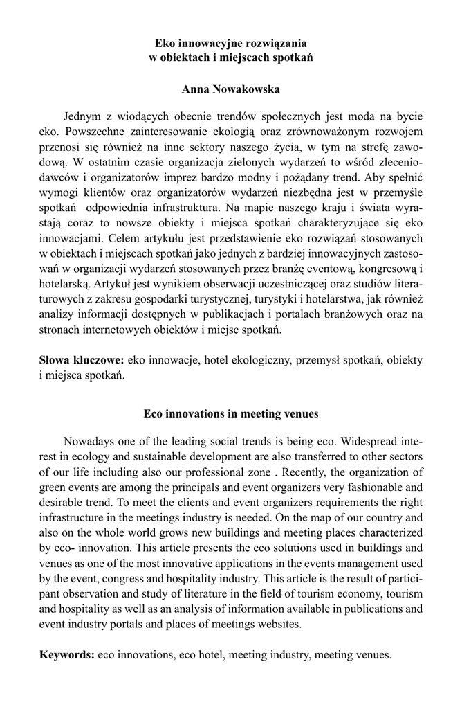 Eko innowacyjne rozwiązania w obiektach i miejscach spotkań Anna Nowakowska Jednym z wiodących obecnie trendów społecznych jest moda na bycie eko. Powszechne zainteresowanie ekologią oraz zrównoważonym rozwojem przenosi się również na inne sektory naszego życia, w tym na strefę zawodową. W ostatnim czasie organizacja zielonych wydarzeń to wśród zleceniodawców i organizatorów imprez bardzo modny i pożądany trend. Aby spełnić wymogi klientów oraz organizatorów wydarzeń niezbędna jest w przemyśle spotkań odpowiednia infrastruktura. Na mapie naszego kraju i świata wyrastają coraz to nowsze obiekty i miejsca spotkań charakteryzujące się eko innowacjami. Celem artykułu jest przedstawienie eko rozwiązań stosowanych w obiektach i miejscach spotkań jako jednych z bardziej innowacyjnych zastosowań w organizacji wydarzeń stosowanych przez branżę eventową, kongresową i hotelarską. Artykuł jest wynikiem obserwacji uczestniczącej oraz studiów literaturowych z zakresu gospodarki turystycznej, turystyki i hotelarstwa, jak również analizy informacji dostępnych w publikacjach i portalach branżowych oraz na stronach internetowych obiektów i miejsc spotkań. Słowa kluczowe: eko innowacje, hotel ekologiczny, przemysł spotkań, obiekty i miejsca spotkań. Eco innovations in meeting venues Nowadays one of the leading social trends is being eco. Widespread interest in ecology and sustainable development are also transferred to other sectors of our life including also our professional zone . Recently, the organization of green events are among the principals and event organizers very fashionable and desirable trend. To meet the clients and event organizers requirements the right infrastructure in the meetings industry is needed. On the map of our country and also on the whole world grows new buildings and meeting places characterized by eco- innovation. This article presents the eco solutions used in buildings and venues as one of the most innovative applications in the events management used by the event, congress and hospitality industry. This article is the result of participant observation and study of literature in the field of tourism economy, tourism and hospitality as well as an analysis of information available in publications and event industry portals and places of meetings websites. Keywords: eco innovations, eco hotel, meeting industry, meeting venues.