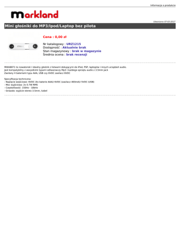 Informacje o produkcie Utworzono 07-03-2017 Mini głośniki do MP3/Ipod/Laptop bez pilota Cena : 0,00 zł Nr katalogowy : URZ1215 Dostępność : Aktualnie brak Stan magazynowy : brak w magazynie Średnia ocena : brak recenzji MWA8871 to nowatorski i idealny głośnik z listwami dokującymi do iPod, PSP, laptopów i innych urządzeń audio. Jest kompatybilny z wszystkimi typami odtwarzaczy Mp3 i każdego sprzętu audio z 3.5mm jack Zasilany 4 bateriami typu AAA, USB czy 6VDC zasilacz 6VDC Specyfikacja techniczna: - Napięcie wejściowe: 6VDC (4x baterie AAA)/ 6VDC (zasilacz 400mA)/ 5VDC (USB) - Moc wyjściowa: 2x 0.7W RMS - Częstotliwość: 150Hz - 18kHz - Gniazdo: wyjście stereo 3.5mm, kabel