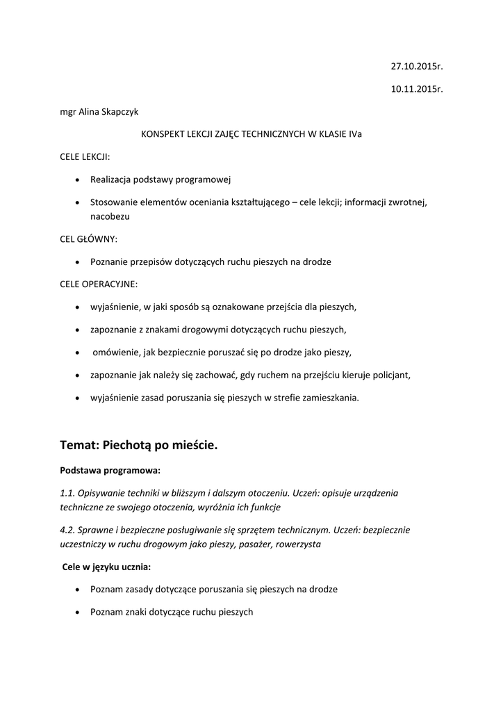 27.10.2015r. 10.11.2015r. mgr Alina Skapczyk KONSPEKT LEKCJI ZAJĘC TECHNICZNYCH W KLASIE IVa CELE LEKCJI: Realizacja podstawy programowej Stosowanie elementów oceniania kształtującego – cele lekcji; informacji zwrotnej, nacobezu CEL GŁÓWNY: Poznanie przepisów dotyczących ruchu pieszych na drodze CELE OPERACYJNE: wyjaśnienie, w jaki sposób są oznakowane przejścia dla pieszych, zapoznanie z znakami drogowymi dotyczących ruchu pieszych, omówienie, jak bezpiecznie poruszać się po drodze jako pieszy, zapoznanie jak należy się zachować, gdy ruchem na przejściu kieruje policjant, wyjaśnienie zasad poruszania się pieszych w strefie zamieszkania. Temat: Piechotą po mieście. Podstawa programowa: 1.1. Opisywanie techniki w bliższym i dalszym otoczeniu. Uczeń: opisuje urządzenia techniczne ze swojego otoczenia, wyróżnia ich funkcje 4.2. Sprawne i bezpieczne posługiwanie się sprzętem technicznym. Uczeń: bezpiecznie uczestniczy w ruchu drogowym jako pieszy, pasażer, rowerzysta Cele w języku ucznia: Poznam zasady dotyczące poruszania się pieszych na drodze Poznam znaki dotyczące ruchu pieszych Metody: – metoda aktywizująca – praca w grupach – rozmowa kierowana, – praca z tekstem, – praca z materiałem ilustracyjnym. Formy pracy: indywidualna, grupowa, zbiorowa. Środki dydaktyczne: podręcznik do zajęć technicznych dla klasy 4 “Jak to działa?" (s. 12, 16–17), karta pracy „Piechotą po mieście”, kodeks drogowy tablica interaktywna Czas: 2h lekcyjne Przebieg lekcji: Faza wprowadzająca 1. Czynności organizacyjne: sprawdzenie obecności, podanie tematu i celów lekcji. 2. Uczniowie wyjaśniają, jak rozumieją terminy pieszy i przejście dla pieszych. Następnie, odpowiadają na pytanie wprowadzające pod tematem ze s. 16 podręcznika. Opisują, w jaki sposób są oznakowane przejścia dla pieszych. Faza realizacyjna 1. Na polecenie nauczyciela uczniowie czytają tekst „Jak bezpiecznie przejść przez jezdnię?” ze s. 16 i uważnie przyglądają się zamieszczonej poniżej ilustracji, przedstawiającej przejście dla pieszych. Następnie wykonują ćwiczenie 1. (podręcznik, s. 16), w którym odczytują tekst dotyczący właściwego zachowania się podczas przechodzenia przez ulicę, uzupełniając go podanymi wyrazami. 2. Następnie uczniowie pracują w grupach. Klasa zostaje podzielona na trzy grupy. Każda z nich otrzymuje kartkę z poleceniami do wykonania. Nauczyciel określa czas wykonania zadania (15 minut). Uczniowie przygotowują odpowiedzi na pytania i na podstawie zdobytych wiadomości sporządzają notatki w zeszytach. Po upływie wyznaczonego czasu grupy dzielą się informacjami jakie opracowali w grupach. 3. Uczniowie czytają tekst „Sygnalizacja świetlna” ze s. 17 podręcznika. Nauczyciel krótko omawia budowę sygnalizatora dla pieszych. Zwraca również uwagę, że czerwone światło zawsze znajduje się w górnej części urządzenia, co jest przydatne dla osób z zaburzeniami wzroku. Podkreśla też znaczenie pulsującego światła zielonego. W dalszej kolejności uczniowie określają, kiedy i jak można wkraczać na przejście dla pieszych (ćwiczenie 2., s. 17 podręcznika) oraz wyjaśniają, jak należy postąpić w sytuacjach ukazanych na ilustracjach w ćwiczeniu 3 ze s. 17 (sygnalizator na przejściu dla pieszych: 1) z zielonym światłem, 2) z czerwonym światłem.) 4. Nauczyciel przedstawia hierarchię ważności znaków i sygnałów w wypadku, gdy na przejściu działa sygnalizacja, a ruchem kieruje policjant. Zaznacza, że w takiej sytuacji pieszy ma obowiązek stosować się do znaków dawanych przez policjanta. Następnie prezentuje postawy policjanta wydającego komendy Stop! i Idź! oraz poleca uczniom przećwiczyć w parach przedstawione gesty. 5. Uczniowie wskazują znaki drogowe związane z ruchem pieszych (na s. 12 – znaki informacyjne „strefa zamieszkania”, „przejście dla pieszych”) Podsumowanie Nauczyciel rozdaje uczniom karty pracy, uczniowie samodzielnie uzupełniają. Przypomnienie celu lekcji, ocena pracy uczniów na lekcji. Zakończenie zajęć – pożegnanie. Materiały dla ucznia Zadania dla grupy I 1. Przeczytajcie fragment ustawy „Prawo o ruchu drogowym”, a następnie odpowiedzcie na pytania. • Kto to jest pieszy? • W jakiej sytuacji osoba kierująca rowerem jest uznawana za pieszego? • Na jakich obszarach może być wyodrębnione przejście dla pieszych? 2. Na podstawie zdobytych wiadomości sporządźcie notatkę w zeszycie. Zadania dla grupy II 1. Przeczytajcie fragment ustawy „Prawo o ruchu drogowym”, a następnie odpowiedzcie na pytania. • W jakich miejscach można przechodzić przez jezdnię lub torowisko? • Jak należy przekraczać jezdnię lub torowisko? • W jakiej sytuacji pieszy ma pierwszeństwo przed pojazdem? 2. Na podstawie zdobytych wiadomości sporządźcie notatkę w zeszycie. Zadania dla grupy III 1. Przeczytajcie fragment ustawy „Prawo o ruchu drogowym”, a następnie odpowiedzcie na pytania. • Jakie są rodzaje przejść dla pieszych? • Na jakich obszarach należy bezwzględnie korzystać z przejść dla pieszych? • Jak powinien zachować się pieszy na przejściu przez drogę dwujezdniową? KARTA PRACY Uzupełnij tekst. Skorzystaj z podanych wyrazów. Każdy, kto przechodzi przez jezdnię lub torowisko, musi zachować szczególną...................... . Należy przechodzić przez ulicę w bezpiecznym miejscu, .............................................. drogą. Na przejściu dla pieszych idący ma ................................. przed pojazdem. Jeżeli dana osoba znajduje się na ........................................... i nie wykonuje na niej żadnych robót, uznaje się ją za pieszego. Jest nim też osoba prowadząca ......................, motorower czy motocykl. Jako pieszego traktuje się również dziecko poniżej........................... roku życia, kierujące rowerem pod opieką dorosłego. Przez jezdnie,