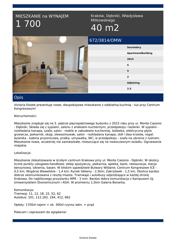MIESZKANIE na WYNAJEM 1 700 Kraków, Dębniki, Władysława Mitkowskiego 40 m2 672/3814/OMW Secondary ApartmentBuilding 2015 5 5 2 Adjoining 2.5 Opis Victoria Estate prezentuje nowe, dwupokojowe mieszkanie z oddzielną kuchnią - tuż przy Centrum Kongresowym! Nieruchomości: Mieszkanie znajduje się na 5. piętrze pięciopiętrowego budynku z 2015 roku przy ul. Monte Cassino - Dębniki. Składa się z sypialni, salonu z aneksem kuchennym, przedpokoju i łazienki. W sypialni rozkładana kanapa, szafa; salon - meble w zabudowie kuchennej, lodówka, elektryczna płyta grzewcza, piekarnik, okap, zlewozmywak; salon - rozkładana kanapa, stół i dwa krzesła, regał; łazienka - kabina prysznicowa, pralka, umywalka, WC; w przedpokoju - szafa na ubrania z lustrem. Mieszkanie nowe, wcześniej nie zamieszkałe, mieszczące się na nowoczesnym osiedlu. Ogrzewanie miejskie. Lokalizacja: Mieszkanie zlokalizowane w ścisłym centrum Krakowa przy ul. Monte Cassino - Dębniki. W okolicy liczne punkty usługowo-handlowe: sklep spożywczy, piekarnia, apteka, bank, restauracja, stacja benzynowa, siłownia, basen. W bliskim sąsiedztwie Bulwary Wiślane; Centrum Kongresowe ICE 0,5 km; Wzgórze Wawelskie - 1,4 km; Rynek Główny - 2,5km; Zakrzówek - 1,5 km. Okolica bardzo dobrze skomunikowana z resztą miasta. Tramwaje i autobusy odjeżdżające w każdą stronę Krakowa. Do najbliższego przystanku MPK - 3 min. Bardzo dobra komunikacja z Kampusem UJ, Uniwersytetem Ekonomicznym i AGH. W promieniu 1,5km Galeria Bonarka. Komunikacja: Tramwaj: 11, 12, 18, 22, 52, 62 Autobus: 101, 112,162, 194, 412, 662 Opłaty: 1700zł najem + ok. 300zł czynsz adm. + prąd Polecam i zapraszam do oglądania! Victoria Estate Małgorzata Wicha tel. +48 511 560 721 email: [email protected] Victoria Estate Powered by TCPDF (www.tcpdf.org)