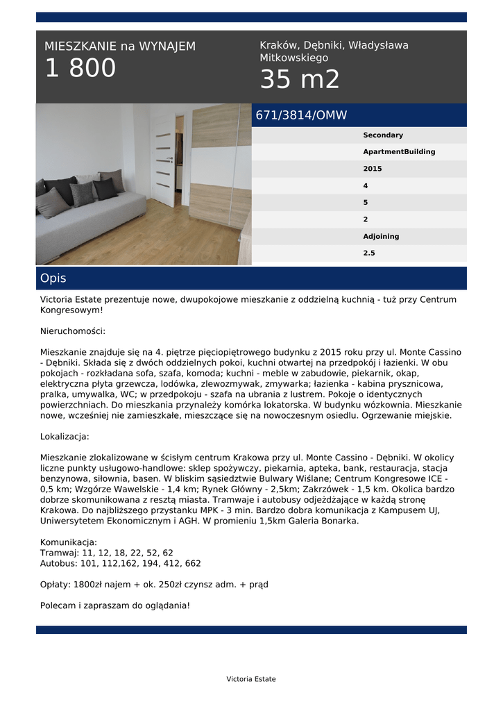 MIESZKANIE na WYNAJEM 1 800 Kraków, Dębniki, Władysława Mitkowskiego 35 m2 671/3814/OMW Secondary ApartmentBuilding 2015 4 5 2 Adjoining 2.5 Opis Victoria Estate prezentuje nowe, dwupokojowe mieszkanie z oddzielną kuchnią - tuż przy Centrum Kongresowym! Nieruchomości: Mieszkanie znajduje się na 4. piętrze pięciopiętrowego budynku z 2015 roku przy ul. Monte Cassino - Dębniki. Składa się z dwóch oddzielnych pokoi, kuchni otwartej na przedpokój i łazienki. W obu pokojach - rozkładana sofa, szafa, komoda; kuchni - meble w zabudowie, piekarnik, okap, elektryczna płyta grzewcza, lodówka, zlewozmywak, zmywarka; łazienka - kabina prysznicowa, pralka, umywalka, WC; w przedpokoju - szafa na ubrania z lustrem. Pokoje o identycznych powierzchniach. Do mieszkania przynależy komórka lokatorska. W budynku wózkownia. Mieszkanie nowe, wcześniej nie zamieszkałe, mieszczące się na nowoczesnym osiedlu. Ogrzewanie miejskie. Lokalizacja: Mieszkanie zlokalizowane w ścisłym centrum Krakowa przy ul. Monte Cassino - Dębniki. W okolicy liczne punkty usługowo-handlowe: sklep spożywczy, piekarnia, apteka, bank, restauracja, stacja benzynowa, siłownia, basen. W bliskim sąsiedztwie Bulwary Wiślane; Centrum Kongresowe ICE 0,5 km; Wzgórze Wawelskie - 1,4 km; Rynek Główny - 2,5km; Zakrzówek - 1,5 km. Okolica bardzo dobrze skomunikowana z resztą miasta. Tramwaje i autobusy odjeżdżające w każdą stronę Krakowa. Do najbliższego przystanku MPK - 3 min. Bardzo dobra komunikacja z Kampusem UJ, Uniwersytetem Ekonomicznym i AGH. W promieniu 1,5km Galeria Bonarka. Komunikacja: Tramwaj: 11, 12, 18, 22, 52, 62 Autobus: 101, 112,162, 194, 412, 662 Opłaty: 1800zł najem + ok. 250zł czynsz adm. + prąd Polecam i zapraszam do oglądania! Victoria Estate Małgorzata Wicha tel. +48 511 560 721 email: [email protected] Victoria Estate Powered by TCPDF (www.tcpdf.org)