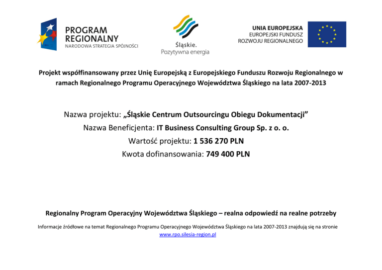 Projekt współfinansowany przez Unię Europejską z Europejskiego Funduszu Rozwoju Regionalnego w ramach Regionalnego Programu Operacyjnego Województwa Śląskiego na lata 2007-2013 Nazwa projektu: „Śląskie Centrum Outsourcingu Obiegu Dokumentacji” Nazwa Beneficjenta: IT Business Consulting Group Sp. z o. o. Wartość projektu: 1 536 270 PLN Kwota dofinansowania: 749 400 PLN Regionalny Program Operacyjny Województwa Śląskiego – realna odpowiedź na realne potrzeby Informacje źródłowe na temat Regionalnego Programu Operacyjnego Województwa Śląskiego na lata 2007-2013 znajdują się na stronie www.rpo.silesia-region.pl