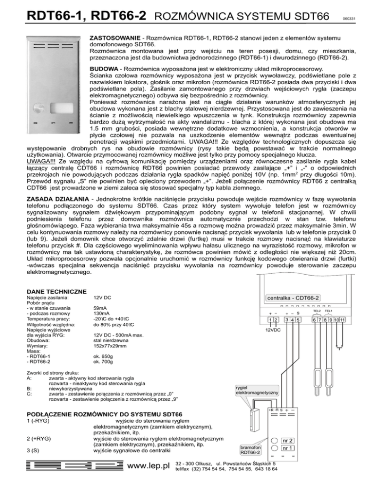 RDT66-1, RDT66-2 ROZMÓWNICA SYSTEMU SDT66 060331 ZASTOSOWANIE - Rozmównica RDT66-1, RDT66-2 stanowi jeden z elementów systemu domofonowego SDT66. Rozmównica montowana jest przy wejściu na teren posesji, domu, czy mieszkania, przeznaczona jest dla budownictwa jednorodzinnego (RDT66-1) i dwurodzinnego (RDT66-2). BUDOWA - Rozmównica wyposażona jest w elektroniczny układ mikroprocesorowy. Ścianka czołowa rozmównicy wyposażona jest w przycisk wywoławczy, podświetlane pole z nazwiskiem lokatora, głośnik oraz mikrofon (rozmównica RDT66-2 posiada dwa przyciski i dwa podświetlane pola). Zasilanie zamontowanego przy drzwiach wejściowych rygla (zaczepu elektromagnetycznego) odbywa się bezpośrednio z rozmównicy. Ponieważ rozmównica narażona jest na ciągłe działanie warunków atmosferycznych jej obudowa wykonana jest z blachy stalowej nierdzewnej. Przystosowana jest do zawieszenia na ścianie z możliwością niewielkiego wpuszczenia w tynk. Konstrukcja rozmównicy zapewnia bardzo dużą wytrzymałość na akty wandalizmu - blacha z której wykonana jest obudowa ma 1.5 mm grubości, posiada wewnętrzne dodatkowe wzmocnienia, a konstrukcja otworów w płycie czołowej nie pozwala na uszkodzenie elementów wewnątrz podczas ewentualnej penetracji wąskimi przedmiotami. UWAGA!!! Ze względów technologicznych dopuszcza się występowanie drobnych rys na obudowie rozmównicy (rysy takie będą powstawać w trakcie normalnego użytkowania). Otwarcie przymocowanej rozmównicy możliwe jest tylko przy pomocy specjalnego klucza. UWAGA!!! Ze względu na cyfrową komunikację pomiędzy urządzeniami oraz równoczesne zasilanie rygla kabel łączący centralę CDT66 i rozmównicę RDT66 powinien posiadać przewody zasilające „+” i „-” o odpowiednich przekrojach nie powodujących podczas działania rygla spadków napięć poniżej 10V (np. 1mm 2 przy długości 10m). Przewód sygnału „S” nie powinien być opleciony przewodem „+”. Jeżeli połączenie rozmównicy RDT66 z centralką CDT66 jest prowadzone w ziemi zaleca się stosować specjalny typ kabla ziemnego. ZASADA DZIAŁANIA - Jednokrotne krótkie naciśnięcie przycisku powoduje wejście rozmównicy w fazę wywołania telefonu podłączonego do systemu SDT66. Czas przez który system wywołuje telefon jest w rozmównicy sygnalizowany sygnałem dźwiękowym przypominającym podobny sygnał w telefonii stacjonarnej. W chwili podniesienia telefonu przez domownika rozmównica automatycznie przechodzi w stan tzw. telefonu głośnomówiącego. Faza wybierania trwa maksymalnie 45s a rozmowę można prowadzić przez maksymalnie 3min. W celu kontynuowania rozmowy należy na rozmównicy ponownie nacisnąć przycisk wywołania lub w telefonie przycisk 0 (lub 9). Jeżeli domownik chce otworzyć zdalnie drzwi (furtkę) musi w trakcie rozmowy nacisnąć na klawiaturze telefonu przycisk #. Dla częściowego wyeliminowania wpływu hałasu ulicznego na wyrazistość rozmowy, mikrofon w rozmównicy ma tak ustawioną charakterystykę, że rozmówca powinien mówić z odległości nie większej niż 20cm. Układ mikroprocesorowy pozwala opcjonalnie uruchomić w rozmównicy funkcję kodowego otwierania drzwi (furtki) -wówczas specjalna sekwencja naciśnięć przycisku wywołania na rozmównicy powoduje sterowanie zaczepu elektromagnetycznego. DANE TECHNICZNE Napięcie zasilania: Pobór prądu - w stanie czuwania - podczas rozmowy Temperatura pracy: Wilgotność względna: Napięcie wyjściowe dla wyjścia RYG: Obudowa: Wymiary: Masa: - RDT66-1 - RDT66-2 12V DC centralka - CDT66-2 59mA 130mA -20°C do +40°C do 80% przy 40°C S 1 2 12VDC 12V DC - 500mA max. stal nierdzewna 152x77x29mm ok. 650g ok. 700g Zworki od strony druku: A: zwarta - aktywny kod sterowania rygla rozwarta - nieaktywny kod sterowania rygla B: niewykorzystywana C: zwarta - zestawienie połączenia z rozmównicą przez „0” rozwarta - zestawienie połączenia z rozmównicą przez „9” rygiel elektromagnetyczny +R -R S PODŁĄCZENIE ROZMÓWNICY DO SYSTEMU SDT66 1 (-RYG) 2 (+RYG) 3 (S) 3 4 5 wyjście do sterowania ryglem elektromagnetycznym (zamkiem elektrycznym), przekaźnikiem, itp. wyjście do sterowania ryglem elektromagnetycznym (zamkiem elektrycznym), przekaźnikiem, itp. wyjście sygnałowe do centralki www.lep.pl bramofon RDT66-2 32 - 300 Olkusz, ul. Powstańców Śląskich 5 tel/fax (32) 754 54 54, 754 54 55, 643 18 64 nr 2 nr 1 TEL2 TEL1 6 7 8 9 10 11 RDT66-1, RDT66-2 ROZMÓWNICA SYSTEMU SDT66 4 (+12V) zasilanie rozmównicy 5 (┴) zasilanie rozmównicy www.lep.pl 32 - 300 Olkusz, ul. Powstańców Śląskich 5 tel/fax (32) 754 54 54, 754 54 55, 643 18 64 060331