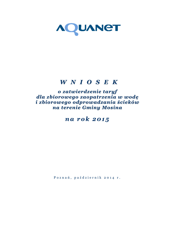W N I O S E K o zatwierdzenie taryf dla zbiorowego zaopatrzenia w wodę i zbiorowego odprowadzania ścieków na terenie Gminy Mosina na rok 2015 Poznań, październik 2014 r. Spis treści I. 1. 2. 3. 4. 5. 6. 6.1. 6.2. Taryfa dla zbiorowego zaopatrzenia w wodę i zbiorowego odprowadzania ścieków .............................. 3 Rodzaj prowadzonej działalności ................................................................................................................ 3 Rodzaj i struktura taryfy.............................................................................................................................. 3 Taryfowe grupy odbiorców ......................................................................................................................... 4 Rodzaje i wysokość cen i stawek opłat. ...................................................................................................... 5 Warunki rozliczeń z uwzględnieniem wyposażenia nieruchomości w przyrządy i urządzenia pomiarowe6 Warunki stosowania cen i stawek opłat ...................................................................................................... 9 Zakres świadczonych usług dla poszczególnych taryfowych grup odbiorców ........................................... 9 Standardy jakościowe usług ...................................................................................................................... 10 II. Uzasadnienie wniosku .................................................................................................................................. 10 1. 2. 3. 4. 5. Zakres świadczonych usług i lokalnych uwarunkowań ich świadczenia .................................................. 10 Standardy jakościowe usług ...................................................................................................................... 10 Metoda alokacji kosztów........................................................................................................................... 11 Zmiana warunków ekonomicznych w roku obowiązywania taryf ............................................................ 11 Metodologia ustalenia niezbędnych przychodów i alokacji kosztów........................................................ 14 III. Informacja o ilości i cenie za zakup wody i wprowadzenie ścieków do urządzeń nie będących w posiadaniu przedsiębiorstwa. ...................................................................................................................... 18 IV. Kalkulacje kosztów, przychodów, cen i stawek ......................................................................................... 19 Załączniki: Wieloletni Plan Rozwoju i Modernizacji urządzeń wodociągowych i urządzeń kanalizacyjnych Sprawozdanie Finansowe za rok 2013 Wniosek o zatwierdzenie taryf dla zbiorowego zaopatrzenia w wodę i zbiorowego odprowadzania ścieków na rok 2015 2 I. Taryfa dla zbiorow ego zaopatrzenia w wodę i zbiorow ego o d p r o w a d z a n i a śc i e kó w Niniejsza taryfa stanowi zestawienie cen i stawek opłat za zbiorowe zaopatrzenie w wodę i zbiorowe odprowadzanie ścieków na okres 12 miesięcy: od dnia 1 stycznia 2015 roku do dnia 31 grudnia 2015 roku oraz określa warunki ich stosowania na terenie Gminy Mosina. Taryfa została opracowana na podstawie przepisów Ustawy z dnia 7 czerwca 2001 r. o zbiorowym zaopatrzeniu w wodę i zbiorowym odprowadzeniu ścieków (tekst jednolity DzU z 2006 r. Nr 123, poz. 858 z późn. zm.), zwanej dalej Ustawą oraz rozporządzenia Ministra Budownictwa z dnia 28 czerwca 2006 roku w sprawie określania taryf, wzoru wniosku o zatwierdzenie taryf oraz warunków rozliczeń za zbiorowe zaopatrzenie w wodę i zbiorowe odprowadzanie ścieków (DzU Nr 127, poz. 886), zwanego dalej Rozporządzeniem. Taryfowe ceny i stawki opłat dotyczą wszystkich odbiorców usług w zakresie dostawy wody i odbioru ścieków świadczonych przez przedsiębiorstwo wodociągowokanalizacyjne. Zgodnie z art. 22 Ustawy taryfa obejmuje także cenę i opłaty za wodę zużytą na cele przeciwpożarowe. 1. Rodzaj prowadzonej działalności Aquanet SA prowadzi działalność w zakresie zbiorowego zaopatrzenia w wodę i zbiorowego odprowadzania ścieków na podstawie zezwolenia udzielonego decyzją Burmistrza Gminy Mosina z dnia 31.12.2012r. Zgodnie z w/w zezwoleniem przedmiot działalności przedsiębiorstwa stanowi: w zakresie zbiorowego zaopatrzenia w wodę: ujmowanie, uzdatnianie i zbiorowe dostarczanie wody usługobiorcom, z którymi zawarto umowę, za pomocą urządzeń wodociągowych; w zakresie zbiorowego odprowadzania ścieków: zbiorowe odprowadzanie i oczyszczanie ścieków dostarczonych przez usługobiorców, z którymi zawarto umowy, za pomocą urządzeń kanalizacyjnych. Obszar świadczenia usług wodociągowo-kanalizacyjnych objęty w/w zezwoleniem obejmuje Gminę Mosina z wyłączeniem terenów wskazanych w niniejszym zezwoleniu. Wniosek o zatwierdzenie taryf dla zbiorowego zaopatrzenia w wodę i zbiorowego odprowadzania ścieków na rok 2015 3 Systematyczne oddawanie do eksploatacji nowych inwestycji pozwala rekompensować spadek sprzedaży usług w zakresie dostawy wody i odprowadzanych ścieków obserwowany u dotychczasowych odbiorców. 2. Rodzaj i struktura taryfy Uwzględniając lokalne warunki w zakresie zbiorowego zaopatrzenia w wodę i zbiorowego odprowadzania ścieków zastosowano taryfę niejednolitą, wieloczłonową, zawierającą jednolite dla poszczególnych taryfowych grup odbiorców ceny za dostarczoną wodę i odprowadzane ścieki a zróżnicowane stawki opłat abonamentowych za utrzymanie w gotowości urządzeń wodociągowych i kanalizacyjnych dla taryfowych grup odbiorców. 3. Taryfowe grupy odbiorców Taryfowa grupa odbiorców usług obejmuje odbiorców wyodrębnionych na podstawie charakterystyki zużycia wody lub odprowadzanych ścieków, warunków zbiorowego zaopatrzenia w wodę i zbiorowego od