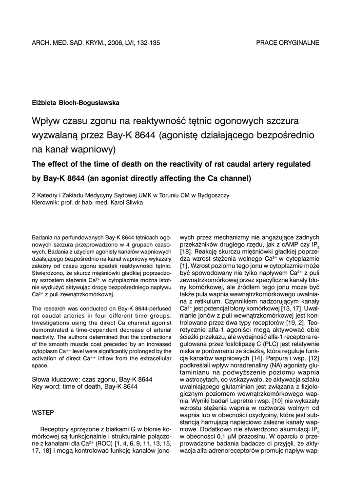 ARCH. MED. SĄD. KRYM., 2006, LVI, 132-135 PRACE ORYGINALNE Elżbieta Bloch-Bogusławska Wpływ czasu zgonu na reaktywność tętnic ogonowych szczura wyzwalaną przez Bay-K 8644 (agonistę działającego bezpośrednio na kanał wapniowy) The effect of the time of death on the reactivity of rat caudal artery regulated by Bay-K 8644 (an agonist directly affecting the Ca channel) Z Katedry i Zakładu Medycyny Sądowej UMK w Toruniu CM w Bydgoszczy Kierownik: prof. dr hab. med. Karol Śliwka Badania na perfundowanych Bay-K 8644 tętnicach ogonowych szczura przeprowadzono w 4 grupach czasowych. Badania z użyciem agonisty kanałów wapniowych działającego bezpośrednio na kanał wapniowy wykazały zależny od czasu zgonu spadek reaktywności tętnic. Stwierdzono, że skurcz mięśniówki gładkiej poprzedzony wzrostem stężenia Ca2+ w cytoplazmie można istotnie wydłużyć aktywując drogę bezpośredniego napływu Ca2+ z puli zewnątrzkomórkowej. The research was conducted on Bay-K 8644-perfused rat caudal arteries in four different time groups. Investigations using the direct Ca channel agonist demonstrated a time-dependent decrease of arterial reactivity. The authors determined that the contractions of the smooth muscle coat preceded by an increased cytoplasm Ca++ level were significantly prolonged by the activation of direct Ca++ inflow from the extracellular space. Słowa kluczowe: czas zgonu, Bay-K 8644 Key word: time of death, Bay-K 8644 WSTĘP Receptory sprzężone z białkami G w błonie komórkowej są funkcjonalnie i strukturalnie połączone z kanałami dla Ca2+ (ROC) [1, 4, 6, 9, 11, 13, 15, 17, 18] i mogą kontrolować funkcję kanałów jono- wych przez mechanizmy nie angażujące żadnych przekaźników drugiego rzędu, jak z cAMP czy IP3 [18]. Reakcję skurczu mięśniówki gładkiej poprzedza wzrost stężenia wolnego Ca2+ w cytoplazmie [1]. Wzrost poziomu tego jonu w cytoplazmie może być spowodowany nie tylko napływem Ca2+ z puli zewnątrzkomórkowej przez specyficzne kanały błony komórkowej, ale źródłem tego jonu może być także pula wapnia wewnątrzkomórkowego uwalniana z retikulum. Czynnikiem nadzorującym kanały Ca2+ jest potencjał błony komórkowej [13, 17]. Uwalnianie jonów z puli wewnątrzkomórkowej jest kontrolowane przez dwa typy receptorów [19, 2]. Teoretycznie alfa-1 agoniści mogą aktywować obie ścieżki przekazu, ale wydajność alfa-1 receptora regulowana przez fosfolipazę C (PLC) jest relatywnie niska w porównaniu ze ścieżką, która reguluje funkcje kanałów wapniowych [14]. Parpura i wsp. [12] podkreślali wpływ noradrenaliny (NA) agonisty glutaminianu na podwyższenie poziomu wapnia w astrocytach, co wskazywało, że aktywacja szlaku uwalniającego glutaminian jest związana z fizjologicznym poziomem wewnątrzkomórkowego wapnia. Wyniki badań Lepretre i wsp. [10] nie wykazały wzrostu stężenia wapnia w roztworze wolnym od wapnia lub w obecności oxydypiny, która jest substancją hamującą napięciowo zależne kanały wapniowe. Dodatkowo nie stwierdzono akumulacji IP3 w obecności 0,1 µM prazosinu. W oparciu o przeprowadzone badania badacze ci przyjęli, że aktywacja alfa-adrenoreceptorów promuje napływ wap- REAKTYWNOŚĆ TĘTNIC OGONOWYCH SZCZURA nia przez kanały napięciowo zależne typu L. Z większym uwalnianiem Ca 2+ z retikulum endoplazmatycznego Kim i wsp. [8] wiązali znacznie szybszą inaktywację kanałów wapniowych typu L u gryzoni w stosunku do innych ssaków. Napływ Ca2+ przez kanały typu L oraz wymiana sodowo-wodorowa pełnią synergistyczną rolę w wywoływaniu dodatniego efektu inotropowego wyzwalanego przez PHE-agonistę alfa-1 receptorów oraz receptory endotelinowe i angiotensynowe [16]. Drescher i wsp. [5] wykazali, że usunięcie zewnątrzkomórkowych Ca2+ redukowało noradrenalinozależny skurcz naczyń w miarę upływu czasu badania. Zastosowanie blokerów kanałów wapniowych typu L redukowało odpowiedź skurczową wywołaną przez NA nawet do 65%. Z badań Hamada i wsp. [7] wynika, że PHE pobudza stały, szybki wzrost stężenia Ca2+ w komórce. Wahania w stężeniu Ca2+ są zależne od obecności jonów wewnątrzkomórkowych i nie wymagają aktywności napięciowo zależnych kanałów wapniowych. CEL PRACY Prowadzone dotychczas badania nad pośmiertną reaktywnością tętnic ze szczególnym uwzględnieniem przemian zachodzących na poziomie receptora metabotropowego obejmowały analizę powiązań pomiędzy białkiem G a enzymami. Receptory sprzężone z białkiem G same mogą kontrolować funkcję kanałów jonowych przez mechanizmy nie angażujące żadnych przekaźników drugiego rzędu. Dążąc do wyjaśnienia mechanizmów skurczu naczyniowego na poziomie receptorów postanowiono prześledzić, czy funkcjonujące za życia mechanizmy receptorowe działają po śmierci osobniczej organizmu oraz podjąć próbę określenia jaki jest spadek ich reaktywności w zależności od czasu po zgonie. Za celowe uznano więc przeanalizowanie wpływu czasu jaki upłynął od zgonu na funkcjonowanie powiązania pomiędzy białkiem G a kanałem wapniowym. MATERIAŁ I METODA Badania prowadzono na perfundowanych tętnicach ogonowych szczura w czterech grupach czasowych: 0, 2, 4 i 8 godzin po zgonie (p.m.). Liczebność każdej z grup wynosiła n = 12. Samce szczurów rasy Wistar o wadze 250-300 g usypiano uretanem wstrzykiwanym dootrzewnowo w dawce 120 mg/kg. Po wypreparowaniu odcinka tętnicy o długości 3-3,5 cm i oczyszczeniu z otaczających tkanek, od 133 strony proksymalnej wprowadzano kaniulę, którą następnie łączono z układem do perfuzji i zestawem umożliwiającym stały pomiar i rejestrację ciśnienia perfuzyjnego. Po obciążeniu dystalnego końca wypreparowanej tętnicy ciężarkiem 500 mg, preparat umieszczano w pozycji pionowej w naczyniu do narządów izolowanych o pojemności 20 ml. Naczynie, w którym umieszczono tętnicę, wypełniano natlenionym płynem fizjologicznym