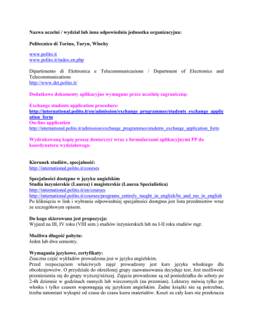 Nazwa uczelni / wydział lub inna odpowiednia jednostka organizacyjna: Politecnico di Torino, Turyn, Włochy www.polito.it www.polito.it/index.en.php Dipartimento di Elettronica e Telecommunicazione / Department of Electronics and Telecommunications http://www.det.polito.it/ Dodatkowe dokumenty aplikacyjne wymagane przez uczelnię zagraniczną: Exchange students application procedure: http://international.polito.it/en/admission/exchange_programmes/students_exchange_applic ation_form On-line application http://international.polito.it/admission/exchange_programmes/students_exchange_application_form Wydrukowaną kopię proszę dostarczyć wraz z formularzami aplikacyjnymi PP do koordynatora wydziałowego. Kierunek studiów, specjalność: http://international.polito.it/courses Specjalności dostępne w języku angielskim Studia inzynierskie (Laurea) i magisterskie (Laurea Specialistica) http://international.polito.it/en/courses http://international.polito.it/courses/programs_entirely_taught_in_english/bs_and_ms_in_english Po kliknięciu w link i wybraniu odpowiedniej specjalności dostępna jest lista przedmiotów wraz ze szczegółowym opisem. Do kogo skierowana jest propozycja: Wyjazd na III, IV roku (VIII sem.) studiów inżynierskich lub na I-II roku studiów mgr. Możliwa długość pobytu: Jeden lub dwa semestry. Wymagania językowe, certyfikaty: Znaczna część wykładów prowadzona jest w języku angielskim. Przed rozpoczęciem właściwych zajęć prowadzony jest kurs języka włoskiego dla obcokrajowców. O przydziale do określonej grupy zaawansowania decyduje test. Jest możliwość przeniesienia się do grupy wyższej/niższej. Zajęcia prowadzone są od poniedziałku do soboty po 2-4h dziennie w godzinach rannych lub wieczornych (na przemian). Lektorzy mówią tylko po włosku i tylko czasem wspomagają się językiem angielskim. Żadne książki nie są potrzebne, trzeba natomiast wykupić od czasu do czasu ksera materiałów. Koszt za cały kurs nie przekracza 5 euro. Kurs zakończony jest testem. Dla każdej grupy zaawansowania przygotowany jest oddzielny test. Sprawdzany jest z dużą wyrozumiałością i nie ma problemu z jego zaliczeniem. Kursy włoskiego prowadzone są również w czasie roku akademickiego (po dwie godziny dwa razy w tygodniu), nie są one zbyt mocno reklamowane i informacji o nich należy szukać po przyjeździe w tutejszym studium języków obcych (CLA) http://www2.polito.it/strutture/cla/ . Co do wykładów: Wykładowcy prowadzący przedmioty po angielsku są dobrze przygotowani. Materiały w języku angielskim są w większości dostępne poprzez internetowy serwis uczelni. Organizacja roku akademickiego: Zajęcia odbywają się mniej więcej od połowy września do połowy czerwca. Szczegóły na: http://international.polito.it/en/admission/exchange_programmes/2011_12_academic_calendar_a nd_deadlines Program studiów, ze wskazaniem dostępnych semestrów: Programy studiów dostępne są pod adresami: http://international.polito.it/en/courses Degrees entirely taught in English: http://international.polito.it/courses/programs_entirely_taught_in_english/bs_and_ms_in_english Warunki i możliwość uzyskania dyplomu: Brak możliwości podczas semestralnego czy rocznego wyjazdu jako Erasmus Exchange student/ Opłata za studia: Brak. Link (na stronach partnerów) do: ECTS Information Package: http://international.polito.it/en/ Financial Aid, Immigration Requirements and Accommodation http://international.polito.it/en/financial_aid INFORMACJE PRAKTYCZNE About Politecnico http://international.polito.it/en/about_politecnico International students portal: http://international.polito.it/en/ Optymalny przejazd/przelot: http://international.polito.it/en/about_politecnico/how_to_get_there Do Turynu najwygodniej i najtaniej dotrzeć tanimi liniami lotniczymi Ryanair oraz Wizzair. Obaj przewoźnicy kursują na trasie Poznań-Mediolan (Bergamo). Dalej należy jednak dotrzeć do centrum Mediolanu (bus), a stamtąd do Turynu (pociąg), co w sumie trwa 3h i kosztuje ok. 16€. Oczywiście zawsze można szukać lotów kombinowanych z ostatecznym lądowaniem w Turynie, np. Poznan-Londyn (Stansted) -Turyn. Polecam również śledzenie promocji LOT-u. Zdarzają się loty z Polski (Poznań, Katowice) bezpośrednio do Turynu za niecałe 170zł. Zakwaterowanie: Accommodation: http://international.polito.it/practical_information/accommodation/facilities_for_exchange_stude nts Aby otrzymać zakwaterowanie od uczelni, należy zaznaczyć to w formularzu elektronicznym na stronie PoliTO. Politecnico di Torino oferuje mieszkania w dwóch akademikach: Sponda Verde oraz Pensione Domus. Oba około 20 minut od uczelni. Domus to 2 piętra starej kamienicy, blisko centrum. Warunki zbliżone do polskich akademików: wspólna kuchnia, wspólna łazienka – niewygórowane, aczkolwiek tworzy poczucie wspólnoty Sponda to z kolei nowoczesny, 9-cio piętrowy blok o dość wysokim standardzie. Każde 3osobowe mieszkanie składa się z dwóch pokoi (jedynka i dwójka), dwóch łazienek, kuchni, przedpokoju, tarasu i balkonu. Wadą jest oczywiście wyższa cena (270€ za dwójkę, 360€ za jedynkę) i płatna pralnia, bywają też problemy z Internetem. Istnieje też możliwość wynajęcia mieszkania na własną rękę. Trzeba się sporo nachodzić, ale czasem można znaleźć coś dużo tańszego, już za ok. 220€. Koszty komunikacji, nie tylko miejskiej Bilet miesięczny studencki na wszystkie środki komunikacji miejskiej (tramwaje, autobusy, metro) kosztuje 18 euro. Należy wiedzieć, że jest to bilet dosłownie miesięczny: ważny jest tylko do końca miesiąca, w którym został pierwszy raz skasowany. Pojedynczy bilet studencki, ważny 70 minut (wystarczy na przejechanie całej linii), można się raz przesiąść, kosztuje 1€. Oto portal przydatny w planowaniu podróży po mieście: http://www.5t.torino.it/5t/en/percorsi/percorsi-ricerca.jsp? Pociągi – po Włoszech najlepiej 