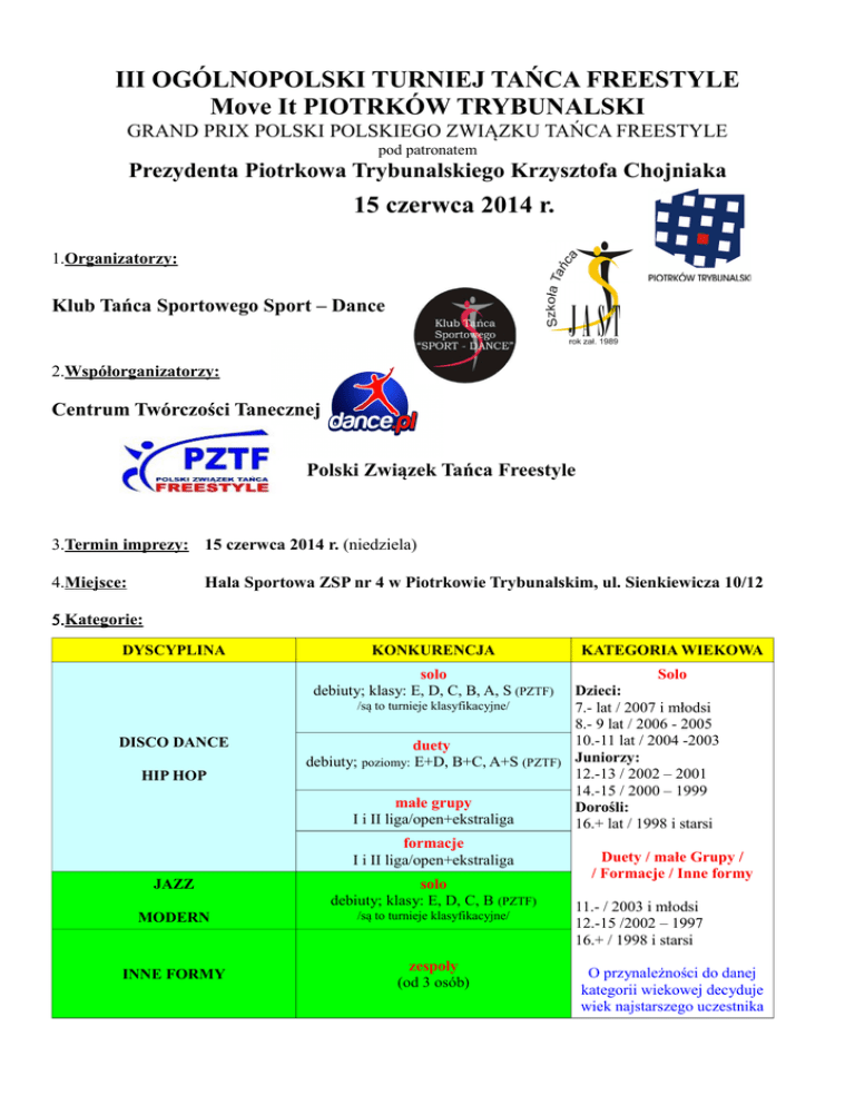 III OGÓLNOPOLSKI TURNIEJ TAŃCA FREESTYLE Move It PIOTRKÓW TRYBUNALSKI GRAND PRIX POLSKI POLSKIEGO ZWIĄZKU TAŃCA FREESTYLE pod patronatem Prezydenta Piotrkowa Trybunalskiego Krzysztofa Chojniaka 15 czerwca 2014 r. 1.Organizatorzy: Klub Tańca Sportowego Sport – Dance 2.Współorganizatorzy: Centrum Twórczości Tanecznej Polski Związek Tańca Freestyle 3.Termin imprezy: 15 czerwca 2014 r. (niedziela) 4.Miejsce: Hala Sportowa ZSP nr 4 w Piotrkowie Trybunalskim, ul. Sienkiewicza 10/12 5.Kategorie: DYSCYPLINA KONKURENCJA KATEGORIA WIEKOWA solo debiuty; klasy: E, D, C, B, A, S (PZTF) DISCO DANCE HIP HOP JAZZ MODERN INNE FORMY Solo Dzieci: /są to turnieje klasyfikacyjne/ 7.- lat / 2007 i młodsi 8.- 9 lat / 2006 - 2005 10.-11 lat / 2004 -2003 duety debiuty; poziomy: E+D, B+C, A+S (PZTF) Juniorzy: 12.-13 / 2002 – 2001 14.-15 / 2000 – 1999 małe grupy Dorośli: I i II liga/open+ekstraliga 16.+ lat / 1998 i starsi formacje Duety / małe Grupy / I i II liga/open+ekstraliga / Formacje / Inne formy solo debiuty; klasy: E, D, C, B (PZTF) 11.- / 2003 i młodsi /są to turnieje klasyfikacyjne/ zespoły (od 3 osób) 12.-15 /2002 – 1997 16.+ / 1998 i starsi O przynależności do danej kategorii wiekowej decyduje wiek najstarszego uczestnika Ligi zespołów (charakterystyka): 1. II liga – zespoły początkujące, zespoły szkolne. 2. I liga – zespoły średniozaawansowane (uczestnicy ogólnopolskich festiwali i turniejów). 3. Ekstraklasa + open – zespoły zaawansowane (uczestnicy MŚ, ME, PE, KM IDO, finaliści dużych festiwali). 6.Czas prezentacji: - solo, duety / Disco Dance, Hip-Hop - 1.00 min. (muzyka organizatora) - solo / Jazz Dance/Modern* - 1.00 min. (muzyka obowiązkowa) - mini formacja Disco Dance; Hip-Hop - 2.00 min. (muzyka organizatora) - mini formacja Disco Dance 11- - 1.30 min. (muzyka organizatora) - formacja Disco Dance; Hip-Hop - 2.30 – 3.00 min. (muzyka własna) - Inne Formy (Show Dance, mini Production / Inscenizacje, Production / Inscenizacja, Street Dance Show, itp.) - do 8.00 min. (muzyka własna) *informacje na temat JAZZ DANCE; MODERN udziela przewodnicząca Komisji ds. ART-u PZTF p.Beata Tyborowska – tel. 501 269 261 7.Cele: - Popularyzacja i propagowanie tańca nowoczesnego - Integracja grup tanecznych oraz instruktorów tańca - Rywalizacja fair play oraz wspólna zabawa uczestników - Wyłonienie najlepszych uczestników w poszczególnych kategoriach 8.Warunki uczestnictwa: - Przesłanie Karty Zgłoszenia (w załączeniu) w terminie do 9 czerwca 2014 r. na adres e-mail: [email protected] [email protected] [email protected] - uiszczenie opłaty startowej w wysokości: 40,00 PLN od osoby / konkurencję dla tancerzy PZTF i PFT 20,00 PLN od osoby / konkurencję (dla tancerzy PZTF za drugą i każdą następną konkurencję opłata wynosi 10,00 PLN) - Opłatę startową należy przesłać na konto: Klub Tańca Sportowego Sport – Dance PKO BP nr 07 1020 5242 0000 2402 0145 2911 z dopiskiem „III Move It Piotrków Tryb. ” wraz z adnotacją (klub i jakie konkurencje) – opłata. - Potwierdzenie swojego udziału w dniu imprezy zgodnie z Programem Ramowym. - Podporządkowanie się zaleceniom organizacyjnym, przepisom BHP i PPOŻ. - Podporządkowanie się przepisom szczegółowym turnieju. - Tańczenie w obuwiu sportowym, które nie niszczy parkietu. - UWAGA! 8 czerwca 2014 r. stanowi ostateczną datę wniesienia opłaty startowej. Po tym terminie organizator zastrzega sobie prawo nie przyjęcia zgłoszenia. W przypadku przyjęcia zgłoszenia po terminie – odpłatność za udział wzrasta dwukrotnie. - Uczestnik ma prawo wycofać się z udziału w turnieju na każdym etapie. W takim przypadku, jak również w przypadku niezakwalifikowania się do dalszych rund, opłata startowa nie podlega zwrotowi. - Turniej został zatwierdzony przez Zarząd PZTF i zostanie rozegrany zgodnie z Regulaminem. 9. Komisja sędziowska: Skład Komisji Sędziowskiej minimum 3 licencjonowanych sędziów PZTF. Przy obliczaniu wyników finału stosowany jest Skating System / w kategorii Debiuty – ocena szkolna. 10. Program turnieju: - 07:30 - 07:30 – 08:45 - 08:00 – 08:45 - 09:15 - do 13:00 - około 15:00 - 21:30 /szczegółowy program turnieju w dniu imprezy/ – otwarcie sali – rejestracja DISCO DANCE / INNE FORMY – próby parkietu dla zespołów – rozpoczęcie DISCO DANCE / INNE FORMY – rejestracja HIP HOP / JAZZ DANCE / MODERN – rozpoczęcie HIP HOP / JAZZ DANCE / MODERN – Planowane zakończenie * program ramowy może ulec zmianie; korekta programu pojawi się w dniu 10.06.2014 r. na stronie: www.dance.pl www.taniecfreestyle.pl 11. Nagrody: - Debiuty (solo i duety) – dyplomy - W klasach – dyplomy i medale dla finalistów nagrody finansowe kl. S – 1m.-120 zł; 2m.-80 zł; 3m.-60 zł; pozostałe miejsca finałowe-40 zł - Mini formacje – puchary (I – III) i dyplomy dla finalistów - zespoły taneczne – puchar i dyplom dla każdego zespołu nagrody finansowe - małe grupy Ekstraliga* – 1m.-200 zł; 2m.-150 zł; 3m.-100 zł - formacje Ekstraliga* – 1m.-500 zł; 2m.-300 zł; 3m.-200 zł - certyfikaty uczestnictwa dla wszystkich klubów Punkty, zdobyte przez tancerzy PZTF, zaliczone będą do punktacji Grand Prix Polski PZTF za rok 2014. Nagrody finansowe ufundowane są przez Polski Związek Tańca Freestyle i przeznaczone są dla tancerzy zrzeszonych w PZTF oraz przekazywane są na konto członka zwyczajnego PZTF. 12. Postanowienia końcowe: - Protesty jedynie w formie pisemnej należy składać do Sędziego Głównego najpóźniej 15 min. po ogłoszeniu wyników. - Protest rozpatrywany jest przez Sędziego Głównego, Przewodniczącego Komisji Skrutacyjnej, Kierownika Organizacyjnego, po wpłaceniu kaucji w wys. 200 zł. W przypadku nieuznania protestu kaucja nie podlega zwrotowi. - Organizator zastrzega sobie prawo do odwołania albo połączenia kategorii wiekowych w przypadku małej ilości uczestników w danej dyscyplinie. 13. Informacje dod