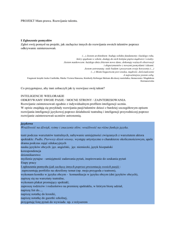 PROJEKT Mam prawa. Rozwijanie talentu. I Zgłoszenie pomysłów Zgłoś swój pomysł na projekt, jak zachęcisz innych do rozwijania swoich talentów poprzez odkrywanie zainteresowań. (…) Jestem architektem: buduję solidne fundamenty i każdego roku, który spędzam w szkole, dodaję do nich kolejne piętra mądrości i wiedzy. Jestem naukowcem: każdego dnia zbieram nowe dane, dokonuję ważnych obserwacji i eksperymentów z nowymi pomysłami i ideami. Jestem astronautą: stale badam i poszerzam swoje horyzonty.(…) (…) Moim bogactwem jest wiedza, mądrość, doświadczenie A najważniejsze jestem sobą. Fragment książki Jacka Canfielda, Marka Victora Hansena, Kimberly Kirberger Balsam dla duszy nastolatka, tłumaczenie: Magdalena Hermanowska Co przygotujesz, aby inni zobaczyli jak ty rozwijasz swój talent? INTELIGENCJE WIELORAKIE ODKRYWAMY SWOJE PASJE / MOCNE STRONY / ZAINTERESOWANIA Rozwijanie zainteresowań zgodnie z indywidualnym profilem inteligencji ucznia. W opisie znajdują się przykłady rozwijania pasji/talentów dzieci z bardziej szczegółowym opisem rozwijania inteligencji językowej poprzez działalność teatralną i inteligencji przyrodniczej poprzez rozwijanie zainteresowań uczniów astronomią. językowa Wrażliwość na dźwięk, rytmy i znaczenie słów; wrażliwość na różne funkcje języka. teatr podczas warsztatów teatralnych, nabywanie umiejętności związanych z warsztatem aktora spektakle: Pudło, Pierwszy dzień wiosny, występy artystyczne o charakterze okolicznościowym, apele drama podczas zajęć edukacyjnych nauka języków obcych: jęz. angielski, jęz. niemiecki, język hiszpański korespondencja dziennikarstwo myślenie pytajne - umiejętność zadawania pytań, inspirowanie do szukania pytań Etapy pracy I zgłoszenie pomysłu (jak zachęcę innych poprzez prezentację swoich pasji) : zaprezentuję portfolio na określony temat (np. moja przygoda z teatrem), wykonam komiks w języku obcym - komunikacja w języku obcym (dni języków obcych), zapiszę się na warsztaty teatralne, wykonam plakat promujący spektakl, zaproszę rodziców i rodzeństwo na premierę spektaklu, w którym biorę udział, napiszę list do..., napiszę notatkę do kroniki, napiszę notatkę do gazetki szkolnej, przygotuję listę pytań do wywiadu np. z reżyserem II Wybór pomysłu Porozmawiajcie o tym, który pomysł najbardziej wam się podoba, podczas którego najwięcej się nauczycie, który jest możliwy do zrealizowania. Wymyślcie tytuł projektu. Określcie cel waszego projektu. III Ustalenie działań Co zrobicie? W jaki sposób to zrobicie? Kto to zrobi? Kiedy i gdzie? IV Plan projektu opisujemy plan V Realizacja projektu VI Przygotowanie prezentacji wyników VII Prezentacja projektu 1. Samoocena 2. Prezentacja efektu pracy VIII. Ocena projektu. PRZYKŁAD PROJEKTU ROZWIJANIA INTELIGENCJI JĘZYKOWEJ POPRZEZ DZIAŁALNOŚĆ TEATRALNĄ Etapy pracy I zgłoszenie pomysłu (jak zachęcę innych poprzez prezentację swoich pasji) : zapiszę się na warsztaty teatralne, wezmę udział w spektaklu, zaprezentuję portfolio na określony temat (np. moja przygoda z teatrem), wykonam plakat promujący spektakl, zaproszę rodziców i rodzeństwo na premierę spektaklu, w którym biorę udział, napiszę notatkę do kroniki, napiszę notatkę do gazetki szkolnej, przygotuję listę pytań do wywiadu np. z reżyserem Spektakle: Pierwszy dzień wiosny Antynikotynowa petycja Pudło II Wybór pomysłu Porozmawiajcie o tym, który pomysł najbardziej wam się podoba, podczas którego najwięcej się nauczycie, który jest możliwy do zrealizowania. Wybraliśmy spektakl Pudło, ze względu na możliwość pracy z aktorem i reżyserem, czas spotkań (soboty), możliwość pracy przez kilka miesięcy nad jednym spektaklem Wymyślcie tytuł projektu. Nasza przygoda z teatrem. Spektakl Pudło. Określcie cel waszego projektu. Rozwijanie warsztatu aktora, Nabycie umiejętności umożliwiających działalność recytatorską i teatralną. Kształtowanie właściwej dykcji, modulacji głosu, mówienia z różnymi intencjami, wyrażania uczuć i stanów emocjonalnych przez gesty, ruch, mimikę, odpowiednie poruszanie się na scenie. Ćwiczenia w wymowie głosek, zbitek spółgłoskowych, uproszczeń, upodobnień, trudnych połączeń międzywyrazowych. Wprowadzenie zasad poprawnego akcentowania wyrazów – stosowanie zasad akcentu logicznego i intencjonalnego. Ćwiczenia uświadamiające możliwości poszerzenia zakresu interpretacji za pomocą akcentu intencjonalnego. Ćwiczenia z tonem wypowiedzi i melodia zdania. Zabawy ułatwiające nawiązywanie kontaktów wśród grupy rówieśników improwizacje taneczno- rytmiczne, pantomima uczuć, sytuacji opowiadanie ciałem, głosem, „oswajanie” przestrzeni Praca nad kulturą języka: bogacenie zasobu słownictwa, głosowa interpretacja wybranych poetyckich i fragmentów prozy, próby interpretacji wokalnej. na podst. Podstawy Programowej Ed. polonistyczna, klasa III w zakresie umiejętności wypowiadania się w małych formach teatralnych uczestniczy w zabawie teatralnej, ilustruje mimiką, gestem, ruchem zachowania bohatera literackiego lub wymyślonego, rozumie umowne znaczenie rekwizytu i umie posłużyć się nim w odgrywanej scence, czyta teksty i recytuje wiersze, z uwzględnieniem interpunkcji i intonacji, odtwarza z pamięci teksty dla dzieci, np. wiersze, piosenki, fragmenty prozy. III Ustalenie działań Co zrobicie? Przygotowanie i praca nad scenariuszem Regularne próby Przygotowanie scenografii Wykonanie kostiumów W jaki sposób to zrobicie? Podział na grupy i przydzielenie zadań: Grupa scenografów, Grupa plastyczna, Grupa aktorska. Kto to zrobi? Uczniowie podzieleni na grupy zgodnie z indywidualnymi predyspozycjami, talentami pod kierunkiem reżysera. Kiedy i gdzie? Szkoła, świetlica zaadoptowana na salę teatralną IV Plan projektu opisujemy plan praca ze scenariuszem, przydział ról, projekt scenografii 