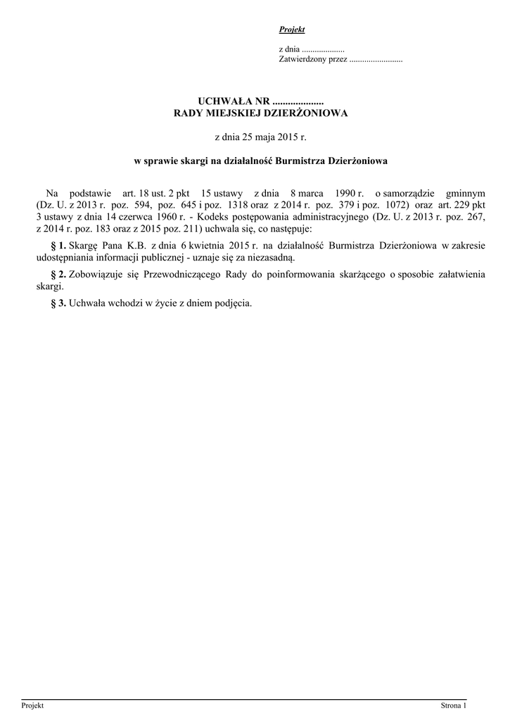 Projekt z dnia .................... Zatwierdzony przez ......................... UCHWAŁA NR .................... RADY MIEJSKIEJ DZIERŻONIOWA z dnia 25 maja 2015 r. w sprawie skargi na działalność Burmistrza Dzierżoniowa Na podstawie art. 18 ust. 2 pkt 15 ustawy z dnia 8 marca 1990 r. o samorządzie gminnym (Dz. U. z 2013 r. poz. 594, poz. 645 i poz. 1318 oraz z 2014 r. poz. 379 i poz. 1072) oraz art. 229 pkt 3 ustawy z dnia 14 czerwca 1960 r. - Kodeks postępowania administracyjnego (Dz. U. z 2013 r. poz. 267, z 2014 r. poz. 183 oraz z 2015 poz. 211) uchwala się, co następuje: § 1. Skargę Pana K.B. z dnia 6 kwietnia 2015 r. na działalność Burmistrza Dzierżoniowa w zakresie udostępniania informacji publicznej - uznaje się za niezasadną. § 2. Zobowiązuje się Przewodniczącego Rady do poinformowania skarżącego o sposobie załatwienia skargi. § 3. Uchwała wchodzi w życie z dniem podjęcia. Projekt Strona 1 Uzasadnienie Uzasadnienie do projektu uchwały Rady Miejskiej Dzierżoniowa Stanowisko Komisji Rewizyjnej Rady Miejskiej Dzierżoniowa w sprawie skargi z dnia 6 kwietnia 2015 r. na działania Burmistrza Dzierżoniowa: W dniu 6 kwietnia 2015 r. na adres e-mail Urzędu Miasta w Dzierżoniowie wpłynęło pismo Pana K. B., które zawiera znamiona skargi na działalność Burmistrza Dzierżoniowa w rozumieniu art. 227 Kodeksu postępowania administracyjnego oraz wniosku o udostępnienie informacji publicznej. Pismo to zostało przekazane - w zakresie skargi - według właściwości Radzie Miejskiej Dzierżoniowa pismem z dnia 17 kwietnia br. przez Burmistrza Dariusza Kucharskiego. Przewodniczący Rady skierował skargę do Komisji Rewizyjnej w celu przeprowadzenia postępowania wyjaśniającego, zbadania zarzutów w niej zawartych, przygotowania opinii i projektu uchwały w tej sprawie. Przewodniczący Rady zwrócił się jednocześnie do Burmistrza Dzierżoniowa o przygotowanie wyjaśnień na zarzuty ujęte w skardze. Skarżący informuje, że cyt. „Wojewódzki Sąd Administracyjny we Wrocławiu w postępowaniu sygn. akt IV SAB/Wr 190/13 oceniał działalność Burmistrza Dzierżoniowa”. Skarżący twierdzi, że cyt. „w treści tego rozstrzygnięcia Wojewódzki Sad Administracyjny we Wrocławiu w sposób szczegółowy przedstawia jak Burmistrz Dzierżoniowa naruszył prawo człowieka do informacji”. Na posiedzeniu w dniu 5 maja 2015 r., po wcześniejszym zapoznaniu się z treścią skargi (21 kwietnia br.) oraz po zapoznaniu się z wyjaśnieniami Burmistrza z dnia 30 kwietnia 2015 r. i wysłuchaniu wyjaśnień Pani Anny Grochowiny, Sekretarz Miasta - komisja jednogłośnie stwierdziła, że zarzuty w skardze są bezzasadne. Z udzielanych wyjaśnień wynika, że postępowanie przed WSA we Wrocławiu sygn. akt IV SAB/Wr 190/13 dotyczyło skargi Stowarzyszenia „DUAE ROTAE” w Dzierżoniowie zwane dalej Stowarzyszeniem na bezczynność organu w sprawie o udostępnienie informacji publicznej. Wniosek Stowarzyszenia z dnia 8 grudnia 2012 r. dotyczył udostępnienie informacji publicznej w zakresie: - „skany wszystkich dokumentów urzędowych związanych realizacją strony internetowej przez firmę VOBACOM z Torunia, – skany wszystkich dokumentów urzędowych (umowy, notatki, opinie, przelewy bankowe, pisma, wystąpienia i inne) związanych ze sprzedażą ciepłowni miejskiej w Dzierżoniowie w 2012 roku.” Tryb postępowania w tej sprawie był następujący: Informacja, o której udostępnienie wnioskowało Stowarzyszenie jest informacją tzw. przetworzoną. W związku z tym organ na podstawie art.3 ust.1 pkt 1 ustawy o dostępie do informacji publicznej w dniu 19 grudnia 2012 r. wezwał Stowarzyszenie do uwiarygodnienia szczególnie istotnego interesu publicznego uzasadniającego udostępnienie żądanych informacji, czego Stowarzyszenie w wyznaczonym terminie nie dokonało, składając w dniu 11 lutego 2013 r. do WSA we Wrocławiu skargę na bezczynność organu. Wyrokiem z dnia 14 maja 2013 r., sygn. akt IV SAB/Wr 41/13 WSA we Wrocławiu zobowiązało Burmistrza do rozpatrzenia wniosku Stowarzyszenia. Prawomocne orzeczenie WSA w tej sprawie zostało doręczone do Urzędu Miasta w Dzierżoniowie w dniu 22 lipca 2014 r. Po otrzymaniu w/w orzeczenia organ w dniu 29 lipca 2013 r. wezwał Stowarzyszenie do sprecyzowania wniosku ze względu na umożliwienie organowi prawidłowej realizacji wniosku oraz wykazania szczególnie istotnego interesu publicznego uzasadniającego potrzebę uzyskania żądanej informacji. Pismem z dnia 30 lipca 2013 r. Stowarzyszenie odmówiło uwiarygodnienia szczególnego interesu publicznego w odniesieniu do wniosku o udostępnienie skanów dokumentów urzędowych dotyczących sprzedaży ciepłowni miejskiej w Dzierżoniowie. Pismem z dnia 6 sierpnia 2013 r. organ powiadomił Stowarzyszenie o wydłużeniu terminu do dnia 30 września 2013 r. na udzielenie odpowiedzi odnośnie pkt. 2 wniosku tj. informacji w zakresie “ skany wszystkich dokumentów urzędowych (umowy/notatki/opinie/przelewy bankowe/pisma/wystąpienia i inne) związanych ze sprzedażą ciepłowni miejskiej w Dzierżoniowie w 2012 roku.” z uwagi na konieczność analizy dokumentacji pod kątem możliwości jej udostępnienia. Decyzją administracyjną z dnia 7 sierpnia 2013 r. Burmistrz Dzierżoniowa po dokonaniu analizy posiadanej dokumentacji odmówił Stowarzyszeniu udostępnienia informacji publicznej w zakresie pkt.1 wniosku tj. „skany wszystkich dokumentów urzędowych związanych realizacją strony internetowej przez firmę VOBACOM z Torunia”. Stowarzyszenie wniosło odwołanie od decyzji Burmistrza Dzierżoniowa do Projekt Strona 1 Samorządowego Kolegium Odwoławczego w Wałbrzychu. SKO w Wałbrzychu decyzją z dnia 27 sierpnia 2013 r. uchyliło decyzję Burmistrza Miasta z dnia 7 sierpnia 2013 r. i przekazało sprawę do ponownego rozpoznania. Pismem z dnia 26 września 2013 r. organ udostępnił Stowarzyszeniu skany wnioskowanych dokumentów związanyc