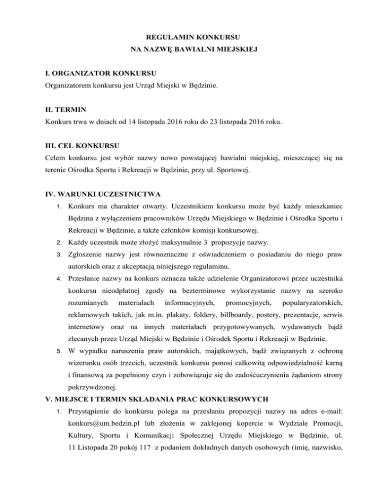 REGULAMIN KONKURSU NA NAZWĘ BAWIALNI MIEJSKIEJ I. ORGANIZATOR KONKURSU Organizatorem konkursu jest Urząd Miejski w Będzinie. II. TERMIN Konkurs trwa w dniach od 14 listopada 2016 roku do 23 listopada 2016 roku. III. CEL KONKURSU Celem konkursu jest wybór nazwy nowo powstającej bawialni miejskiej, mieszczącej się na terenie Ośrodka Sportu i Rekreacji w Będzinie, przy ul. Sportowej. IV. WARUNKI UCZESTNICTWA 1. Konkurs ma charakter otwarty. Uczestnikiem konkursu może być każdy mieszkaniec Będzina z wyłączeniem pracowników Urzędu Miejskiego w Będzinie i Ośrodka Sportu i Rekreacji w Będzinie, a także członków komisji konkursowej. 2. Każdy uczestnik może złożyć maksymalnie 3 propozycje nazwy. 3. Zgłoszenie nazwy jest równoznaczne z oświadczeniem o posiadaniu do niego praw autorskich oraz z akceptacją niniejszego regulaminu. 4. Przesłanie nazwy na konkurs oznacza także udzielenie Organizatorowi przez uczestnika konkursu nieodpłatnej zgody na bezterminowe wykorzystanie nazwy na szeroko rozumianych materiałach informacyjnych, promocyjnych, popularyzatorskich, reklamowych takich, jak m.in. plakaty, foldery, billboardy, postery, prezentacje, serwis internetowy oraz na innych materiałach przygotowywanych, wydawanych bądź zlecanych przez Urząd Miejski w Będzinie i Ośrodek Sportu i Rekreacji w Będzinie. 5. W wypadku naruszenia praw autorskich, majątkowych, bądź związanych z ochroną wizerunku osób trzecich, uczestnik konkursu ponosi całkowitą odpowiedzialność karną i finansową za popełniony czyn i zobowiązuje się do zadośćuczynienia żądaniom strony pokrzywdzonej. V. MIEJSCE I TERMIN SKŁADANIA PRAC KONKURSOWYCH 1. Przystąpienie do konkursu polega na przesłaniu propozycji nazwy na adres e-mail: [email protected] lub złożenia w zaklejonej kopercie w Wydziale Promocji, Kultury, Sportu i Komunikacji Społecznej Urzędu Miejskiego w Będzinie, ul. 11 Listopada 20 pokój 117 z podaniem dokładnych danych osobowych (imię, nazwisko, adres zamieszkania) oraz kontaktowych (adres e-mail, telefon) z dopiskiem „Konkurs na nazwę bawialni”, w terminie do 23 listopada 2016 roku do godz. 9.00. 2. Komisja konkursowa dokona oceny propozycji w terminie do dnia 28 listopada 2016 roku. 3. Wyniki konkursu są ostateczne i nie podlegają odwołaniu. 4. Zwycięzca konkursu zostanie powiadomiony o wygranej oraz o terminie i miejscu wręczenia nagrody telefonicznie lub za pomocą poczty elektronicznej. 5. Organizator zastrzega sobie prawo do zakończenia konkursu bez wybrania najlepszej pracy bez podania przyczyny, a co za tym idzie bez przyznania nagrody głównej. VII. PRZETWARZANIE DANYCH OSOBOWYCH 1. Administratorem danych osobowych udostępnionych przez uczestników konkursu jest Organizator. Dane osobowe uczestników konkursu będą przetwarzane wyłącznie w celu prawidłowego przeprowadzenia konkursu. 2. Przekazanie przez Uczestników danych osobowych Organizatorowi ma charakter dobrowolny. Uczestnikom przysługuje prawo wglądu do swoich danych oraz możliwość ich poprawiania. VIII. NAGRODA 1. Nagrodą główną w konkursie jest tablet i możliwość zorganizowania imprezy urodzinowej w bawialni (bezpłatne wynajęcie sali urodzinowej i wstęp do bawialni dla gości urodzinowych dla maks. 20 osób – poczęstunek we własnym zakresie). 2. Urząd Miejski w Będzinie i Ośrodek Sportu i Rekreacji w Będzinie mają prawo wykorzystywać nagrodzoną propozycję w dowolny sposób, w tym także łączyć nazwę z innym elementem - logo. 3. Nagroda zostanie wręczona zwycięzcy konkursu w czasie i miejscu wyznaczonym przez Organizatora, nie później niż w terminie do 30 dni od daty zakończenia konkursu. 4. Organizator nie ponosi odpowiedzialności za nieprawidłowe dane podane w zgłoszeniu, w szczególności za zmianę danych osobowych uniemożliwiającą odszukanie uczestnika i/lub wręczenie nagrody. 5. W przypadku, gdy nagrodzona osoba nie odbierze nagrody w określonym w wysłanym powiadomieniu miejscu i terminie, prawo do otrzymania nagrody przez danego zwycięzcę wygasa. IX. POSTANOWIENIA KOŃCOWE 1. Organizator zastrzega sobie prawo do ostatecznej interpretacji niniejszego regulaminu konkursu. 2. Organizator zastrzega sobie prawo do wprowadzania zmian w regulaminie konkursu. 3. Zgłoszenie nazwy do konkursu jest równoznaczne z wyrażeniem zgody przez uczestnika na przetwarzanie danych osobowych przez organizatora konkursu w celach wynikających z regulaminu tego konkursu, zgodnie z ustawą z dnia 29 sierpnia 1997 roku o ochronie danych osobowych (Dz. U. z 1997 r., nr 133, poz. 883 z późniejszymi zmianami).