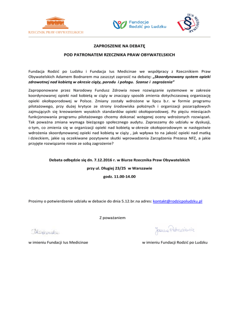 ZAPROSZENIE NA DEBATĘ POD PATRONATEM RZECZNIKA PRAW OBYWATELSKICH Fundacja Rodzić po Ludzku i Fundacja Ius Medicinae we współpracy z Rzecznikiem Praw Obywatelskich Adamem Bodnarem ma zaszczyt zaprosić na debatę: „Skoordynowany system opieki zdrowotnej nad kobietą w okresie ciąży, porodu i połogu. Szanse i zagrożenia” Zaproponowane przez Narodowy Fundusz Zdrowia nowe rozwiązanie systemowe w zakresie koordynowanej opieki nad kobietą w ciąży w znaczący sposób zmienia dotychczasową organizację opieki okołoporodowej w Polsce. Zmiany zostały wdrożone w lipcu b.r. w formie programu pilotażowego, przy dużej krytyce ze strony środowiska położnych i organizacji pozarządowych zajmujących się kreowaniem wysokich standardów opieki okołoporodowej. Po pięciu miesiącach funkcjonowania programu pilotażowego chcemy dokonać wstępnej oceny wdrożonych rozwiązań. Tak poważna zmiana wymaga bieżącego społecznego audytu. Zapraszamy do udziału w dyskusji, o tym, co zmienia się w organizacji opieki nad kobietą w okresie okołoporodowym w następstwie wdrożenia skoordynowanej opieki nad kobietą w ciąży , jak wpływa to na jakość opieki nad matką i dzieckiem, jakie są oczekiwane pozytywne skutki wprowadzenia Zarządzenia Prezesa NFZ, a jakie przyjęte rozwiązanie niesie ze sobą zagrożenie? Debata odbędzie się dn. 7.12.2016 r. w Biurze Rzecznika Praw Obywatelskich przy ul. Długiej 23/25 w Warszawie godz. 11.00-14.00 Prosimy o potwierdzenie udziału w debacie do dnia 5.12.br.na adres: [email protected] Z poważaniem w imieniu Fundacji Ius Medicinae w imieniu Fundacji Rodzić po Ludzku