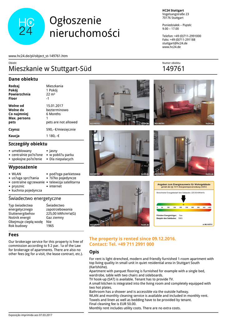 Ogłoszenie nieruchomości HC24 Stuttgart Vogelsangstraße 23 70176 Stuttgart Poniedziałek – Piątek: 9.00 – 17.00 Telefon: +49 (0)711-2991000 Faks: +49 (0)711-291188 [email protected] www.hc24.de www.hc24.de/pl/object_st-149761.htm Obiekt Numer obiektu Mieszkanie w Stuttgart-Süd 149761 Dane obiektu Rodzaj Pokój Powierzchnia Floor Mieszkania 1 Pokój 22 m² -1 Wolne od Wolne do Co najmniej Max. persons pets 15.01.2017 bezterminowo 6 Months 1 pets are not allowed Czynsz 590,- €/miesięcznie Kaucja 1 180,- € Szczegóły obiektu umeblowany centralnie po?o?one spokojne po?o?enie jasny w pobli?u parku Dla niepalacych Wyposażenie WLAN us?uga sprz?tania centralne ogrzewanie prysznic kuchnia pojedyncza pod?oga parkietowa ?ó?ko pojedyncze telewizja satelitarna internet Świadectwo energetyczne Typ świadectwa energetycznego Sluttenergibehov Nośnik energii Obejmuje ciepłą wodę Rok budowy Świadectwo zapotrzebowania 225,00 kWh/m²a(G) Gaz ziemny Nie 1965 Fees Our brokerage service for this property is free of commission according to § 2 par. 1a of the Law for brokerage of apartments. There are also no other fees (eg for a visit, the lease contract, etc.). The property is rented since 09.12.2016. Contact: Tel. +49 711 2991 000 Opis For rent is light drenched, modern and friendly furnished 1-room apartment with top living quality in small unit in quiet residential area in Stuttgart South (Karlshöhe). Apartment with parquet flooring is furnished for example with a single bed, wardrobe, table with two chairs and sideboards. TV hook-up (SAT) is available. Tenant has to provide TV. A small kitchen is integrated into the living room and completely equipped with two hot plates. Bathroom has a shower and is accessible via the outside hallway. WLAN and monthly cleaning service is available and included in monthly rent. Towels and linen as well as bedding have to be provided by tenant. Final cleaning fee is EUR 50.00. Monthly rent includes utility costs. There are no extra costs. Exposição imprimida aos 07.03.2017 Powered by TCPDF (www.tcpdf.org)