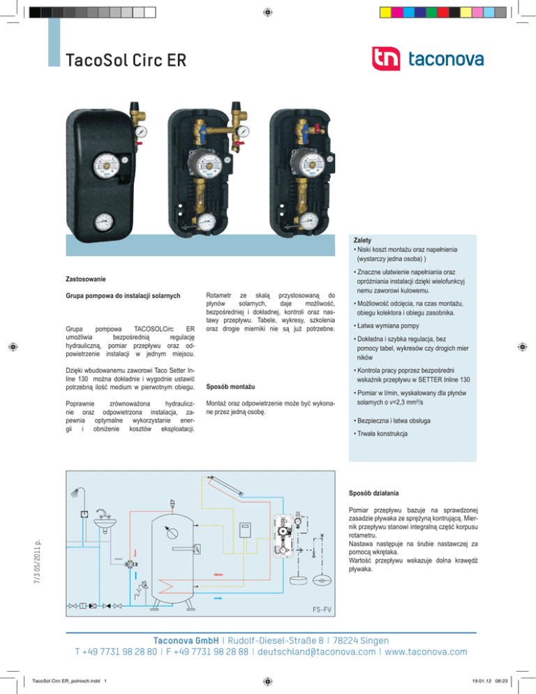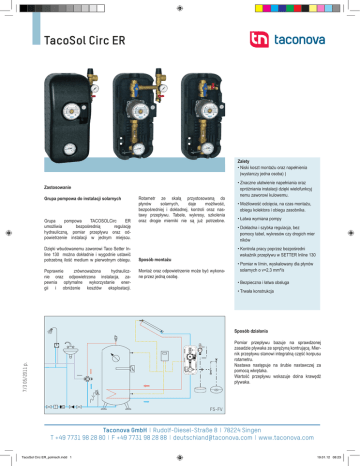 TacoSol Circ ER Zalety • Niski koszt montażu oraz napełnienia (wystarczy jedna osoba) ) Zastosowanie Grupa pompowa do instalacji solarnych Grupa pompowa TACOSOLCirc ER umożliwia bezpośrednią regulację hydrauliczną, pomiar przepływu oraz odpowietrzenie instalacji w jednym miejscu. Dzięki wbudowanemu zaworowi Taco Setter Inline 130 można dokładnie i wygodnie ustawić potrzebną ilość medium w pierwotnym obiegu. Poprawnie zrównoważona hydraulicznie oraz odpowietrzona instalacja, zapewnia optymalne wykorzystanie energii i obniżenie kosztów eksploatacji. Rotametr ze skalą przystosowaną do płynów solarnych, daje możliwość, bezpośredniej i dokładnej, kontroli oraz nastawy przepływu. Tabele, wykresy, szkolenia oraz drogie mierniki nie są już potrzebne. • Znaczne ułatwienie napełniania oraz opróżniania instalacji dzięki wielofunkcyj nemu zaworowi kulowemu. • Możliowość odcięcia, na czas montażu, obiegu kolektora i obiegu zasobnika. • Łatwa wymiana pompy • Dokładna i szybka regulacja, bez pomocy tabel, wykresów czy drogich mier ników • Kontrola pracy poprzez bezpośredni wskaźnik przepływu w SETTER Inline 130 Sposób montażu Montaż oraz odpowietrzenie może być wykonane przez jedną osobę. • Pomiar w l/min, wyskalowany dla płynów solarnych o ν=2,3 mm²/s • Bezpieczna i łatwa obsługa • Trwała konstrukcja Sposób działania 7/3 05/2011 p. Pomiar przepływu bazuje na sprawdzonej zasadzie pływaka ze sprężyną kontrującą. Miernik przepływu stanowi integralną część korpusu rotametru. Nastawa następuje na śrubie nastawczej za pomocą wkrętaka. Wartość przepływu wskazuje dolna krawędź pływaka. FS-FV Taconova GmbH Rudolf-Diesel-Straße 8 78224 Singen T +49 7731 98 28 80 F +49 7731 98 28 88 [email protected] www.taconova.com TacoSol Circ ER_polnisch.indd 1 19.01.12 08:23 TacoSol Circ ER 1-drogowa grupa pompowa z grupą bezpieczeństwa Tekst przetargowy Dostępne typy TacoSol Circ ER, wersja 1-drogowa z grupą bezpieczeństwa Kompletna i gotowa do podłączenia grupa Zawiera: Rurę powrotną ( strona pompy) pompowa TacoSol Circ do cyrkulacji płynu solarnego, włącznie z elementami mocującymi. Wbudowany zawór TacoSetter Inline 130 z Numer katalogowy Zakres pomiaru Kvs1) pompa obiegowa bezpośrednim odczytem wartości przepływu 270.1006.345 1,5 - 6,0 l/min 1,5 WILO ST 20/6 w l/min. 4,0 - 16 l/min 3,3 WILO ST 20/6 Zintegrowany w zaworze kulowym, metalowy 270.1016.345 ogranicznik przepływów zwrotnych, zabezpi- 270.1028.345 8,0 - 28 l/min 3,5 WILO ST 20/6 eczony przed wypadnięciem i blokowaniem położenia. Zoptymalizowana do zastosowania w in- 1) kvs [m3/h] bei υ = 1 mm2/s stalacjach solarnych. Bezpośredni odczyt 2) Skala odczytu dla wody (mieszaniny glikolu z v = 2,3 mm 2/s przepływu na rotametrze, bez tabel, wykresów i dodatkowych mierników, przy lepkości medium ν=2,3 mm²/s. Dane techniczne Maksymalna temperatura robocza: 110°C Rysunek 120 1 Maksymalne ciśnienie robocze: 8 bar - Zawór bezpieczeństwa: 6 bar Wartość współczynnika kvs i zakres pomiaru patrz tabela dostępnych typów. Korpusy armatury z mosiądzu Części wewnętrzne ze stali nierdzewnej, mosiądzu i tworzywa sztucznego 34 7 4 53 2 Szybka wziernika ze szkła borosilikatowego 51 O-Ring uszczelki: EPDM Płaskie uszczelki: do układów solarnych, odporne na podwyższoną temperatu 2 3 31 13 Materiał izolacji: EPP (polipropylen spieniony) Gwint zgodny z ISO 228 Dokładność pomiaru +/-10 % (wartości końcowej) 50 51 79 80 30 0 3 Ø 12,5 47 98 Przepływające medium • Mieszanka wody i ogólnie stosowanych środków antykorozyjnych i chroniących przed zamarzaniem (Wyskalowany pomiar dla lepkości płynów ν=2,3 mm²/s) • Woda grzewcza • Woda lodowa 190 1 Gwint zewnętrzny ISO 228, G 1“ ( przewód do kolektora) 2 Gwint zewnętrzny ISO 228, G 1“ ( przewód od zbiornika) 3 Gwint zewnętrzny ISO 228, G 3/4“ ( przewód naczynia zbiorczego) 7/3 05/2011 p. 147 Taconova GmbH Rudolf-Diesel-Straße 8 78224 Singen T +49 7731 98 28 80 F +49 7731 98 28 88 [email protected] www.taconova.com TacoSol Circ ER_polnisch.indd 2 19.01.12 08:23 TacoSol Circ ER Tekst ogłoszenia Przegląd typów TacoSol Circ ER, Wersja 1-rurowa Gotowa do załączenia Stacja solarna Taco- Zawiera: Rurę powrotną ( strona pompy) Sol Circ ER do cyrkulacji i wentylacji w obiegu solarnym, płynów solarnych włącznie z Numer katalogowy Zakres pomianie 3) materiałem mocującym. 270.1006.000 1,5 - 6,0 l/min 1,5 Przeznaczona do równoległego i szeregowe270.1016.000 4,0 - 16 l/min 3,3 go połączenia z TacoSol Circ ZR do podnisie270.1028.000 8,0 - 28 l/min 3,5 nia wzrostu wydajności. Kvs1) pompa obiegowa WILO ST 20/6 WILO ST 20/6 WILO ST 20/6 Dzięki wbudowanemu zaworowi TacoSetter Inline 130 z bezpośrednim wykazem nastwio1) kvs m3/h v = 1 mm 2/s nej ilości przepływu w l/min. Wbudowany metaliczny izolator przepływów zwrotnych w zaworze kulowym. Zoptymalizowana do zastosowania w obszarze Solarów. Zmierzone wartości przy lepkości Medium ν=2,3 mm²/s. bez pomocy tabel, wykresów czy dodatkowych drogich mierników, bezpośrednio do odczytania na wzierniku podczas nastawiania. 2) Skala odczytu dla płynu solarnego v = 2,3 mm 2/s Rysunek 1 Dane techniczne 74 Maksymalna temperatura pracy: 110 °C Maksymalne ciśnienie pracy: 8 bar Wartość współczynnika kvs i zakres pomiaru zobacz tabelę rodzaje typów 34 7 51 Części wewnętrzne ze stali nierdzewnej, mosiądzu i tworzywa sztucznego Szybka wziernika ze szkła borosilikatowego 13 50 7/3 05/2011 p. Materiał izolacji: EPP Przepływające czynniki • Woda zawierająca ogólnie stosowane środki antykorozyjne i chroniące przed zamarzaniem (Wyskalowany pomiar dla lepkości płynów ν=2,3 mm²/s) • Woda grzewcza 31 Płaskie uszczelki: odporne na wysoką temperaturę 3 2 51 79 80 30 0 3 Ø 12,5 O-Ring uszczelki: EPDM Gwint zgodnie wg.ISO 228 Dokładność pomiaru TacoSetter Inline 130 +/-10 % (od wartości koń