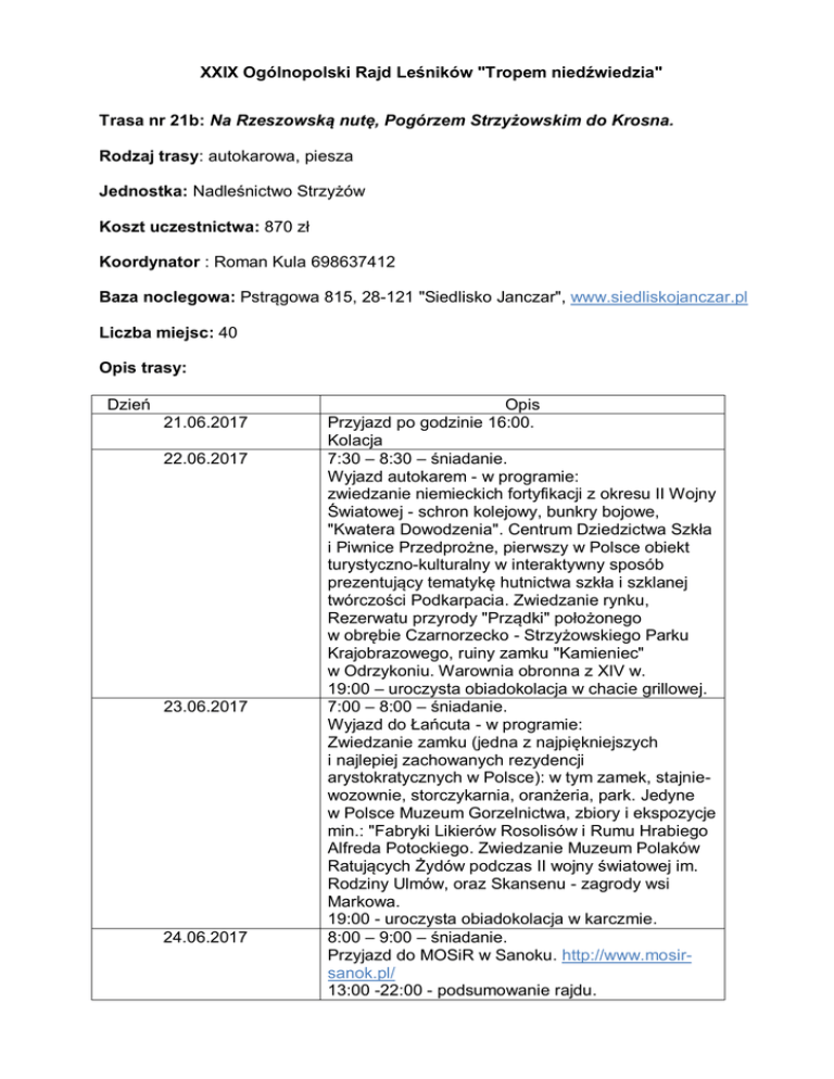 XXIX Ogólnopolski Rajd Leśników "Tropem niedźwiedzia" Trasa nr 21b: Na Rzeszowską nutę, Pogórzem Strzyżowskim do Krosna. Rodzaj trasy: autokarowa, piesza Jednostka: Nadleśnictwo Strzyżów Koszt uczestnictwa: 870 zł Koordynator : Roman Kula 698637412 Baza noclegowa: Pstrągowa 815, 28-121 "Siedlisko Janczar", www.siedliskojanczar.pl Liczba miejsc: 40 Opis trasy: Dzień 21.06.2017 22.06.2017 23.06.2017 24.06.2017 Opis Przyjazd po godzinie 16:00. Kolacja 7:30 – 8:30 – śniadanie. Wyjazd autokarem - w programie: zwiedzanie niemieckich fortyfikacji z okresu II Wojny Światowej - schron kolejowy, bunkry bojowe, "Kwatera Dowodzenia". Centrum Dziedzictwa Szkła i Piwnice Przedprożne, pierwszy w Polsce obiekt turystyczno-kulturalny w interaktywny sposób prezentujący tematykę hutnictwa szkła i szklanej twórczości Podkarpacia. Zwiedzanie rynku, Rezerwatu przyrody "Prządki" położonego w obrębie Czarnorzecko - Strzyżowskiego Parku Krajobrazowego, ruiny zamku "Kamieniec" w Odrzykoniu. Warownia obronna z XIV w. 19:00 – uroczysta obiadokolacja w chacie grillowej. 7:00 – 8:00 – śniadanie. Wyjazd do Łańcuta - w programie: Zwiedzanie zamku (jedna z najpiękniejszych i najlepiej zachowanych rezydencji arystokratycznych w Polsce): w tym zamek, stajniewozownie, storczykarnia, oranżeria, park. Jedyne w Polsce Muzeum Gorzelnictwa, zbiory i ekspozycje min.: "Fabryki Likierów Rosolisów i Rumu Hrabiego Alfreda Potockiego. Zwiedzanie Muzeum Polaków Ratujących Żydów podczas II wojny światowej im. Rodziny Ulmów, oraz Skansenu - zagrody wsi Markowa. 19:00 - uroczysta obiadokolacja w karczmie. 8:00 – 9:00 – śniadanie. Przyjazd do MOSiR w Sanoku. http://www.mosirsanok.pl/ 13:00 -22:00 - podsumowanie rajdu. Strzyżów 21b: "Po Rzeszowszczyźnie", "Pogórze Strzyżowskie i Krosno" https://drive.google.com/open?id=1iNZpUl2NqKxTlEO2UoCErbTXdj0&usp=sharing