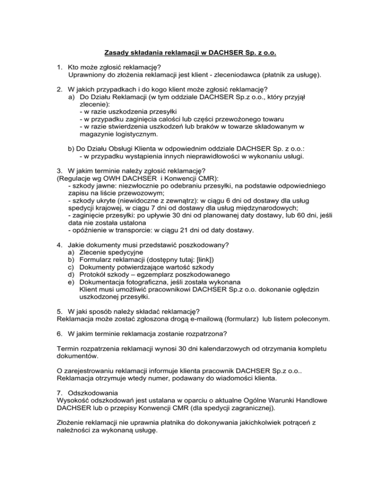Zasady składania reklamacji w DACHSER Sp. z o.o. 1. Kto może zgłosić reklamację? Uprawniony do złożenia reklamacji jest klient - zleceniodawca (płatnik za usługę). 2. W jakich przypadkach i do kogo klient może zgłosić reklamację? a) Do Działu Reklamacji (w tym oddziale DACHSER Sp.z o.o., który przyjął zlecenie): - w razie uszkodzenia przesyłki - w przypadku zaginięcia calości lub części przewożonego towaru - w razie stwierdzenia uszkodzeń lub braków w towarze składowanym w magazynie logistycznym. b) Do Działu Obsługi Klienta w odpowiednim oddziale DACHSER Sp. z o.o.: - w przypadku wystąpienia innych nieprawidłowości w wykonaniu usługi. 3. W jakim terminie należy zgłosić reklamację? (Regulacje wg OWH DACHSER i Konwencji CMR): - szkody jawne: niezwłocznie po odebraniu przesyłki, na podstawie odpowiedniego zapisu na liście przewozowym; - szkody ukryte (niewidoczne z zewnątrz): w ciągu 6 dni od dostawy dla usług spedycji krajowej, w ciągu 7 dni od dostawy dla usług międzynarodowych; - zaginięcie przesyłki: po upływie 30 dni od planowanej daty dostawy, lub 60 dni, jeśli data nie została ustalona - opóźnienie w transporcie: w ciągu 21 dni od daty dostawy. 4. Jakie dokumenty musi przedstawić poszkodowany? a) Zlecenie spedycyjne b) Formularz reklamacji (dostępny tutaj: [link]) c) Dokumenty potwierdzające wartość szkody d) Protokół szkody – egzemplarz poszkodowanego e) Dokumentacja fotograficzna, jeśli została wykonana Klient musi umożliwić pracownikowi DACHSER Sp.z o.o. dokonanie oględzin uszkodzonej przesyłki. 5. W jaki sposób należy składać reklamację? Reklamacja może zostać zgłoszona drogą e-mailową (formularz) lub listem poleconym. 6. W jakim terminie reklamacja zostanie rozpatrzona? Termin rozpatrzenia reklamacji wynosi 30 dni kalendarzowych od otrzymania kompletu dokumentów. O zarejestrowaniu reklamacji informuje klienta pracownik DACHSER Sp.z o.o.. Reklamacja otrzymuje wtedy numer, podawany do wiadomości klienta. 7. Odszkodowania Wysokość odszkodowań jest ustalana w oparciu o aktualne Ogólne Warunki Handlowe DACHSER lub o przepisy Konwencji CMR (dla spedycji zagranicznej). Złożenie reklamacji nie uprawnia płatnika do dokonywania jakichkolwiek potrąceń z należności za wykonaną usługę.