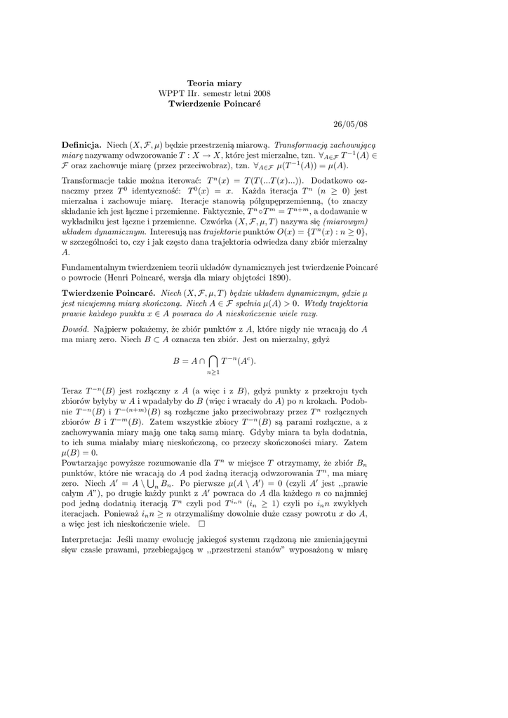 Twierdzenie Poincaré. Niech (X, F, µ, T ) bȩdzie ukÃladem dynamicznym, gdzie µ