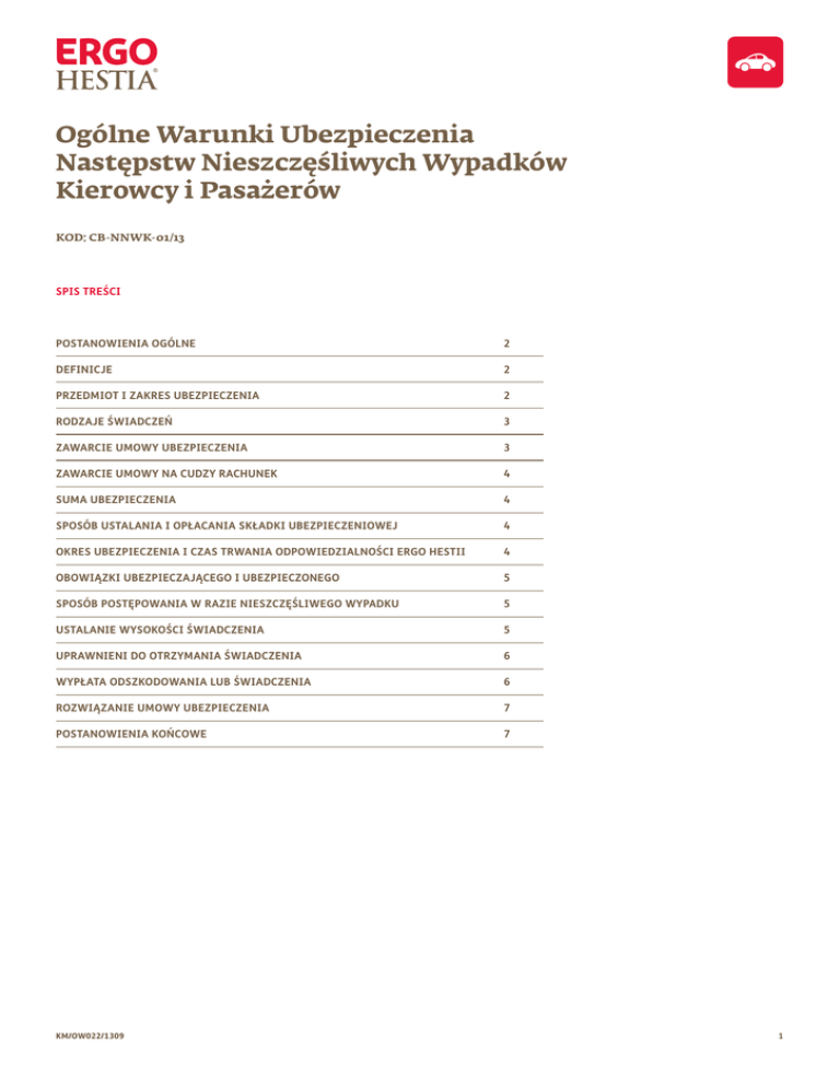 Ogólne Warunki Ubezpieczenia Następstw Nieszczęśliwych Wypadków Kierowcy i Pasażerów KOD: CB-NNWK-01/13 SPIS TREŚCI POSTANOWIENIA OGÓLNE 2 DEFINICJE 2 PRZEDMIOT I ZAKRES UBEZPIECZENIA 2 RODZAJE ŚWIADCZEŃ 3 ZAWARCIE UMOWY UBEZPIECZENIA 3 ZAWARCIE UMOWY NA CUDZY RACHUNEK 4 SUMA UBEZPIECZENIA 4 SPOSÓB USTALANIA I OPŁACANIA SKŁADKI UBEZPIECZENIOWEJ 4 OKRES UBEZPIECZENIA I CZAS TRWANIA ODPOWIEDZIALNOŚCI ERGO HESTII 4 OBOWIĄZKI UBEZPIECZAJĄCEGO I UBEZPIECZONEGO 5 SPOSÓB POSTĘPOWANIA W RAZIE NIESZCZĘŚLIWEGO WYPADKU 5 USTALANIE WYSOKOŚCI ŚWIADCZENIA 5 UPRAWNIENI DO OTRZYMANIA ŚWIADCZENIA 6 WYPŁATA ODSZKODOWANIA LUB ŚWIADCZENIA 6 ROZWIĄZANIE UMOWY UBEZPIECZENIA 7 POSTANOWIENIA KOŃCOWE 7 KM/OW022/1309 1 POSTANOWIENIA OGÓLNE §1 1. Na podstawie niniejszych Ogólnych Warunków Ubezpieczenia Sopockie Towarzystwo Ubezpieczeń Ergo Hestia SA, zwane dalej Ergo Hestią, w zakresie działania swego przedsiębiorstwa zawiera umowy ubezpieczenia następstw nieszczęśliwych wypadków kierowcy i pasażerów z osobami fizycznymi, osobami prawnymi oraz jednostkami organizacyjnymi niebędącymi osobami prawnymi, którym ustawa przyznaje zdolność prawną, zwanymi dalej Ubezpieczającymi. 2. Informujemy, że w związku z zawartą umową ubezpieczenia, na podstawie art. 24 ust. 1 Ustawy z dnia 29.08.1997 r. o ochronie danych osobowych (tekst jednolity: Dz. U. z 2002 r., Nr 101, poz. 926 z późn. zmianami): 1) Sopockie Towarzystwo Ubezpieczeń Ergo Hestia SA z siedzibą w Sopocie przy ul. Hestii 1, zwane dalej Ergo Hestią, jest administratorem Pani / Pana danych osobowych, które będą przez nią przetwarzane w celu wywiązania się z umowy ubezpieczenia oraz dla wypełnienia prawnie usprawiedliwionych celów, którymi są w szczególności: marketing bezpośredni własnych produktów i usług oraz dochodzenie roszczeń z tytułu zawartej umowy ubezpieczenia. Dane pobierane są na podstawie: art. 23 ust. 1 pkt 3 i pkt 5 ww. ustawy o ochronie danych osobowych i art. 815 kodeksu cywilnego, 2) służy Pani / Panu prawo wglądu do swoich danych osobowych oraz ich poprawiania, a przetwarzanie tych danych w celach innych niż wymienione powyżej prawnie usprawiedliwione cele Ergo Hestii albo osób trzecich, którym przekazywane są te dane, wymaga uzyskania Pani / Pana uprzedniej zgody. 3. Ergo Hestia nie ponosi odpowiedzialności za skutki niepodania do jej wiadomości okoliczności, o które pytała we wniosku o zawarcie umowy ubezpieczenia lub w innych pismach przed zawarciem tej umowy lub podanie tych okoliczności niezgodnie z prawdą. 4. Ubezpieczający przed zawarciem umowy ubezpieczenia powinien szczegółowo zapoznać się z treścią Ogólnych Warunków Ubezpieczenia. 5. Zwracamy uwagę, że definicje używanych pojęć mogą odbiegać od typowego, powszechnego ich znaczenia, jak też od definicji zawartych w ogólnie obowiązujących przepisach prawa. DEFINICJE §2 Pojęcia użyte w niniejszych Ogólnych Warunkach Ubezpieczenia przyjmują znaczenie określone w definicjach zamieszczonych poniżej w § 3. §3 1. Koszty leczenia - koszty poniesione na badania i zabiegi ambulatoryjne oraz operacyjne, pobyt w placówce służby zdrowia, jak również zakup niezbędnych lekarstw i środków opatrunkowych, nie obejmują one kosztów rehabilitacji i transportu. 2. Lokaut - zamknięcie zakładu przez właściciela, połączone ze zwalnianiem pracowników, przeprowadzane dla zmuszenia ich do przyjęcia gorszych warunków pracy lub ze względu na strajk. 2 3. Nieszczęśliwy wypadek - nagłe zdarzenie wywołane przyczyną zewnętrzną, w wyniku którego Ubezpieczony - niezależnie od swojej woli - doznał uszkodzenia ciała, rozstroju zdrowia lub zmarł. 4. Osoba uprawniona - wskazana przez Ubezpieczonego osoba fizyczna, uprawniona do odbioru świadczenia z tytułu jego śmierci. 5. Stan po spożyciu alkoholu - stan w którym stężenie alkoholu we krwi wynosi od 0,2‰ do 0,5‰ lub obecność alkoholu w wydychanym powietrzu wynosi od 0,1 mg do 0,25 mg alkoholu w 1 dm³. 6. Stan nietrzeźwości - stan w którym stężenie alkoholu we krwi wynosi powyżej 0,5‰ lub obecność alkoholu w wydychanym powietrzu wynosi powyżej 0,25 mg alkoholu w 1 dm³. 7. Strajk - zbiorowe, dobrowolne powstrzymywanie się pracowników od wykonywania pracy w celu rozwiązania sporu dotyczącego interesów, warunków pracy, płac lub świadczeń socjalnych oraz praw i wolności związkowych pracowników lub innych grup. 8. Przedsiębiorca - osoba fizyczna, osoba prawna lub inna jednostka organizacyjna niebędąca osobą prawną, której ustawa przyznaje zdolność prawną, prowadząca we własnym imieniu działalność gospodarczą lub zawodową. 9. Terroryzm - nielegalne akcje organizowane z pobudek ideologicznych lub politycznych, indywidualne lub grupowe, skierowane przeciwko osobom lub obiektom w celu wprowadzenia chaosu, zastraszenia ludności i dezorganizacji życia publicznego przy użyciu przemocy oraz skierowane przeciw społeczeństwu z zamiarem jego zastraszenia dla osiągnięcia celów politycznych lub społecznych. 10. Pojazd - każdy pojazd dopuszczony do ruchu na drogach publicznych zgodnie z obowiązującymi w tym zakresie przepisami. 11. Pojazd osobowy - pojazd zarejestrowany jako pojazd osobowy jak również pojazd terenowy, ciężarowo-osobowy, van oraz inny pojazd zarejestrowany jako pojazd ciężarowy a posiadający nadwozie pojazdu osobowego, terenowego lub osobowego kombi. 12. Używanie pojazdu: 1) poruszanie się pojazdem po drogach publicznych, od momentu wsiadania do wysiadania z uwzględnieniem chwilowego zatrzymania pojazdu na trasie jazdy, 2) czynności kierowcy pojazdu mające na celu jego bieżącą obsługę, dokonywane w bezpośredniej bliskości pojazdu, do których zalicza się: pobieranie paliwa na stacji benzynowej, załadowywanie i wyładowywanie pojazdu, mycie i czyszczenie pojazdu oraz otwieranie i zamykanie drzwi lub bramy garażu. 13. Zamieszki - gwałtowne demonstr