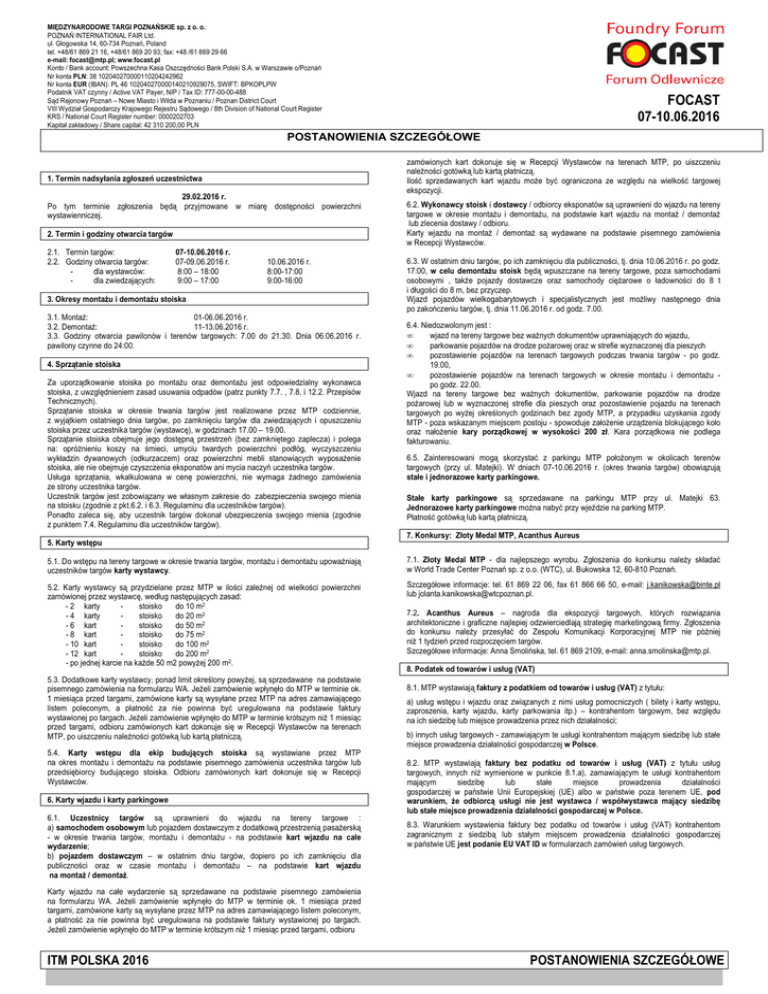 MIĘDZYNARODOWE TARGI POZNAŃSKIE sp. z o. o. POZNAŃ INTERNATIONAL FAIR Ltd. ul. Głogowska 14, 60-734 Poznań, Poland tel. +48/61 869 21 16, +48/61 869 20 93; fax: +48 /61 869 29 66 e-mail: [email protected]; www.focast.pl Konto / Bank account: Powszechna Kasa Oszczędności Bank Polski S.A. w Warszawie o/Poznań Nr konta PLN: 38 102040270000110204242962 Nr konta EUR (IBAN): PL 46 102040270000140210929075, SWIFT: BPKOPLPW Podatnik VAT czynny / Active VAT Payer, NIP / Tax ID: 777-00-00-488 Sąd Rejonowy Poznań – Nowe Miasto i Wilda w Poznaniu / Poznan District Court VIII Wydział Gospodarczy Krajowego Rejestru Sądowego / 8th Division of National Court Register KRS / National Court Register number: 0000202703 Kapitał zakładowy / Share capital: 42 310 200,00 PLN FOCAST 07-10.06.2016 POSTANOWIENIA SZCZEGÓŁOWE 1. Termin nadsyłania zgłoszeń uczestnictwa 29.02.2016 r. Po tym terminie zgłoszenia będą przyjmowane w miarę dostępności powierzchni wystawienniczej. 2. Termin i godziny otwarcia targów 2.1. Termin targów: 2.2. Godziny otwarcia targów: dla wystawców: dla zwiedzających: 07-10.06.2016 r. 07-09.06.2016 r. 8:00 – 18:00 9:00 – 17:00 10.06.2016 r. 8:00-17:00 9:00-16:00 3. Okresy montażu i demontażu stoiska 3.1. Montaż: 01-06.06.2016 r. 3.2. Demontaż: 11-13.06.2016 r. 3.3. Godziny otwarcia pawilonów i terenów targowych: 7.00 do 21.30. Dnia 06.06.2016 r. pawilony czynne do 24:00. 4. Sprzątanie stoiska Za uporządkowanie stoiska po montażu oraz demontażu jest odpowiedzialny wykonawca stoiska, z uwzględnieniem zasad usuwania odpadów (patrz punkty 7.7. , 7.8. i 12.2. Przepisów Technicznych). Sprzątanie stoiska w okresie trwania targów jest realizowane przez MTP codziennie, z wyjątkiem ostatniego dnia targów, po zamknięciu targów dla zwiedzających i opuszczeniu stoiska przez uczestnika targów (wystawcę), w godzinach 17.00 – 19.00. Sprzątanie stoiska obejmuje jego dostępną przestrzeń (bez zamkniętego zaplecza) i polega na: opróżnieniu koszy na śmieci, umyciu twardych powierzchni podłóg, wyczyszczeniu wykładzin dywanowych (odkurzaczem) oraz powierzchni mebli stanowiących wyposażenie stoiska, ale nie obejmuje czyszczenia eksponatów ani mycia naczyń uczestnika targów. Usługa sprzątania, wkalkulowana w cenę powierzchni, nie wymaga żadnego zamówienia ze strony uczestnika targów. Uczestnik targów jest zobowiązany we własnym zakresie do zabezpieczenia swojego mienia na stoisku (zgodnie z pkt.6.2. i 6.3. Regulaminu dla uczestników targów). Ponadto zaleca się, aby uczestnik targów dokonał ubezpieczenia swojego mienia (zgodnie z punktem 7.4. Regulaminu dla uczestników targów). 5. Karty wstępu zamówionych kart dokonuje się w Recepcji Wystawców na terenach MTP, po uiszczeniu należności gotówką lub kartą płatniczą. Ilość sprzedawanych kart wjazdu może być ograniczona ze względu na wielkość targowej ekspozycji. 6.2. Wykonawcy stoisk i dostawcy / odbiorcy eksponatów są uprawnieni do wjazdu na tereny targowe w okresie montażu i demontażu, na podstawie kart wjazdu na montaż / demontaż lub zlecenia dostawy / odbioru. Karty wjazdu na montaż / demontaż są wydawane na podstawie pisemnego zamówienia w Recepcji Wystawców. 6.3. W ostatnim dniu targów, po ich zamknięciu dla publiczności, tj. dnia 10.06.2016 r. po godz. 17:00, w celu demontażu stoisk będą wpuszczane na tereny targowe, poza samochodami osobowymi , także pojazdy dostawcze oraz samochody ciężarowe o ładowności do 8 t i długości do 8 m, bez przyczep. Wjazd pojazdów wielkogabarytowych i specjalistycznych jest możliwy następnego dnia po zakończeniu targów, tj. dnia 11.06.2016 r. od godz. 7.00. 6.4. Niedozwolonym jest : • wjazd na tereny targowe bez ważnych dokumentów uprawniających do wjazdu, • parkowanie pojazdów na drodze pożarowej oraz w strefie wyznaczonej dla pieszych • pozostawienie pojazdów na terenach targowych podczas trwania targów - po godz. 19.00, • pozostawienie pojazdów na terenach targowych w okresie montażu i demontażu po godz. 22.00. Wjazd na tereny targowe bez ważnych dokumentów, parkowanie pojazdów na drodze pożarowej lub w wyznaczonej strefie dla pieszych oraz pozostawienie pojazdu na terenach targowych po wyżej określonych godzinach bez zgody MTP, a przypadku uzyskania zgody MTP - poza wskazanym miejscem postoju - spowoduje założenie urządzenia blokującego koło oraz nałożenie kary porządkowej w wysokości 200 zł. Kara porządkowa nie podlega fakturowaniu. 6.5. Zainteresowani mogą skorzystać z parkingu MTP położonym w okolicach terenów targowych (przy ul. Matejki). W dniach 07-10.06.2016 r. (okres trwania targów) obowiązują stałe i jednorazowe karty parkingowe. Stałe karty parkingowe są sprzedawane na parkingu MTP przy ul. Matejki 63. Jednorazowe karty parkingowe można nabyć przy wjeździe na parking MTP. Płatność gotówką lub kartą płatniczą. 7. Konkursy: Złoty Medal MTP, Acanthus Aureus 5.1. Do wstępu na tereny targowe w okresie trwania targów, montażu i demontażu upoważniają uczestników targów karty wystawcy. 7.1. Złoty Medal MTP - dla najlepszego wyrobu. Zgłoszenia do konkursu należy składać w World Trade Center Poznań sp. z o.o. (WTC), ul. Bukowska 12, 60-810 Poznań. 5.2. Karty wystawcy są przydzielane przez MTP w ilości zależnej od wielkości powierzchni zamówionej przez wystawcę, według następujących zasad: - 2 karty stoisko do 10 m2 - 4 karty stoisko do 20 m2 - 6 kart stoisko do 50 m2 - 8 kart stoisko do 75 m2 - 10 kart stoisko do 100 m2 - 12 kart stoisko do 200 m2 - po jednej karcie na każde 50 m2 powyżej 200 m2. Szczegółowe informacje: tel. 61 869 22 06, fax 61 866 66 50, e-mail: [email protected] lub [email protected]. 5.3. Dodatkowe karty wystawcy, ponad limit określony powyżej, są sprzedawane na podstawie pisemnego zamówienia na formularzu WA. Jeżeli zamówienie wpłynęło do MTP w terminie ok. 1 miesiąca przed targam