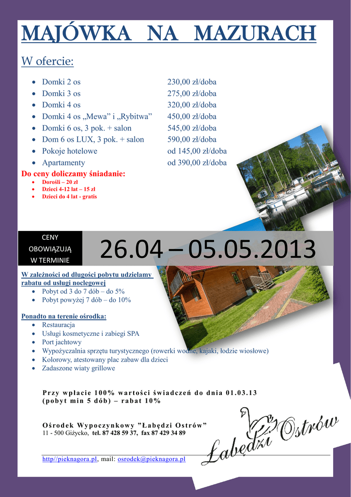 MAJÓWKA NA MAZURACH W ofercie: Domki 2 os Domki 3 os Domki 4 os Domki 4 os „Mewa” i „Rybitwa” Domki 6 os, 3 pok. + salon Dom 6 os LUX, 3 pok. + salon Pokoje hotelowe Apartamenty Do ceny doliczamy śniadanie: 230,00 zł/doba 275,00 zł/doba 320,00 zł/doba 450,00 zł/doba 545,00 zł/doba 590,00 zł/doba od 145,00 zł/doba od 390,00 zł/doba Dorośli – 20 zł Dzieci 4-12 lat – 15 zł Dzieci do 4 lat - gratis CENY OBOWIĄZUJĄ W TERMINIE 26.04 – 05.05.2013 W zależności od długości pobytu udzielamy rabatu od usługi noclegowej Pobyt od 3 do 7 dób – do 5% Pobyt powyżej 7 dób – do 10% Ponadto na terenie ośrodka: Restauracja Usługi kosmetyczne i zabiegi SPA Port jachtowy Wypożyczalnia sprzętu turystycznego (rowerki wodne, kajaki, łodzie wiosłowe) Kolorowy, atestowany plac zabaw dla dzieci Zadaszone wiaty grillowe Przy wpłacie 100% wartości świadczeń do dnia 01.03.13 (pobyt min 5 dób) – rabat 10% O ś ro d e k Wy p o c z y n k o w y ” Ł a b ę d z i O s t r ó w ” 11 - 500 Giżycko, tel. 87 428 59 37, fax 87 429 34 89 http//pieknagora.pl, mail: [email protected] Atrakcje planowane podczas pobytu