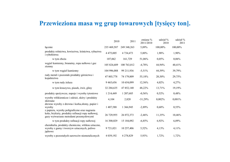 Przewieziona masa wg grup towarowych [tysięcy ton]. 2010 łącznie produkty rolnictwa, łowiectwa, leśnictwa, rybactwa i rybołóstwa 2011 235 469,587 249 348,263 zmiana % 2011/2010 udział % 2010 udział % 2011 5,89% 100,00% 100,00% 4 475,005 4 734,473 5,80% 1,90% 1,90% 107,062 161,729 51,06% 0,05% 0,06% 105 824,689 100 763,012 -4,78% 44,94% 40,41% 104 996,088 99 211,936 -5,51% 44,59% 39,79% 47 803,778 74 179,809 55,18% 20,30% 29,75% w tym rudy żelaza 9 465,656 10 654,099 12,56% 4,02% 4,27% w tym kruszywo, piasek, żwir, gliny 32 284,635 47 852,140 48,22% 13,71% 19,19% produkty spożywcze, napoje i wyroby tytoniowe 1 214,449 1 207,685 -0,56% 0,52% 0,48% 4,104 2,820 -31,29% 0,002% 0,001% 1 407,588 1 366,945 -2,89% 0,60% 0,55% 26 729,955 26 072,373 -2,46% 11,35% 10,46% 16 300,029 15 184,092 -6,85% 6,92% 6,09% chemikalia, produkty chemiczne, włókna sztuczne, wyroby z gumy i tworzyw sztucznych, paliwo jądrowe 9 721,021 10 257,406 5,52% 4,13% 4,11% wyroby z pozostałych surowców niemetalicznych 4 039,192 4 278,829 5,93% 1,72% 1,72% w tym zboża węgiel kamienny, brunatny, ropa naftowa i gaz ziemny w tym węgiel kamienny rudy metali i pozostałe produkty górnictwa i kopalnictwa wyroby włókiennicze i odzież, skóry i produkty skórzane drewno wyroby z drewna i korka,słomy, papier i wyroby z papieru, wyroby poligraficzne oraz nagrania koks, brykiety, produkty rafinacji ropy naftowej, gazy wytwarzane metodami przemysłowymi w tym produkty rafinacji ropy naftowej w tym cement, wapno, gips 3 059,784 3 377,390 10,38% 1,30% 1,35% 809,709 676,772 -16,42% 0,34% 0,27% 7 989,768 8 466,878 5,97% 3,39% 3,40% 120,179 195,598 62,76% 0,05% 0,08% sprzęt transportowy 984,202 1 161,805 18,05% 0,42% 0,47% meble, pozostałe wyroby gotowe 73,260 81,334 11,02% 0,03% 0,03% 4 511,949 5 082,712 12,65% 1,92% 2,04% 0,000 0,000 - 0,00% 0,00% 405,152 607,668 49,99% 0,17% 0,24% ładunki przewożone w trakcie przeprowadzki, pozostałe ładunki niebędące przedmiotem handlu 4,866 0,050 -98,97% 0,002% 0,00002% towary mieszane, bez spożywczych 85,738 336,195 292,12% 0,04% 0,13% towary nieidentyfikowalne 3 347,627 4 761,809 42,24% 1,42% 1,91% pozostałe towary 16 727,065 5 790,862 -65,38% 7,10% 2,32% w tym pozostałe materiały budowlane metale, wyroby metalowe gotowe (z wyłączeniem maszyn i urządzeń) maszyny, urządzenia, sprzęt elektryczny i elektroniczny surowce wtórne, odpady komunalne przesyłki listowe oraz paczki i przesyłki kurierskie puste opakowania Udział grup towarowych wg przewiezionej masy w 2011 roku. Wykonana praca przewozowa wg grup towarowych [tysięcy tonokilometrów]. 2010 Łącznie 48 842 137,307 2011 53 974 430,876 produkty rolnictwa, łowiectwa, leśnictwa, rybactwa i rybołówstwa 1 566 658,171 1 763 986,952 zmiana % 2011/2010 udział % 2010 udział % 2011 10,51% 100,00% 100,00% 12,60% 3,21% 3,27% w tym zboża węgiel kamienny, brunatny, ropa naftowa i gaz ziemny w tym węgiel kamienny rudy metali i pozostałe produkty górnictwa i kopalnictwa 24 920,284 34 233,791 37,37% 0,05% 0,06% 16 447 730,941 16 553 630,123 0,64% 33,68% 30,67% 16 204 890,516 16 031 772,366 -1,07% 33,18% 29,70% 12 419 941,775 16 290 058,574 31,16% 25,43% 30,18% -7,89% 6,31% 5,26% 51,24% 16,07% 21,99% w tym rudy żelaza 3 082 716,742 2 839 530,722 w tym kruszywo, piasek, żwir, gliny 7 847 198,906 11 867 802,120 produkty spożywcze, napoje i wyroby tytoniowe wyroby włókiennicze i odzież, skóry i produkty skórzane drewno wyroby z drewna i korka,słomy, papier i wyroby z papieru, wyroby poligraficzne oraz nagrania koks, brykiety, produkty rafinacji ropy naftowej, gazy wytwarzane metodami przemysłowymi w tym produkty rafinacji ropy naftowej 266 362,522 189 406,743 -28,89% 0,55% 0,35% 586,076 454,771 -22,40% 0,001% 0,001% 446 445,136 416 720,299 -6,66% 0,91% 0,77% 7 689 686,601 7 660 424,402 -0,38% 15,74% 14,19% 5 152 110,630 4 716 048,213 -8,46% 10,55% 8,74% 6,17% 6,47% 6,21% -1,31% 2,43% 2,17% chemikalia, produkty chemiczne, włókna sztuczne, wyroby z gumy i tworzyw sztucznych, paliwo 3 157 869,614 3 352 850,887 jądrowe wyroby z pozostałych surowców niemetalicznych w tym cement, wapno, gips w tym pozostałe materiały budowlane metale, wyroby metalowe gotowe (z wyłączeniem maszyn i urządzeń) maszyny, urządzenia, sprzęt elektryczny i elektroniczny sprzęt transportowy meble, pozostałe wyroby gotowe surowce wtórne, odpady komunalne 1 186 435,450 1 170 867,502 937 369,157 965 398,949 2,99% 1,92% 1,79% 196 127,676 130 531,210 -33,45% 0,40% 0,24% 5,82% 3,98% 3,82% 1 946 348,481 2 059 536,884 39 738,117 73 597,212 85,21% 0,08% 0,14% 201 614,332 266 910,906 32,39% 0,41% 0,49% 28 334,128 30 970,932 9,31% 0,06% 0,06% 12,28% 2,29% 2,33% 1 120 894,502 1 258 588,564 przesyłki listowe oraz paczki i przesyłki kurierskie puste opakowania ładunki przewożone w trakcie przeprowadzki, pozostałe ładunki niebędące przedmiotem handlu towary mieszane, bez spożywczych towary nieidentyfikowane pozostałe towary 0,000 0,000 - 0,00% 0,00% 182 679,041 269 320,108 47,43% 0,37% 0,50% 467,927 17,000 -96,37% 0,001% 0,00003% 18 902,335 43 462,423 129,93% 0,04% 0,08% 32,35% 2,92% 3,49% -1,28% 1,43% 1,27% 1 425 256,804 1 886 320,530 696 185,354 687 306,064 Udział grup towarowych wg wykonanej pracy przewozowej w 2011 roku. Liczba przewoźników realizujących przewozy poszczególnych grup towarowych. 2010 produkty rolnictwa, łowiectwa, leśnictwa, rybactwa i rybołóstwa 2011 5 6 2 3 24 23 22 21 26 30 w tym rudy żelaza 7 6 w tym kruszywo, piasek, żwir, gliny 25 29 produkty spożywcze, napoje i wyroby tytoniowe 5 5 wyroby włókiennicze i odzież, skóry i produkty skórzane 2 2 7 8 20 24 w tym produkty rafinacji ropy naftowej 18 18 chemikalia, produkty chemiczne, włókna sztuczne, wyroby z gumy i tworzyw sztucznych, paliwo jądrowe 20 21 w tym zboża węgiel kamienny, brunatny, ropa naftowa i gaz ziemny w tym węgiel kamienny rudy metali i pozostałe produkty górnictwa i kopalnictwa drewno wyroby z drewna i korka,s