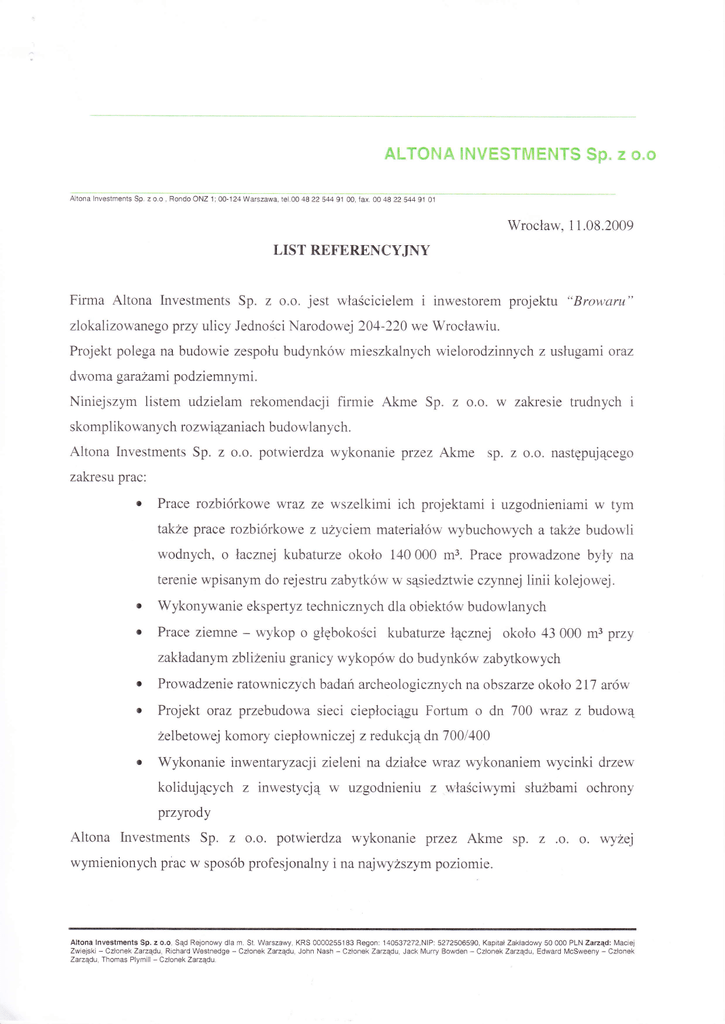ALTONA INVESTłVIHNTS Sp. z o"o łnon" ln"ó.iń"ntisp. i o'o ' nonoó oruz l ; do.izi wń.a* a' Ie|.oo 48 22 544 gi óo. ł""' oa ąa zz sąą gl ol Wroctaw. 1 1.08.2009 LIST REFERENCYJNY Firma Altona Investments Sp. z o.o. jest właścicielemi inwestorem projektu *Browaru,, z|oka|tzowanego przy ulicy Jedności Narodowej 204-220 we Wrocławiu. Projekt polega na budowie zespołu budynków mieszkalnych wielorodzinnych z usługamt oraz dwoma gar azami podziemnymi. Niniejszym listem udzielam rekomendacji firmie Akme Sp. skompl iko wanych r z o.o. w zakresie trudnych i ozwtązaniach budowl anych. Altona Investments Sp. z o.o. potwierdza wykonanie przez Akme Sp. Z o.o. następującego zakresu prac: o Prace rozbiórkowe wraz ze wszelkimi ich projektami także prace rozbiórkowe i uzgodnieniami w tym z uŻyciem materiałów wybuchowych a takze budowli wodnych, o łacznej kubaturze okoto 140 000 m3. Prace prowadzone były na terenie wpisanym do rejestru zabyków w sąsiedztwie czynnej linii kolejowej. . o Wykonywanie ekspertyz technicznych dla obiektów budowlanych Prace ziemne _ urykop o gtębokościkubaturze łącznej około 43 000 m3 przy zakładanym zbltzęniu granicy wykopów do budynków zabytkowych o o Prowadzenie ratowniczych badań archeologicznychnaobszarze około fI7 arów Projekt oruz przebudowa sieci ciepłociągu Fortum o dn 700 wrM z budową zelbetowej komory ciepłowniczej zredukcją dn 7001400 o Wykonanie inwentaryzacjt zieleni na działce wraz wykonaniem wycinki drzew kolidujących z inwestycją w uzgodnieniu z właściwymisłuzbami ochrony przyrody Altona lnvestments Sp. Z o.o. potwierdza wykonanie przez Akme Sp. Z .o' o. wyŻej wymienionych prac w sposób profesjonalny i na najv',ryŻszympoziomie. A|tona |nvestments sp' z o'o, sąd Rejonowy d|a m' st' Warszawy' KRs 00002551 83 Regon: '|4053727zNlP: 5272506590, Kapitał zakładowy 50 000 PLN zau ąd: l/aciej Zwieiski _ członekzarządu, Richard Westnedge _ Czlonekzarządu' John Nash _ czlonekzarządu, Jack Murry Bowden - członek zarządu, Edward McSweeny _ Członek zarządu, Thomas P|VmiIl. członek Zarządu' ALTONA INVESTMENTS Sp. z o.o A|tona |nvestm€nts Z sp. z o.o , Rondo oNz 1 ; 00- 124 Warszawa, te|'o0 48 22 544 91 0o, tax. 00 48 22 544 91 01 naszego punktu widzenia Akme sp.Z o.o. sprawdziło sie jako solidny i godny zaufania partner. Pragniemy poleció współpracę i korzystanie zę świadczonychusług budowlanych w wyżej wspomnianym zakresię przez Akme sp. Z o.o.. ZpowaŻantem, A|tona |nvestments sp. z o.o' sąd Rejonowy dla m' st' Warszawy' KRS 00002551 83 Regon: 140537272,NlP: 5272506590' Kapitał Zakładowy 50 000 PLN zau ąd: Maciej Zwiejski _ członek Zarządu' Richard Westnedge - członek zarządu' John Nash _ członek Zafządu' Jack Murry Bowden - członek Zarządu, Edward Nłcsweeny - członek zauądu, Thomas PIymjl| - członek zauądu'