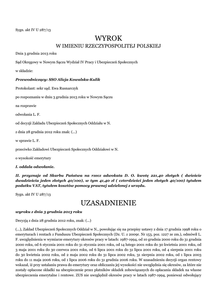 Sygn. akt IV U 287/13 WYROK W IMIENIU RZECZYPOSPOLITEJ POLSKIEJ Dnia 3 grudnia 2013 roku Sąd Okręgowy w Nowym Sączu Wydział IV Pracy i Ubezpieczeń Społecznych w składzie: Przewodniczący: SSO Alicja Kowalska-Kulik Protokolant: sekr sąd. Ewa Rusnarczyk po rozpoznaniu w dniu 3 grudnia 2013 roku w Nowym Sączu na rozprawie odwołania L. F. od decyzji Zakładu Ubezpieczeń Społecznych Oddziału w N. z dnia 28 grudnia 2012 roku znak: (...) w sprawie L. F. przeciwko Zakładowi Ubezpieczeń Społecznych Oddziałowi w N. o wysokość emerytury I. oddala odwołanie. II. przyznaje od Skarbu Państwa na rzecz adwokata D. O. kwotę 221,40 złotych ( dwieście dwadzieścia jeden złotych 40/100), w tym 41,40 zł ( czterdzieści jeden złotych 40/100) tytułem podatku VAT, tytułem kosztów pomocy prawnej udzielonej z urzędu. Sygn. akt IV U 287/13 UZASADNIENIE wyroku z dnia 3 grudnia 2013 roku Decyzją z dnia 28 grudnia 2012 roku, znak: (...) (...), Zakład Ubezpieczeń Społecznych Oddział w N., powołując się na przepisy ustawy z dnia 17 grudnia 1998 roku o emeryturach i rentach z Funduszu Ubezpieczeń Społecznych (Dz. U. z 2009r. Nr 153, poz. 1227 ze zm.), odmówił L. F. uwzględnienia w wymiarze emerytury okresów pracy w latach: 1987-1994, od 10 grudnia 2000 roku do 31 grudnia 2000 roku, od 6 stycznia 2001 roku do 31 stycznia 2001 roku, od 14 lutego 2001 roku do 30 kwietnia 2001 roku, od 3 maja 2001 roku do 30 czerwca 2001 roku, od 6 lipca 2001 roku do 31 lipca 2001 roku, od 4 sierpnia 2001 roku do 30 kwietnia 2002 roku, od 2 maja 2002 roku do 31 lipca 2002 roku, 31 sierpnia 2002 roku, od 1 lipca 2003 roku do 11 maja 2006 roku, od 1 lipca 2006 roku do 31 grudnia 2006 roku. W uzasadnieniu decyzji organ rentowy wskazał, iż przy ustalaniu prawa do emerytury oraz obliczaniu jej wysokości nie uwzględnia się okresów, za które nie zostały opłacone składki na ubezpieczenie przez płatników składek zobowiązanych do opłacania składek na własne ubezpieczenia emerytalne i rentowe. ZUS nie uwzględnił okresów pracy w latach 1987-1994, ponieważ odwołujący nie przedłożył żadnych dokumentów na potwierdzenie zatrudnienia w tych latach, nadto nie uwzględnił okresów prowadzenia pozarolniczej działalności gospodarczej, za które nie zostały opłacone składki na ubezpieczenie. Od powyższej decyzji odwołał się L. F.. W piśmie procesowym z dnia 21 maja 2013r. (k.78-81) odwołujący sprecyzował swe żądania poprzez uwzględnienie w wymiarze emerytury okresów zatrudnienia w latach 1987-1994 oraz wyszczególnionych w decyzji okresów w latach 2000-2006. W w/w piśmie wskazano, że L. F. w latach 1987-1989 zatrudniony był w S., w okresie od 1989 – 1993 w (...), a w latach 1992-1993 prowadził zespół pałacowo-parkowy w T.. Na powyższe okoliczności zawnioskowany został dowód z zeznań świadków oraz z informacji w Urzędzie Skarbowym w B. odnośnie regularnego opłacania podatków w okresie od 1987-1989 z działalności gospodarczej. W kolejnym piśmie procesowym z dnia 27 sierpnia 2013 r. (k.97-98) odwołujący podał, że w latach 1987-1989 prowadził działalność gospodarczą w formie stołówki w pensjonacie (...), a składki z tego tytułu zostały odprowadzone do ZUS w B.. Następnie w latach 1989-1993 prowadził działalność gospodarczą na zasadzie „umowy pełnej agencji” z (...) poprzez prowadzenie Zespołu (...): DW (...) w K., i DW (...) M., a składki z tego tytułu zostały odprowadzone do ZUS w N.. W latach 1992-1994 odwołujący prowadził zespół pałacowo-hotelarski – Ośrodek (...) i również z tej działalności zostały składki odprowadzane do ZUS. Na okoliczność zatrudnienia w latach 1987-1994 odwołujący wniósł o dopuszczenie i przeprowadzenie dowodu z jego zeznań oraz zeznań świadków. W odpowiedzi na odwołanie Zakład Ubezpieczeń Społecznych Oddział w N., powołując się na argumentację podniesioną w zaskarżonej decyzji, wniósł o jego oddalenie. Bezspornym w sprawie jest, że L. F., ur. (...) pobiera emeryturę przyznaną decyzją ZUS Oddziału w N. z dnia 7 listopada 2012 roku od (...), tj. od osiągnięcia wieku emerytalnego. Organ rentowy nie zaliczył odwołującemu następujących okresów: od 1987-1994, od 10 grudnia 2000 roku do 31 grudnia 2000 roku, od 6 stycznia 2001 roku do 31 stycznia 2001 roku, od 14 lutego 2001 roku do 30 kwietnia 2001 roku, od 3 maja 2001 roku do 30 czerwca 2001 roku, od 6 lipca 2001 roku do 31 lipca 2001 roku, od 4 sierpnia 2001 roku do 30 kwietnia 2002 roku, od 2 maja 2002 roku do 31 lipca 2002 roku, 31 sierpnia 2002 roku, od 1 lipca 2003 roku do 11 maja 2006 roku, od 1 lipca 2006 roku do 31 grudnia 2006 roku. Sąd ustalił następujący stan faktyczny: L. F. nie figuruje w rejestrach płatników składek w Zakładzie Ubezpieczeń Społecznych Oddział w K. Inspektorat w B. w latach 1987-1989. Nie figuruje on również w ewidencji płatników Oddziału ZUS w S. w latach 1989-1993 oraz 1992-1994 oraz w ewidencji płatników ZUS Oddziału w N. w okresie od 1989 roku do 1993 roku. Odwołujący w okresie od 1 stycznia 1999 roku do 11 maja 2006 r. i od 1 lipca 2006 r. do 31 grudnia 2006 roku podlegał ubezpieczeniom z tytułu wykonywania działalności gospodarczej i z tego tytułu opłacił składki w następujących okresach: od 1 stycznia 1991 roku do 9 grudnia 2000 roku, od 1 stycznia 2001 roku do 5 stycznia 2001 roku, od 1 lutego 2001 roku do 13 lutego 2001 roku, od 1 maja 2001 roku do 2 maja 2001 roku, od 1 lipca 2001 roku do 5 lipca 2001 roku, od 1 sierpnia 2001 roku do 3 sierpnia 2001 roku, za 1 maja 2002 roku, od 1 sierpnia 2002 r. do 30 sierpnia 2002 roku oraz od 1 września 2002 roku do 30 czerwca 2003 roku. dowód: pismo ZUS O/S. z 16.10.2012r. k. 99 akt ZUS, pismo ZUS O/K. z 24.10.2012r. k. 111 akt ZUS, poświadczenie ubezpieczenia k. 117 akt ZUS, pismo ZUS O/N. z 25.10.2012r. k. 145 akt ZUS Powyższy stan faktyczny Sąd ustalił na podstawie dokumentacji zgromadzo