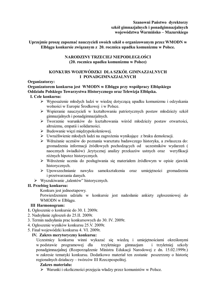Szanowni Pa stwo dyrektorzy szkól gimnazjalnych i ponadgimnazjalnych województwa Warmi sko – Mazurskiego Uprzejmie prosz zapozna nauczycieli swoich szkó o organizowanym przez WMODN w Elbl gu konkursie zwi zanym z 20. rocznica upadku komunizmu w Polsce. NARODZINY TRZECIEJ NIEPODLEG CI (20. rocznica upadku komunizmu w Polsce) KONKURS WOJEWÓDZKI DLA SZKÓ GIMNAZJALNYCH I PONADGIMNAZJALNYCH Organizatorzy: Organizatorem konkursu jest WMODN w Elbl gu przy wspó pracy Elbl skiego Oddzia u Polskiego Towarzystwa Historycznego oraz Telewizja Elbl ska. I. Cele konkursu: Wyposa enie m odych ludzi w wiedz dotycz upadku komunizmu i odzyskania wolno ci w Europie rodkowej i w Polsce. Wspieranie nauczycieli w kszta towaniu patriotycznych postaw m odzie y szkó gimnazjalnych i ponadgimnazjalnych. Tworzenie warunków do kszta towania w ród m odzie y postaw otwarto ci, altruizmu, empatii i solidarno ci. Budowanie wi zi mi dzypokoleniowej. Uwra liwienie m odych ludzi na zagro enia wynikaj ce z braku demokracji. Wdra anie uczniów do poznania warsztatu badawczego historyka, a zw aszcza do: gromadzenia informacji ród owych pochodz cych od uczestników wydarze ( naocznych wiadków) ,krytycznej analizy przekazów ustnych oraz weryfikacji ró nych hipotez historycznych. Wdro enie ucznia do pos ugiwania si materia em ród owym w opisie zjawisk historycznych. Upowszechnianie nawyku samokszta cenia oraz umiej tno ci gromadzenia i przetwarzania danych. Wyszukiwanie „talentów” historycznych. II. Przebieg konkursu: Konkurs jest jednoetapowy. Potwierdzeniem udzia u w konkursie jest nades anie ankiety zg oszeniowej do WMODN w Elbl gu. III Harmonogram: 1. Og oszenie o konkursie do 30. I. 2009r. 2. Nadsy anie zg osze do 25.II. 2009r. 3. Termin nadsy ania prac konkursowych do 30. IV. 2009r. 4. Og oszenie wyników konkursu 25.V. 2009r. 5. Fina wojewódzki konkursu 4. VI. 2009r. IV. Zakres merytoryczny konkursu: Uczestnicy konkursu winni wykaza si wiedz i umiej tno ciami okre lonymi w podstawie programowej dla trzyletniego gimnazjum i trzyletniej szko y ponadgimnazjalnej (Rozporz dzenie Ministra Edukacji Narodowej z dn. 15.02.1999r.) w zakresie tematyki konkursu. Dodatkowo materia ten zostanie poszerzony o histori regionalnych dzia aczy – twórców III Rzeczpospolitej. Zakres materia u: Warunki i okoliczno ci przej cia w adzy przez komunistów w Polsce. Przyczyny i skutki kryzysów w PRL -u w latach sze dziesi tych i siedemdziesi tych. Przejawy opozycji wobec w adzy komunistycznej w Polsce. Warunki i okoliczno ci powstania NSZZ „Solidarno ”. Wprowadzenie stanu wojennego – przerwany marsz do wolno ci. Obrady okr ego sto u i realizacja umów okr ego sto u. Historia regionalnych dzia aczy – twórców III Rzeczpospolitej. V Organizacja konkursu. Szko za zgod dyrektora mo e reprezentowa jeden zespó pi cioosobowy wykonuj cy zadania konkursowe pod opiek jednego nauczyciela – opiekuna. Zadaniem uczestników konkursu b dzie przygotowanie reporta u filmowego w wersji multimedialnej 5-7 min. o historii dzia acza – opozycjonisty, twórcy podziemia demokratycznego w regionie b cym siedzib szko y lub z rejonów s siednich. Przygotowanie reporta u filmowego zostanie poprzedzone organizacj spotkania z wybranym bohaterem na forum szko y. Spotkanie to ma na celu upowszechnienie wiedzy o warunkach i okoliczno ci upadku komunizmu w Polsce, dlatego powinny wzi w nim udzia jak najszersze grono spo eczno ci uczniowskiej. Organizacja spotkania na forum szko y powinna przebiega nast puj co: 1 Zaprezentowanie drogi Polaków do NARODZIN TRZECIEJ NIEPODLEG CI w przyst pnej ciekawej formie przez zespó pi cioosobowy wykonuj cy zadania konkursowe. 2 Przedstawienie regionalnego dzia acza opozycji niepodleg ciowej i przeprowadzenie z Nim wywiadu, który umo liwi zbudowanie scenariusza filmowego. 3 Zach cenie uczestników spotkania do zadawania pyta bohaterowi spotkania ( im wi cej dociekliwo ci i refleksu w przygotowaniu si do rozmowy tym lepszy scenariusz). 4 Umówienie si na kolejne spotkanie z bohaterem w celu uzyskania dodatkowych informacji, obejrzenie miejsc Jego dzia alno ci, dokonania selekcji nagranego materia u ewentualnej autoryzacji. Po odbytym spotkaniu: 1 Sporz dzi nagranie filmowe ( 5 – 7 minutowe). 2 Napisa sprawozdanie w/g za czonego wzoru. 3 Wys do WMODN w Elbl gu Fina konkursu: Spotkanie z bohaterami filmów i zaproszonymi go mi. Prezentacja zespo ów uczniowskich. Og oszenie wyników konkursu i przedstawienie laureatów. Prezentacja najlepszych filmów . Uwaga: Szko y, które zg osz si do konkursu uzyskaj dodatkowe dane dotycz ce pracy nad scenariuszem i filmem. Nagrody: Trzy najlepsze filmy szkó gimnazjalnych trzy najlepsze filmy ze szkó ponadgimnazjalnych zostan wyemitowane przez TV -Vectra w Elbl gu. Nagrod w konkursie jest wycieczka do Warszawy po czona ze spotkaniem z twórcami III Niepodleg ci dla trzech zespo ów ze szkó gimnazjalnych oraz dla trzech zespo ów ze szkó ponadgimnazjalnych wraz z opiekunem. Za ca konkursu odpowiada Maria Kubacka [email protected] Saperów 20 82-300 Elbl g KARTA ZG OSZENIA ......................................................................................................................................................... (NAZWA SZKO Y) ......................................................................................................................................................... (ADRES SZKO Y) ......................................................................................................................................................... ( TEL. FAX. E -MAIL) L.P IMI I NAZWISKO UCZNIA KLASA IMI I NAZWISKO NAUCZYCIELA Piecz i podpis dyrektora szko y NARODZINY TRZECIEJ NIEPODLEG CI (konkurs) Protokó z odbytego spotkania w szkole Nazwa Szko y ......................................................................................................................................................... ............................................................