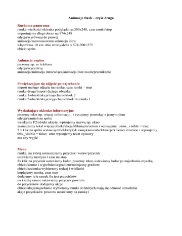 Animacje flash – część druga Ruchoma panorama ramka wielkości okienka podglądu np.300x248, czas ramki/stop importujemy długi obraz np.574x248 edycja/wyrównaj do prawej animacja/zaawansowana animacja intro: włącz/czas 10 s/w obie strony/delta x 574-300=275 obiekt sprite Animacja napisu piszemy np. nr telefonu edycja/wycentruj animacja/animacja intro/włącz/animacja liter-zoom/przenikanie Powiększające się zdjęcie po najechaniu import małego zdjęcia na ramkę, czas ramki – stop ramka druga/import dużego obrazka ramka 1/obiekt/akcja/najechanie/skok 2 ramka 2/obiekt/akcja/wyjechanie/skok do ramki 1 Wyskakujące okienko informacyjne piszemy tekst np. więcej informacji... i rysujemy prostokąt z jasnym tłem edycja/zamień na sprite wciskamy F2/obiekt ukryty, wpisujemy nazwę np. okno zaznaczamy tekst więcej obiekt/akcje/kliknięcia/action i wpisujemy okno._visible = true; 2 x klik na sprita wstaw/symbol/krzyżyk zamykania/obiekt/akcje/klikniecie/action i wpisujemy this._visible = false; oraz wpisujemy tekst opisowy esc aby wyjść Menu ramka, na której umieszczamy przyciski wstaw/przycisk ustawiamy matryca i czas na stop 2x klik na przycisk ustawiamy kolor, piszemy tekst, ustawiamy kolor po najechaniu myszką obiekt/kontur i wypełnienia/gradient/malujemy gradient obiekt/czcionka/wybieramy rodzaj i wielkość kopiujemy ramkę, czas stop dodajemy tyle ramek ile jest przycisków na każdej ramce ustawiamy przycisk powrotu do przycisków dodajemy akcje obiekt/akcje/najechanie wybieramy ramki do których mają się odnosić odwołania akcje przycisków powrotu ustawiamy na ramkę1