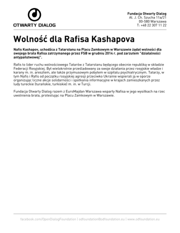 Fundacja Otwarty Dialog Al. J. Ch. Szucha 11a/21 00-580 Warszawa T: +48 22 307 11 22 Wolność dla Rafisa Kashapova Nafis Kashapov, uchodźca z Tatarstanu na Placu Zamkowym w Warszawie żądał wolności dla swojego brata Rafisa zatrzymanego przez FSB w grudniu 2014 r. pod zarzutem "działalności antypaństwowej". Rafis to lider ruchu wolnościowego Tatarów z Tatarstanu będącego obecnie republiką w składzie Federacji Rosyjskiej. Był wielokrotnie prześladowany za swoje działania przez rosyjskie władze i karany m. in. aresztem, ale także przymusowym pobytem w szpitalu psychiatrycznym. Tatarzy, w tym Nafis i Rafis od początku rosyjskiej agresji przeciwko Ukrainie wspierali ją w oporze organizując liczne akcje solidarności i spotkania informacyjne w krajach zamieszkanych przez ludy tureckie (turańskie, turkiskie) m. in. w Turcji. Fundacja Otwarty Dialog razem z EuroMajdan Warszawa wsparły Nafisa w jego wysiłkach na rzec uwolnienia brata, protestując na Placu Zamkowym w Warszawie. facebook.com/OpenDialogFoundation | [email protected] | www.odfoundation.eu