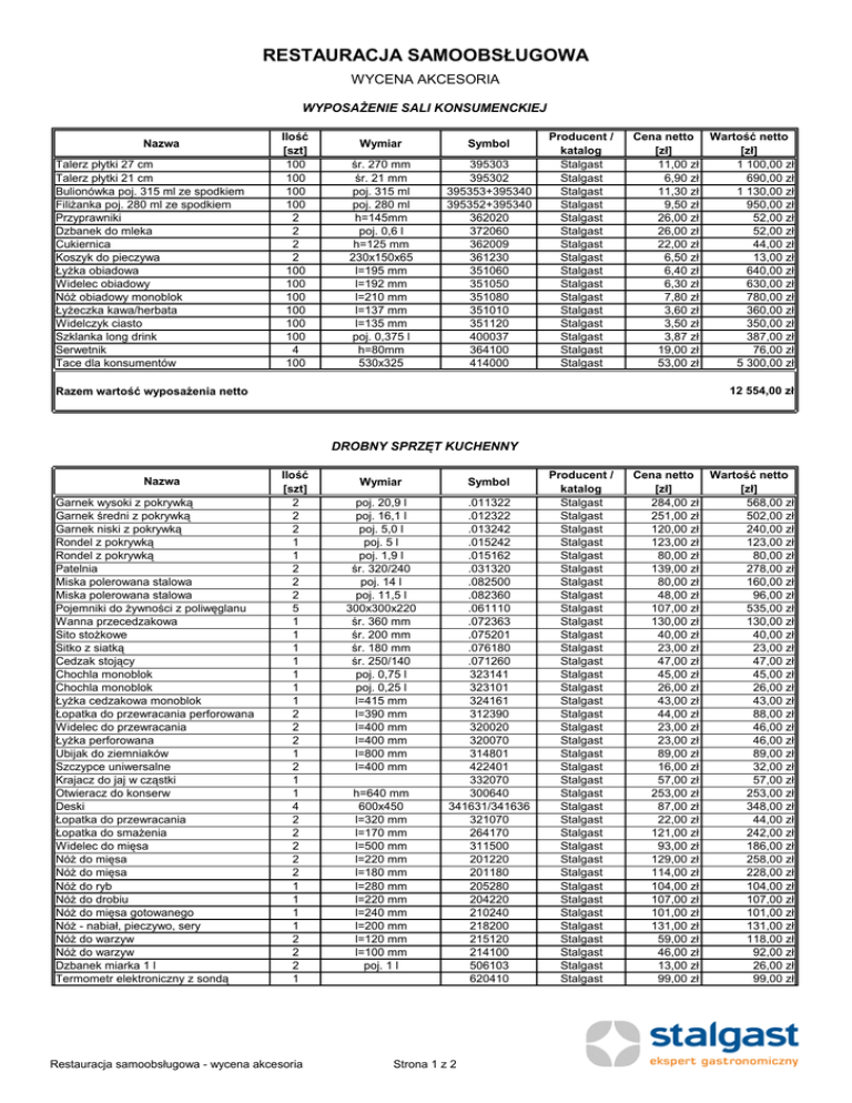 RESTAURACJA SAMOOBSŁUGOWA WYCENA AKCESORIA WYPOSAŻENIE SALI KONSUMENCKIEJ Nazwa Talerz płytki 27 cm Talerz płytki 21 cm Bulionówka poj. 315 ml ze spodkiem Filiżanka poj. 280 ml ze spodkiem Przyprawniki Dzbanek do mleka Cukiernica Koszyk do pieczywa Łyżka obiadowa Widelec obiadowy Nóż obiadowy monoblok Łyżeczka kawa/herbata Widelczyk ciasto Szklanka long drink Serwetnik Tace dla konsumentów Ilość [szt] 100 100 100 100 2 2 2 2 100 100 100 100 100 100 4 100 Wymiar Symbol śr. 270 mm śr. 21 mm poj. 315 ml poj. 280 ml h=145mm poj. 0,6 l h=125 mm 230x150x65 l=195 mm l=192 mm l=210 mm l=137 mm l=135 mm poj. 0,375 l h=80mm 530x325 395303 395302 395353+395340 395352+395340 362020 372060 362009 361230 351060 351050 351080 351010 351120 400037 364100 414000 Producent / katalog Stalgast Stalgast Stalgast Stalgast Stalgast Stalgast Stalgast Stalgast Stalgast Stalgast Stalgast Stalgast Stalgast Stalgast Stalgast Stalgast Cena netto Wartość netto [zł] [zł] 11,00 zł 1 100,00 zł 6,90 zł 690,00 zł 11,30 zł 1 130,00 zł 9,50 zł 950,00 zł 26,00 zł 52,00 zł 26,00 zł 52,00 zł 22,00 zł 44,00 zł 6,50 zł 13,00 zł 6,40 zł 640,00 zł 6,30 zł 630,00 zł 7,80 zł 780,00 zł 3,60 zł 360,00 zł 3,50 zł 350,00 zł 3,87 zł 387,00 zł 19,00 zł 76,00 zł 53,00 zł 5 300,00 zł 12 554,00 zł Razem wartość wyposażenia netto DROBNY SPRZĘT KUCHENNY Nazwa Garnek wysoki z pokrywką Garnek średni z pokrywką Garnek niski z pokrywką Rondel z pokrywką Rondel z pokrywką Patelnia Miska polerowana stalowa Miska polerowana stalowa Pojemniki do żywności z poliwęglanu Wanna przecedzakowa Sito stożkowe Sitko z siatką Cedzak stojący Chochla monoblok Chochla monoblok Łyżka cedzakowa monoblok Łopatka do przewracania perforowana Widelec do przewracania Łyżka perforowana Ubijak do ziemniaków Szczypce uniwersalne Krajacz do jaj w cząstki Otwieracz do konserw Deski Łopatka do przewracania Łopatka do smażenia Widelec do mięsa Nóż do mięsa Nóż do mięsa Nóż do ryb Nóż do drobiu Nóż do mięsa gotowanego Nóż - nabiał, pieczywo, sery Nóż do warzyw Nóż do warzyw Dzbanek miarka 1 l Termometr elektroniczny z sondą Ilość [szt] 2 2 2 1 1 2 2 2 5 1 1 1 1 1 1 1 2 2 2 1 2 1 1 4 2 2 2 2 2 1 1 1 1 2 2 2 1 Restauracja samoobsługowa - wycena akcesoria Wymiar Symbol poj. 20,9 l poj. 16,1 l poj. 5,0 l poj. 5 l poj. 1,9 l śr. 320/240 poj. 14 l poj. 11,5 l 300x300x220 śr. 360 mm śr. 200 mm śr. 180 mm śr. 250/140 poj. 0,75 l poj. 0,25 l l=415 mm l=390 mm l=400 mm l=400 mm l=800 mm l=400 mm .011322 .012322 .013242 .015242 .015162 .031320 .082500 .082360 .061110 .072363 .075201 .076180 .071260 323141 323101 324161 312390 320020 320070 314801 422401 332070 300640 341631/341636 321070 264170 311500 201220 201180 205280 204220 210240 218200 215120 214100 506103 620410 h=640 mm 600x450 l=320 mm l=170 mm l=500 mm l=220 mm l=180 mm l=280 mm l=220 mm l=240 mm l=200 mm l=120 mm l=100 mm poj. 1 l Strona 1 z 2 Producent / katalog Stalgast Stalgast Stalgast Stalgast Stalgast Stalgast Stalgast Stalgast Stalgast Stalgast Stalgast Stalgast Stalgast Stalgast Stalgast Stalgast Stalgast Stalgast Stalgast Stalgast Stalgast Stalgast Stalgast Stalgast Stalgast Stalgast Stalgast Stalgast Stalgast Stalgast Stalgast Stalgast Stalgast Stalgast Stalgast Stalgast Stalgast Cena netto Wartość netto [zł] [zł] 284,00 zł 568,00 zł 251,00 zł 502,00 zł 120,00 zł 240,00 zł 123,00 zł 123,00 zł 80,00 zł 80,00 zł 139,00 zł 278,00 zł 80,00 zł 160,00 zł 48,00 zł 96,00 zł 107,00 zł 535,00 zł 130,00 zł 130,00 zł 40,00 zł 40,00 zł 23,00 zł 23,00 zł 47,00 zł 47,00 zł 45,00 zł 45,00 zł 26,00 zł 26,00 zł 43,00 zł 43,00 zł 44,00 zł 88,00 zł 23,00 zł 46,00 zł 23,00 zł 46,00 zł 89,00 zł 89,00 zł 16,00 zł 32,00 zł 57,00 zł 57,00 zł 253,00 zł 253,00 zł 87,00 zł 348,00 zł 22,00 zł 44,00 zł 121,00 zł 242,00 zł 93,00 zł 186,00 zł 129,00 zł 258,00 zł 114,00 zł 228,00 zł 104,00 zł 104,00 zł 107,00 zł 107,00 zł 101,00 zł 101,00 zł 131,00 zł 131,00 zł 59,00 zł 118,00 zł 46,00 zł 92,00 zł 13,00 zł 26,00 zł 99,00 zł 99,00 zł DROBNY SPRZĘT KUCHENNY Nazwa Tłuczek stalowy z rączką z tworzywa Nożyce do drobiu Ilość [szt] 2 2 Wymiar Symbol l=250 mm 247090 227250 Cena netto Wartość netto [zł] [zł] 74,00 zł 148,00 zł 153,00 zł 306,00 zł 6 085,00 zł Razem wartość wyposażenia netto wg cennika z października 2016 r. katalog wydanie XXXVI końcowa wycena zależna jest od ostatecznego projektu Restauracja samoobsługowa - wycena akcesoria Producent / katalog Stalgast Stalgast Strona 2 z 2