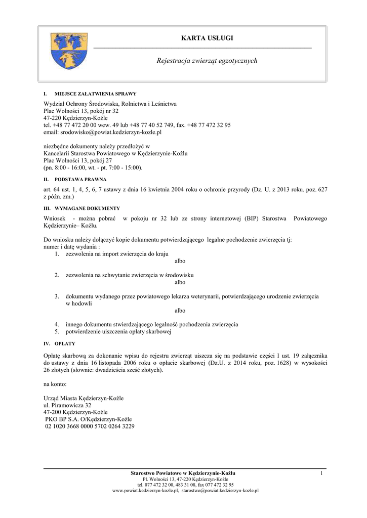 KARTA USŁUGI ___________________________________________________________ Rejestracja zwierząt egzotycznych I. MIEJSCE ZAŁATWIENIA SPRAWY Wydział Ochrony Środowiska, Rolnictwa i Leśnictwa Plac Wolności 13, pokój nr 32 47-220 Kędzierzyn-Koźle tel. +48 77 472 20 00 wew. 49 lub +48 77 40 52 749, fax. +48 77 472 32 95 email: [email protected] niezbędne dokumenty należy przedłożyć w Kancelarii Starostwa Powiatowego w Kędzierzynie-Koźlu Plac Wolności 13, pokój 27 (pn. 8:00 - 16:00, wt. - pt. 7:00 - 15:00). II. PODSTAWA PRAWNA art. 64 ust. 1, 4, 5, 6, 7 ustawy z dnia 16 kwietnia 2004 roku o ochronie przyrody (Dz. U. z 2013 roku. poz. 627 z późn. zm.) III. WYMAGANE DOKUMENTY Wniosek - można pobrać Kędzierzynie– Koźlu. w pokoju nr 32 lub ze strony internetowej (BIP) Starostwa Powiatowego Do wniosku należy dołączyć kopie dokumentu potwierdzającego legalne pochodzenie zwierzęcia tj: numer i datę wydania : 1. zezwolenia na import zwierzęcia do kraju albo 2. zezwolenia na schwytanie zwierzęcia w środowisku albo 3. dokumentu wydanego przez powiatowego lekarza weterynarii, potwierdzającego urodzenie zwierzęcia w hodowli albo 4. 5. innego dokumentu stwierdzającego legalność pochodzenia zwierzęcia potwierdzenie uiszczenia opłaty skarbowej IV. OPŁATY Opłatę skarbową za dokonanie wpisu do rejestru zwierząt uiszcza się na podstawie części I ust. 19 załącznika do ustawy z dnia 16 listopada 2006 roku o opłacie skarbowej (Dz.U. z 2014 roku, poz. 1628) w wysokości 26 złotych (słownie: dwadzieścia sześć złotych). na konto: Urząd Miasta Kędzierzyn-Koźle ul. Piramowicza 32 47-200 Kędzierzyn-Koźle PKO BP S.A. O/Kędzierzyn-Koźle 02 1020 3668 0000 5702 0264 3229 Starostwo Powiatowe w Kędzierzynie-Koźlu Pl. Wolności 13, 47-220 Kędzierzyn-Koźle tel. 077 472 32 00, 483 31 08, fax 077 472 32 95 www.powiat.kedzierzyn-kozle.pl, [email protected] 1 V. TERMIN ZAŁATWIENIA SPRAWY Termin załatwienia sprawy do 7 dni. VI. UWAGI Załatwienie sprawy kończy się wydaniem zaświadczenia. Starostwo Powiatowe w Kędzierzynie-Koźlu Pl. Wolności 13, 47-220 Kędzierzyn-Koźle tel. 077 472 32 00, 483 31 08, fax 077 472 32 95 www.powiat.kedzierzyn-kozle.pl, [email protected] 2