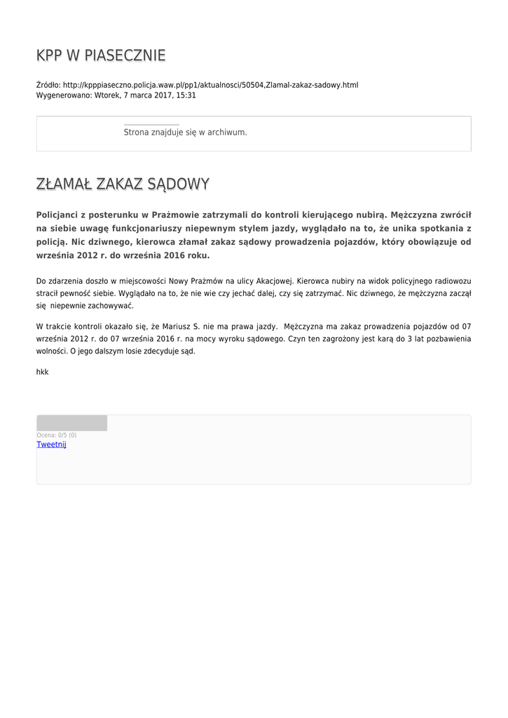 KPP W PIASECZNIE Źródło: http://kpppiaseczno.policja.waw.pl/pp1/aktualnosci/50504,Zlamal-zakaz-sadowy.html Wygenerowano: Wtorek, 7 marca 2017, 15:31 Strona znajduje się w archiwum. ZŁAMAŁ ZAKAZ SĄDOWY Policjanci z posterunku w Prażmowie zatrzymali do kontroli kierującego nubirą. Mężczyzna zwrócił na siebie uwagę funkcjonariuszy niepewnym stylem jazdy, wyglądało na to, że unika spotkania z policją. Nic dziwnego, kierowca złamał zakaz sądowy prowadzenia pojazdów, który obowiązuje od września 2012 r. do września 2016 roku. Do zdarzenia doszło w miejscowości Nowy Prażmów na ulicy Akacjowej. Kierowca nubiry na widok policyjnego radiowozu stracił pewność siebie. Wyglądało na to, że nie wie czy jechać dalej, czy się zatrzymać. Nic dziwnego, że mężczyzna zaczął się niepewnie zachowywać. W trakcie kontroli okazało się, że Mariusz S. nie ma prawa jazdy. Mężczyzna ma zakaz prowadzenia pojazdów od 07 września 2012 r. do 07 września 2016 r. na mocy wyroku sądowego. Czyn ten zagrożony jest karą do 3 lat pozbawienia wolności. O jego dalszym losie zdecyduje sąd. hkk Ocena: 0/5 (0) Tweetnij