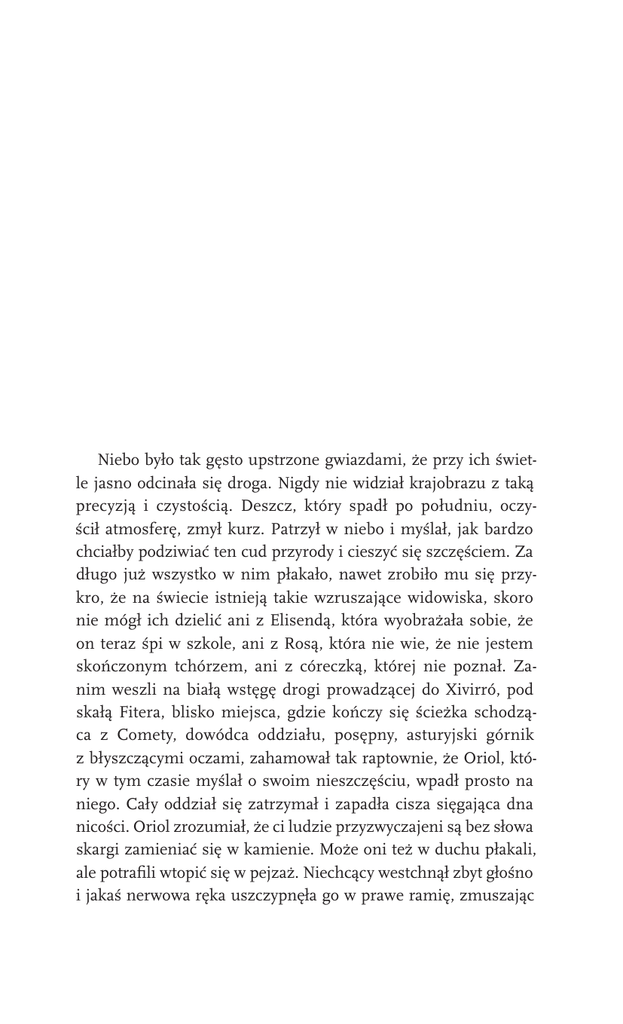 Niebo było tak gęsto upstrzone gwiazdami, że przy ich świetle jasno odcinała się droga. Nigdy nie widział krajobrazu z taką precyzją i czystością. Deszcz, który spadł po południu, oczyścił atmosferę, zmył kurz. Patrzył w niebo i myślał, jak bardzo chciałby podziwiać ten cud przyrody i cieszyć się szczęściem. Za długo już wszystko w nim płakało, nawet zrobiło mu się przykro, że na świecie istnieją takie wzruszające widowiska, skoro nie mógł ich dzielić ani z Elisendą, która wyobrażała sobie, że on teraz śpi w szkole, ani z Rosą, która nie wie, że nie jestem skończonym tchórzem, ani z córeczką, której nie poznał. Zanim weszli na białą wstęgę drogi prowadzącej do Xivirró, pod skałą Fitera, blisko miejsca, gdzie kończy się ścieżka schodząca z Comety, dowódca oddziału, posępny, asturyjski górnik z błyszczącymi oczami, zahamował tak raptownie, że Oriol, który w tym czasie myślał o swoim nieszczęściu, wpadł prosto na niego. Cały oddział się zatrzymał i zapadła cisza sięgająca dna nicości. Oriol zrozumiał, że ci ludzie przyzwyczajeni są bez słowa skargi zamieniać się w kamienie. Może oni też w duchu płakali, ale potrafili wtopić się w pejzaż. Niechcący westchnął zbyt głośno i jakaś nerwowa ręka uszczypnęła go w prawe ramię, zmuszając go wymownie, by raczej się udusił bez powietrza, niż przestał być kamieniem. Zaraz pojął, dlaczego tak ważne okazało się milczenie. Z drogi, w którą mieli wejść, dochodził dźwięk szurania stopami i wesołego pobrzękiwania dzwoneczków. Kozy? Owce? Krowy? Usłyszał zachrypnięty głos pasterza, zanim cokolwiek dało się zobaczyć. Kiedy oczy przyzwyczaiły się do nieco jaśniejszego pasma drogi, przekonał się, że wesołe owieczki to oddział żandarmerii, a baca – oficer w randze kapitana. Jak to możliwe, że patrolowali na tej wysokości? Coś musiało zmienić nastawienie dowództwa wojskowego tej strefy, bo dotychczas unikali zapuszczania się w góry Serra d’Altars i w obszary leśne, gdzie mogli ponieść dotkliwe straty, dysponując niewielkim polem manewru. Całe stado uzbrojonych po zęby owiec przedefilowało przed małym oddziałem partyzanckim, znacząco wzmocnionym przez miejscowego nauczyciela, który drżał jak osika. Głuchy, gęsty smród towarzyszył stadu niczym echo przypominające o jego przejściu. Po bardzo długiej chwili dowódca oddziału wstał. Oriol podszedł do niego: – Błądzą tak już wiele godzin. Zgubili się – wyszeptał tamtemu do ucha. – Dlaczego? – Nie wracają do Sort, maszerują nocą, bo złapała ich popołudniowa ulewa. – Skąd wiesz? – Nie czułeś smrodu mokrej wełny? Zgubili się! # Karabin maszynowy z ośmioma taśmami nabojów, po trzy granaty ręczne na głowę i osiem karabinów, powolnych, ale niezawodnych. Wracając po swoich śladach, oddział dziesięciu partyzantów zaczaił się na zakręcie drogi do Solanet. Dwaj mężczyźni wyznaczeni do obsługi karabinu maszynowego ustawili go na środku drogi i przetoczyli dwa głazy dla ochrony. Sygnałem do ataku będą dwa strzały, które unieszkodliwią bacę z juhasem, pasterza i pastuszka. Liczyli na to, że żandarmi, pozbawieni dowództwa, przestraszą się i rzucą biegiem w dół, uciekając przed kulami karabinu maszynowego i ośmiu pozostałych karabinów. Improwizacja nie pozwalała na nic więcej. Dowódca oddziału chciałby teraz mieć u boku porucznika Marcó, żeby pobłogosławił manewr taktyczny wymyślony przez nauczyciela, który okazał się nie taki głupi, na jakiego wyglądał. Najtrudniej było opanować niecierpliwe palce, żeby nie zaczęły strzelać, zanim cała kompania znajdzie się za zakrętem. Wtedy dwaj mężczyźni zeszli na drogę i zamknęli odwrót z drugiej strony. Dowódca oddziału wziął bacę na muszkę, rozległy się pierwsze strzały i karabin maszynowy zaczął pluć śmiercią. Oriol Fontelles, nauczyciel państwowy szkoły podstawowej, nie wiedział, że najlepszym sposobem planowania ataku z wojskowego punktu widzenia jest takie przewidzenie reakcji przeciwnika, by stać się jego ślepym przeznaczeniem, tak jak siostra Renata, ta upragniona. Oriol o tym nie wiedział, bo nigdy nie brał udziału w bezpośredniej akcji wojskowej, a kiedy ktoś przechodzi chrzest w boju, nie wprowadzają go w tajniki wojennego rzemiosła ale najwyraźniej mam dryg do strategii. Wyobrażasz to sobie? Uczyłem się na nauczyciela, a może zdobyłbym sławę jako... Nie mam teraz ochoty na żarty, Roso. Czy piszę do ciebie, czy do naszej córki? Nie wiem, chodzi o to, że koniecznie muszę się z tobą podzielić tym niesamowitym wrażeniem, kiedy patrzyłem, jak w sposób nieodwołalny szeregowi żandarmi, którym udało się ujść z życiem po pierwszych seriach z karabinu, uciekali na oślep w dół, strzelając do duchów ukrytych w najbliższych bukach, bo nie doczekali się instrukcji kapitana czy porucznika, co mają robić (baca padł od strzału w usta, a juhas leżał na ziemi sparaliżowany paniką), skakali po skałach, pomiędzy bukami, z nadzieją na ocalenie, bo z tamtej strony nie strzelano. A po trzydziestu krokach nadziei spadali łagodnie, z krzykiem zagłuszonym przez strzały na górze, z wysokości Forcallets, i tracili pamięć na białych głazach na dnie wąwozu, jakby wiedzieli, że to te same głazy, które Pere Serrallac obrabia z bezgraniczną cierpliwością, wykuwając z nich nagrobki. Jakby im się spieszyło do zamknięcia cyklu. Jakby już chcieli się ogrzać w lodowatym grobie. Oriol strzelał z mauzera, pewien, że zabił dwóch czy trzech ludzi. Trzech. Bez żadnych wyrzutów sumienia, bo widział przed sobą wielkie oczy małego Ventury, który patrzył na niego w ratuszu, chyba z nadzieją, że nauczyciel będzie miał więcej ikry i że go ocali. Czuł też spanikowany oddech wieśniaka z Montardit, latarnika, ale najchętniej zobaczyłby ter