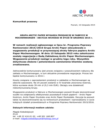 Komunikat prasowy Poznań, 16 listopada 2015 GRUPA ARCTIC PAPER WYGASZA PRODUKCJĘ W FABRYCE W MOCHENWANGEN - DECYZJA WCHODZI W ŻYCIE W GRUDNIU 2015 r. W ramach realizacji ogłoszonego w lipcu br. Programu Poprawy Rentowności 2015/2016 Grupa Arctic Paper zdecydowała o wygaszeniu produkcji w przynoszącej straty fabryce papieru Arctic Paper Mochenwangen. W dniu 15 listopada 2015 roku zakończone zostały negocjacje z Radą Zakładową Arctic Paper Mochenwangen. Wygaszenie produkcji nastąpi w grudniu tego roku. Wszystkie dotychczas złożone i potwierdzone zamówienia klientów zostaną zrealizowane. Jednocześnie kontynuowany jest proces związany z poszukiwaniem nabywcy dla zakładu w Mochenwangen, w tym aktualnie prowadzone negocjacje. Proces ten będzie kontynuowany w 2016 r. Koszty związane z zaprzestaniem produkcji w zakładzie w Mochenwangen są obecnie szacowane. Na ich poczet zostanie w IV kwartale utworzona rezerwa, która wyniesie około 39 mln zł (9,3 mln EUR). Obciąży ona działalność niekontynuowaną Grupy. Wygaszenie produkcji w fabryce w Mochenwangen pozwoli Grupie skoncentrować wysiłki na zwiększeniu efektywności pozostałych trzech papierni - Arctic Paper Kostrzyn, Arctic Paper Grycksbo oraz Arctic Paper Munkedals. Decyzja ta pozwoli także na skoncentrowanie się na rentownych produktach i wprowadzaniu w życie kolejnych działań przewidzianych w Programie Poprawy Rentowności 2015/2016. Dalszych informacji mediom udziela: Magda Kołodziejczyk M+G tel. +48 22 416 01 02, +48 501 168 807 e-mail: [email protected] 1 ARCTIC PAPER S.A. zalicza się do czołowych europejskich producentów wysokogatunkowego papieru graficznego. Spółka produkuje powlekany i niepowlekany papier bezdrzewny oraz niepowlekany papier drzewny dla wymagających klientów, wśród których są drukarnie, wydawnictwa książek i prasy, agencje reklamowe, dystrybutorzy papieru i firmy opakowaniowe. Portfolio produktowe obejmuje wiele znanych marek, m.in. Amber, AP-Tec, Arctic, G-Print, Munken, L-Print i Pamo. Spółka produkuje swoje wyroby w czterech papierniach: Arctic Arctic Arctic Arctic Paper Paper Paper Paper Munkedals (Szwecja) Grycksbo (Szwecja) Kostrzyn (Polska) Mochenwangen (Niemcy) Łączne zdolności produkcyjne Spółki to ok. 800.000 ton papieru rocznie. Moce produkcyjne zakładu Arctic Paper Kostrzyn sięgają 275.000 ton rocznie. Zakład produkuje niepowlekany papier bezdrzewny służący do druku broszur, formularzy, książek i kopert. Papiernia Arctic Paper Grycksbo może wyprodukować 260.000 ton papieru rocznie. Wytwarza papier powlekany stosowany do druku czasopism, materiałów na potrzeby marketingu bezpośredniego, książek, plakatów i map, a także papier opakowaniowy. Moce produkcyjne papierni Arctic Paper Munkedals to 160.000 ton rocznie. Zakład wytwarza głównie wysokogatunkowe papiery niepowlekane bezdrzewne przeznaczone do produkcji książek oraz do celów projektowych i reklamowych. Roczne moce produkcyjne zakładu Arctic Paper Mochenwangen wynoszą 95.000 ton papieru i 55.000 ton ścieru. Papiernia wytwarza głównie niepowlekany papier drzewny do druku książek oraz papiery specjalistyczne, np. papier podkładowy do podłóg i papier do produkcji tapet. Arctic Paper S.A. jest głównym właścicielem spółki Rottneros AB, posiadającej dwie celulozownie o łącznej zdolności produkcyjnej ok. 400.000 ton masy celulozowej rocznie. Celulozownia w Vallvik, o zdolności produkcyjnej 240.000 ton rocznie, wytwarza dwa rodzaje długowłóknistej celulozy siarczanowej. Celulozownia w Rottneros, o zdolności produkcyjnej 170.000 ton rocznie, produkuje przede wszystkim dwa rodzaje masy włóknistej mechanicznej: ścier i masę chemotermomechaniczną (CTMP). Ważnym elementem struktury Spółki, wyróżniającym Arctic Paper na tle konkurencji, jest sieć biur sprzedaży i centrów dystrybucji odpowiedzialnych za wprowadzanie na rynek i zarządzanie dostawami produktów Spółki. Arctic Paper S.A. posiada obecnie 14 biur sprzedaży rozmieszczonych w całej Europie i zapewniających dotarcie na wszystkie rynki europejskie. 2 Spółka zatrudnia ok. 1.450 pracowników (liczba ta nie obejmuje pracowników Rottneros AB), a jej główna siedziba znajduje się w Polsce. Największym udziałowcem Arctic Paper S.A. jest szwedzka firma Nemus Holding AB. Od października 2009 r. akcje Arctic Paper S.A. notowane są na Giełdzie Papierów Wartościowych w Warszawie, a od grudnia 2012 r. również na rynku NASDAQ Stockholm w Sztokholmie. Więcej informacji na www.arcticpaper.com 3